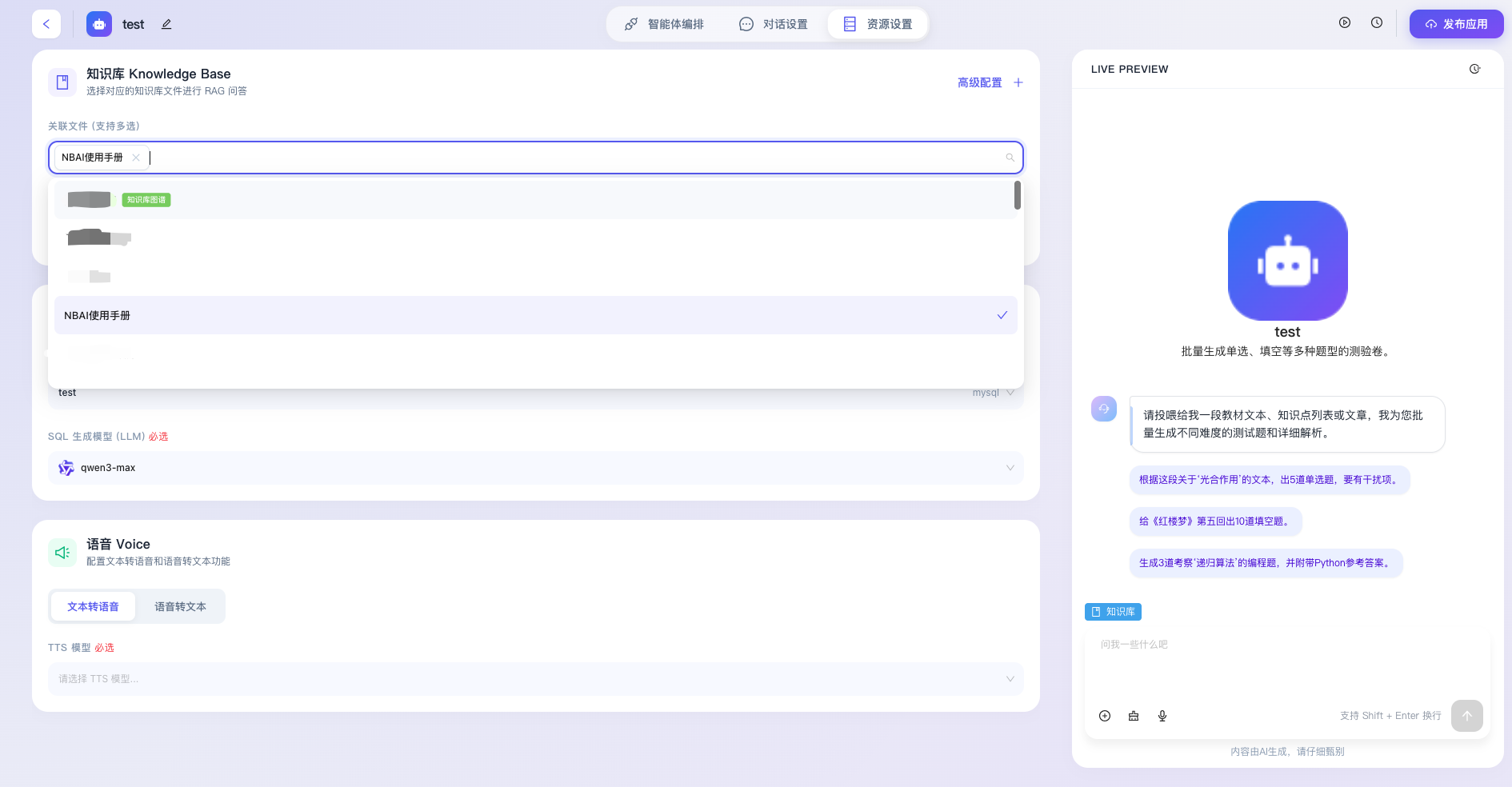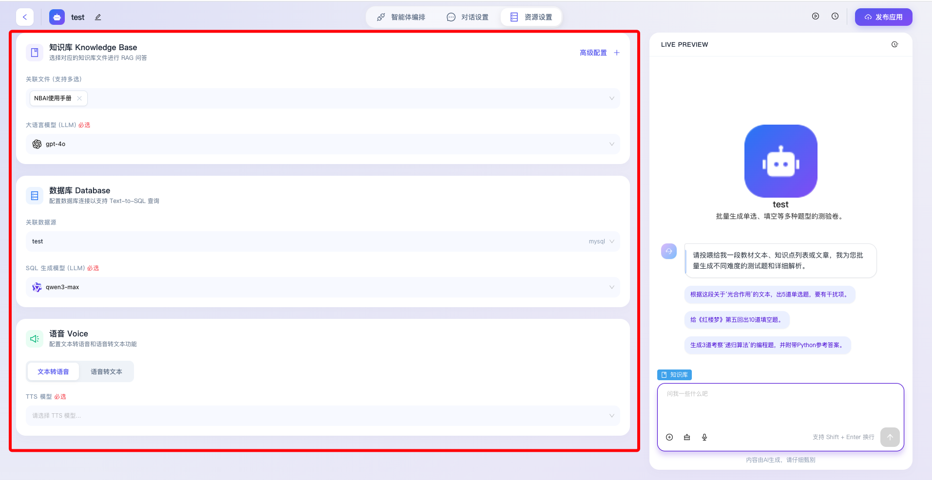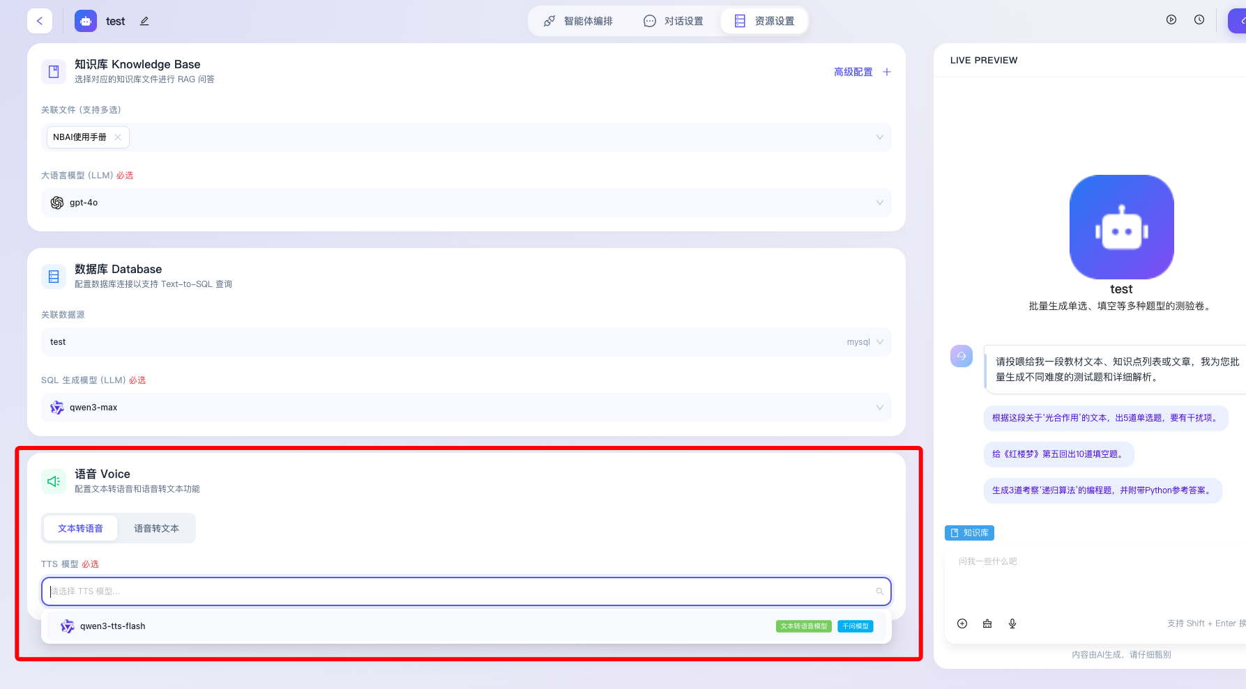 “资源设置”是智能体应用构建过程中至关重要的底层能力扩展模块,该模块主要用于为智能体挂载外部数据源、配置专属的大语言模型(LLM)以及启用多模态交互能力。通过科学合理地分配和配置这些底层资源,开发者能够打破大模型预训练数据的认知局限,赋予智能体处理特定领域知识、动态查询业务数据库以及进行拟真语音交互的高阶能力,从而全方位提升智能体的业务适用性与智能化水平。