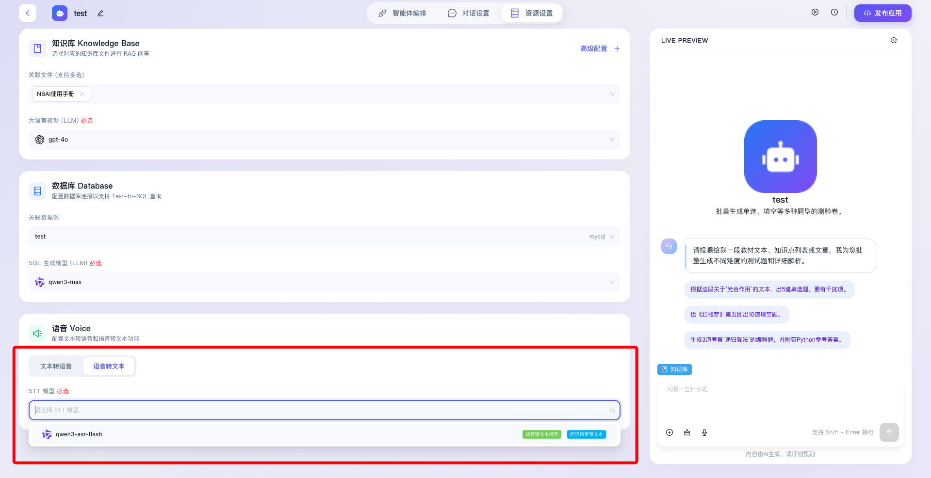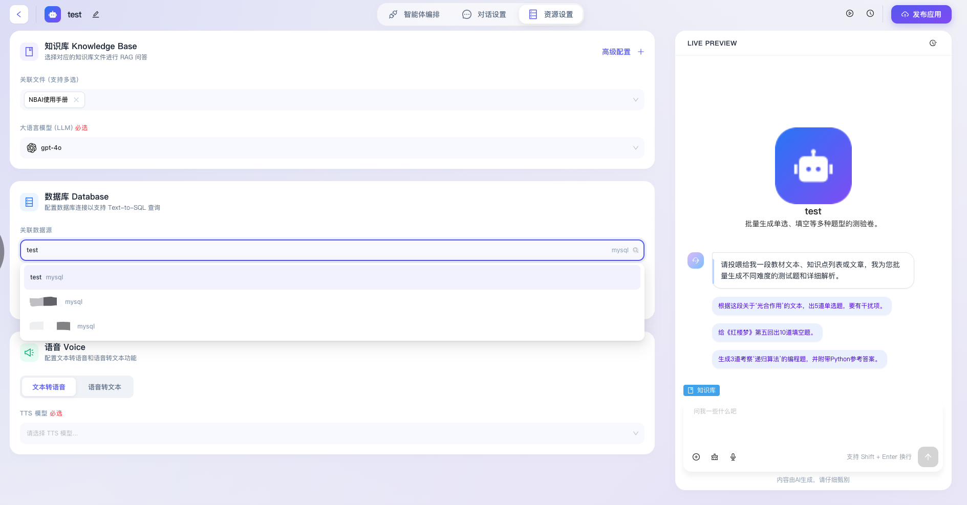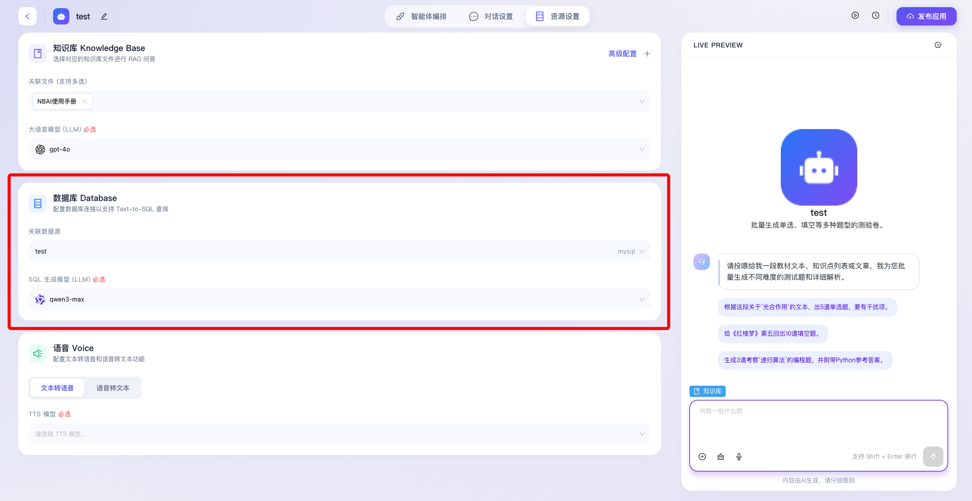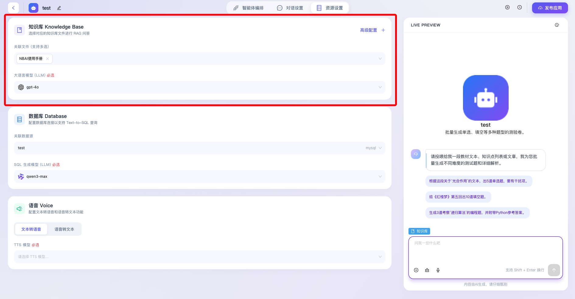 “资源设置”是智能体应用构建过程中至关重要的底层能力扩展模块,该模块主要用于为智能体挂载外部数据源、配置专属的大语言模型(LLM)以及启用多模态交互能力。通过科学合理地分配和配置这些底层资源,开发者能够打破大模型预训练数据的认知局限,赋予智能体处理特定领域知识、动态查询业务数据库以及进行拟真语音交互的高阶能力,从而全方位提升智能体的业务适用性与智能化水平。