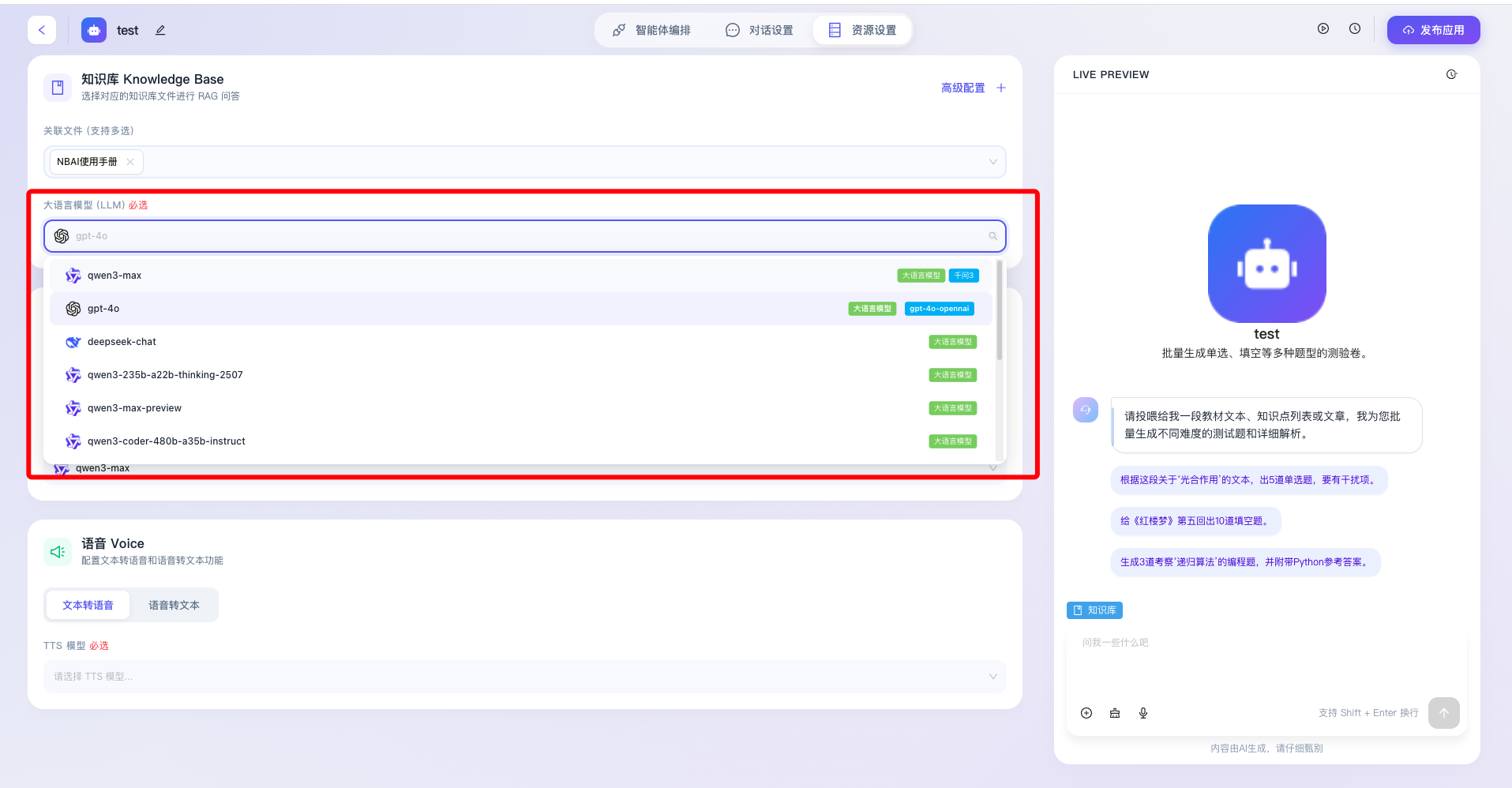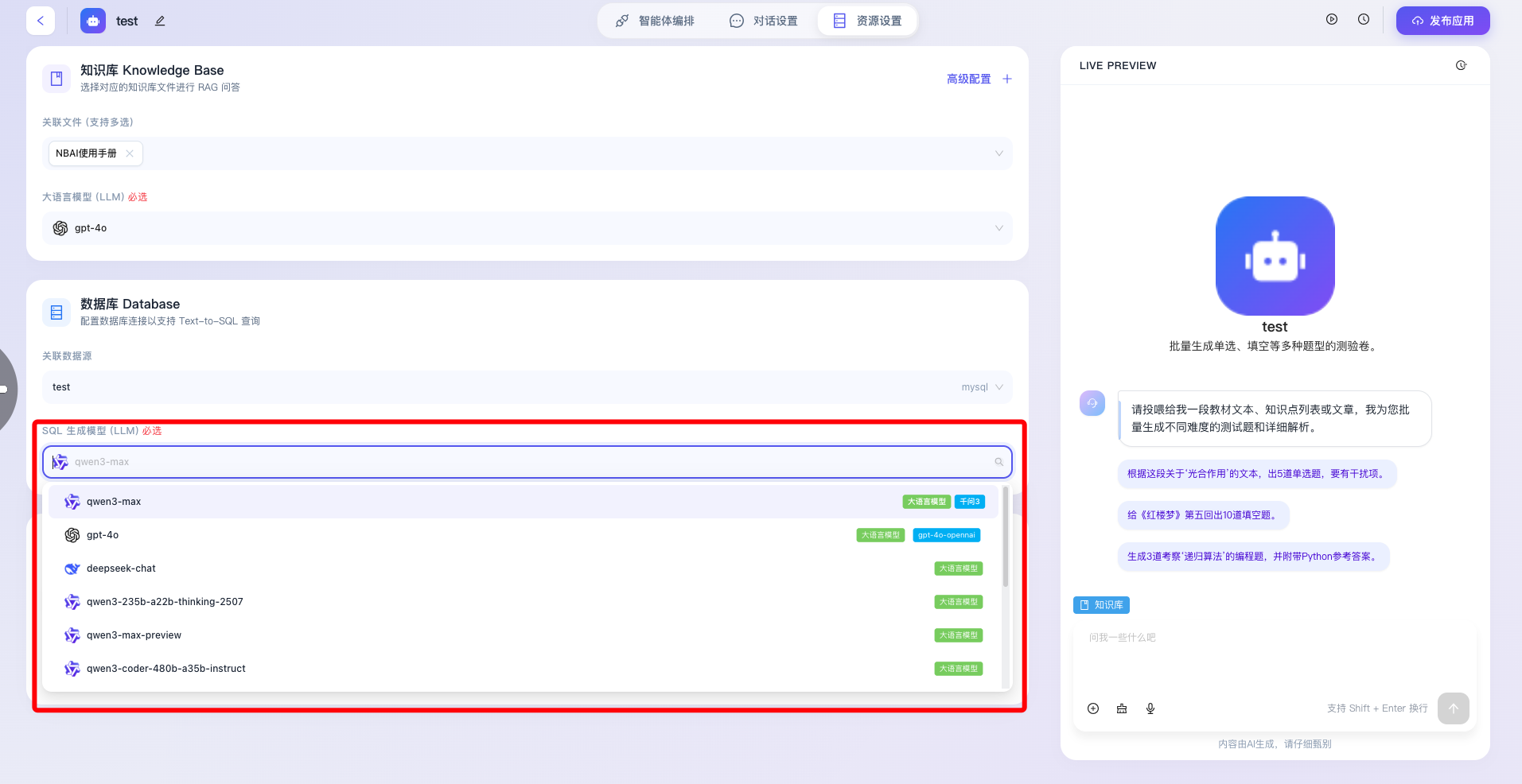 - 大语言模型(LLM)必选:用于指定负责处理知识库检索召回结果并生成最终自然语言回复的核心推理模型(如图中当前选中的 qwen3-max)。作为归纳与总结的引擎,该选项为系统强制必填项,开发者可根据具体业务对推理逻辑严密性和响应速度的考量,灵活切换底层大模型基座。