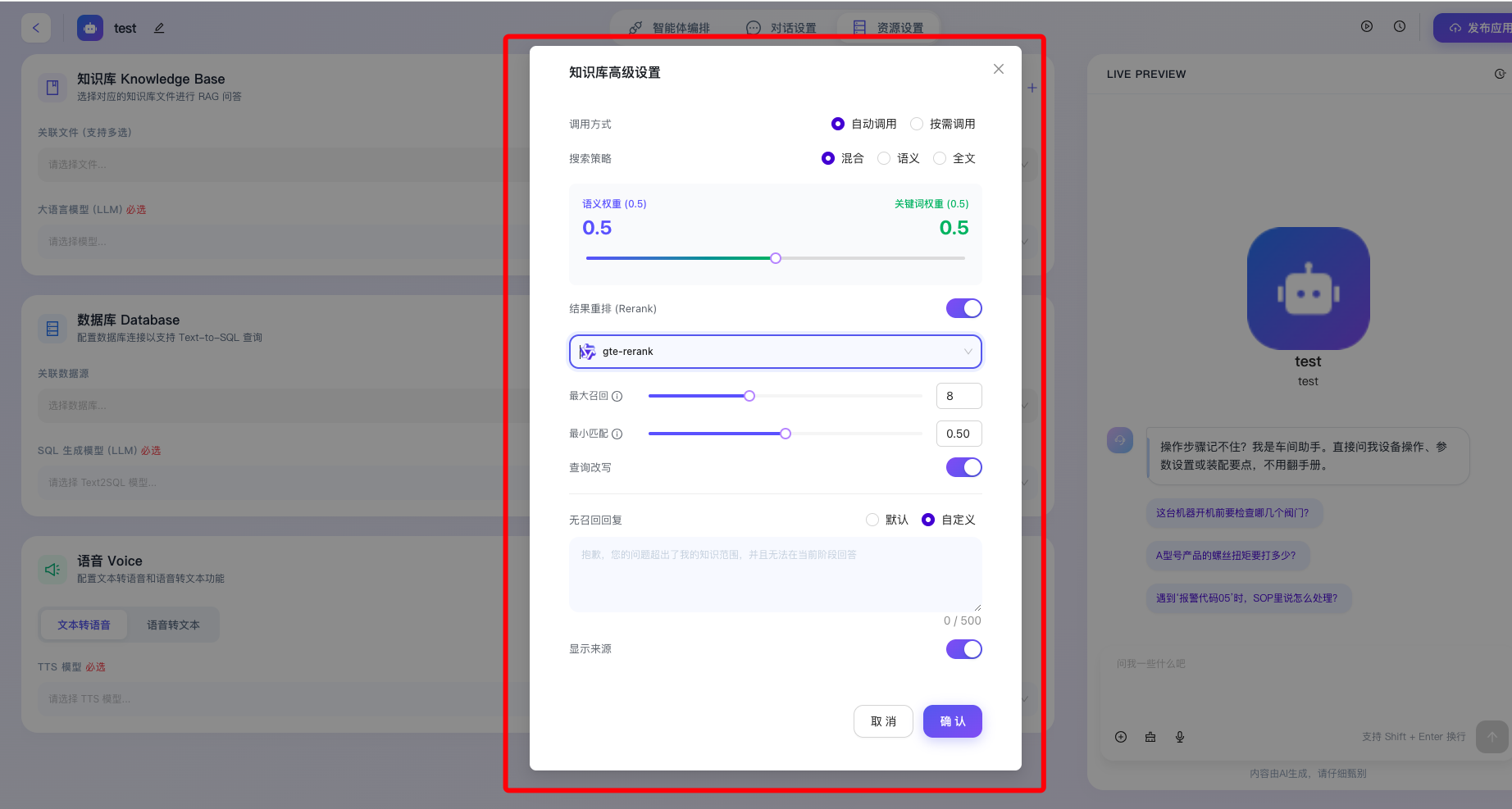 通过配置“高级设置”,开发者能够细颗粒度地掌控从用户查询解析、多路召回引擎、结果精排到最终输出兜底形态的每一个关键环节,从而在算力成本控制的前提下,显著提升智能体回答的命中率、相关性以及终端用户的信赖感。