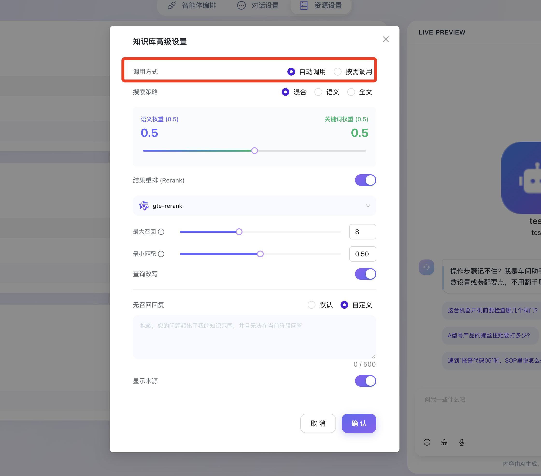 - 调用方式:用于设定知识库被激活的触发机制。