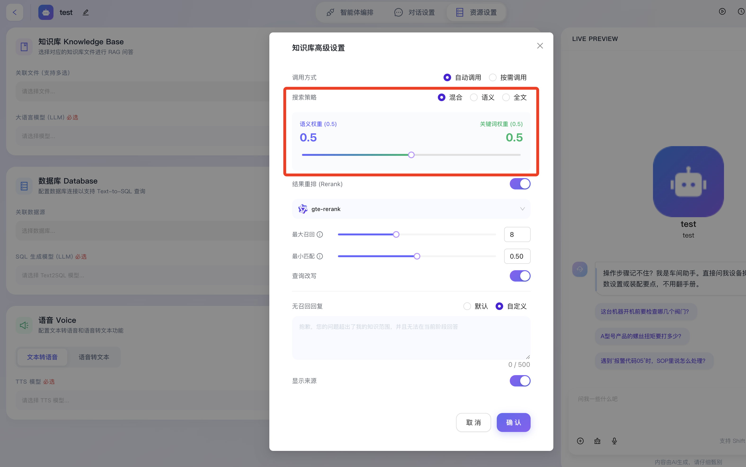 - 当选中“混合”策略时,系统提供可视化的滑块组件,允许开发者自定义“语义权重”与“关键词权重”的融合比例(如图中系统默认设定为各占 0.5)。开发者可根据私有知识库的具体文本分布特征,灵活向某一种检索方式倾斜。