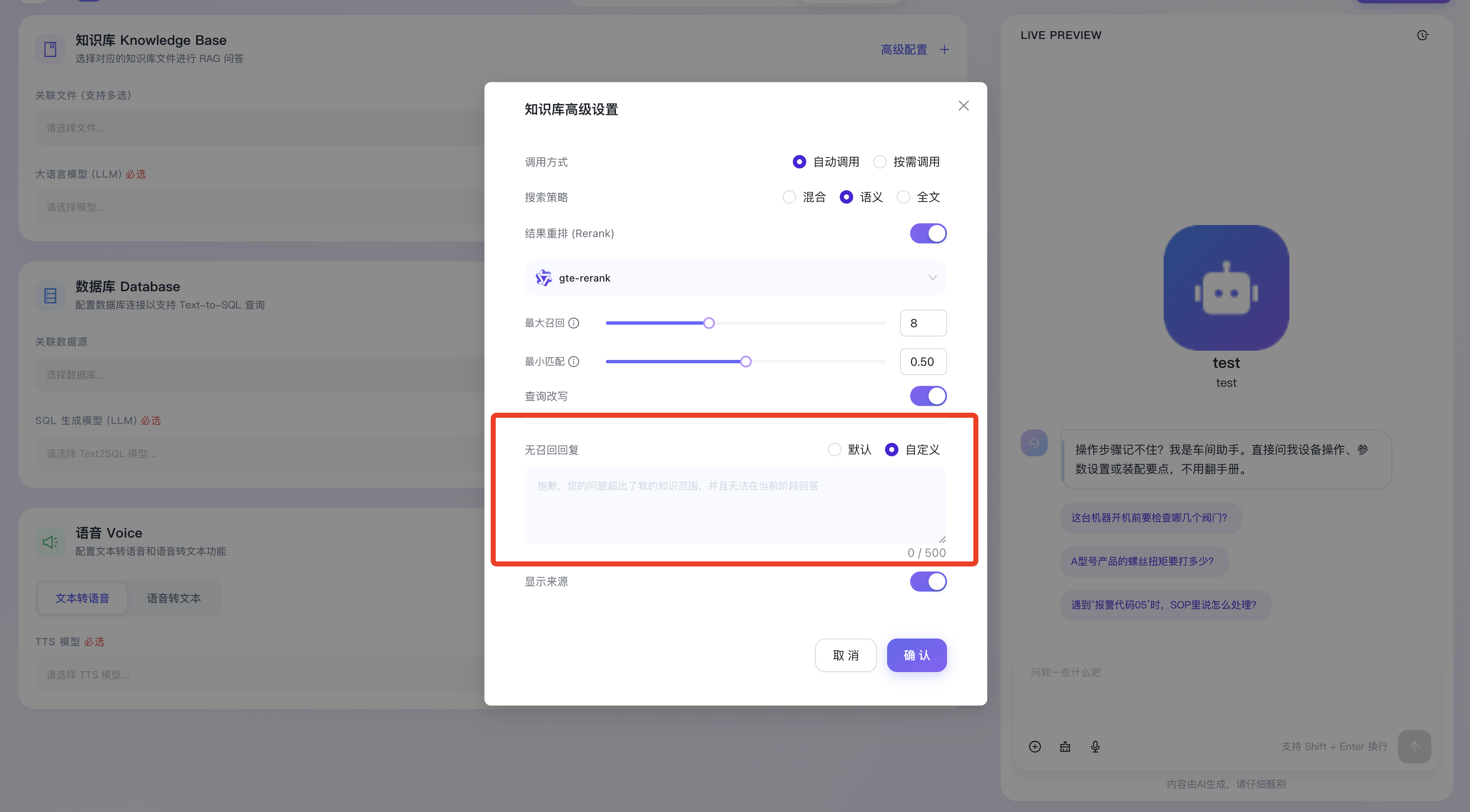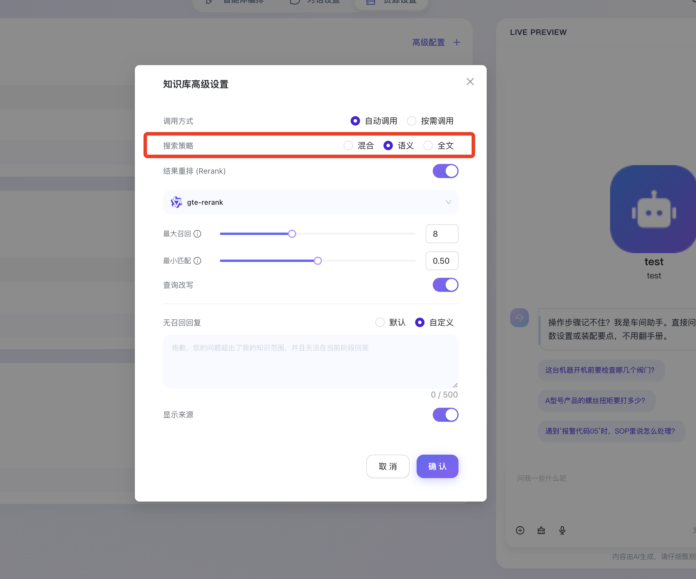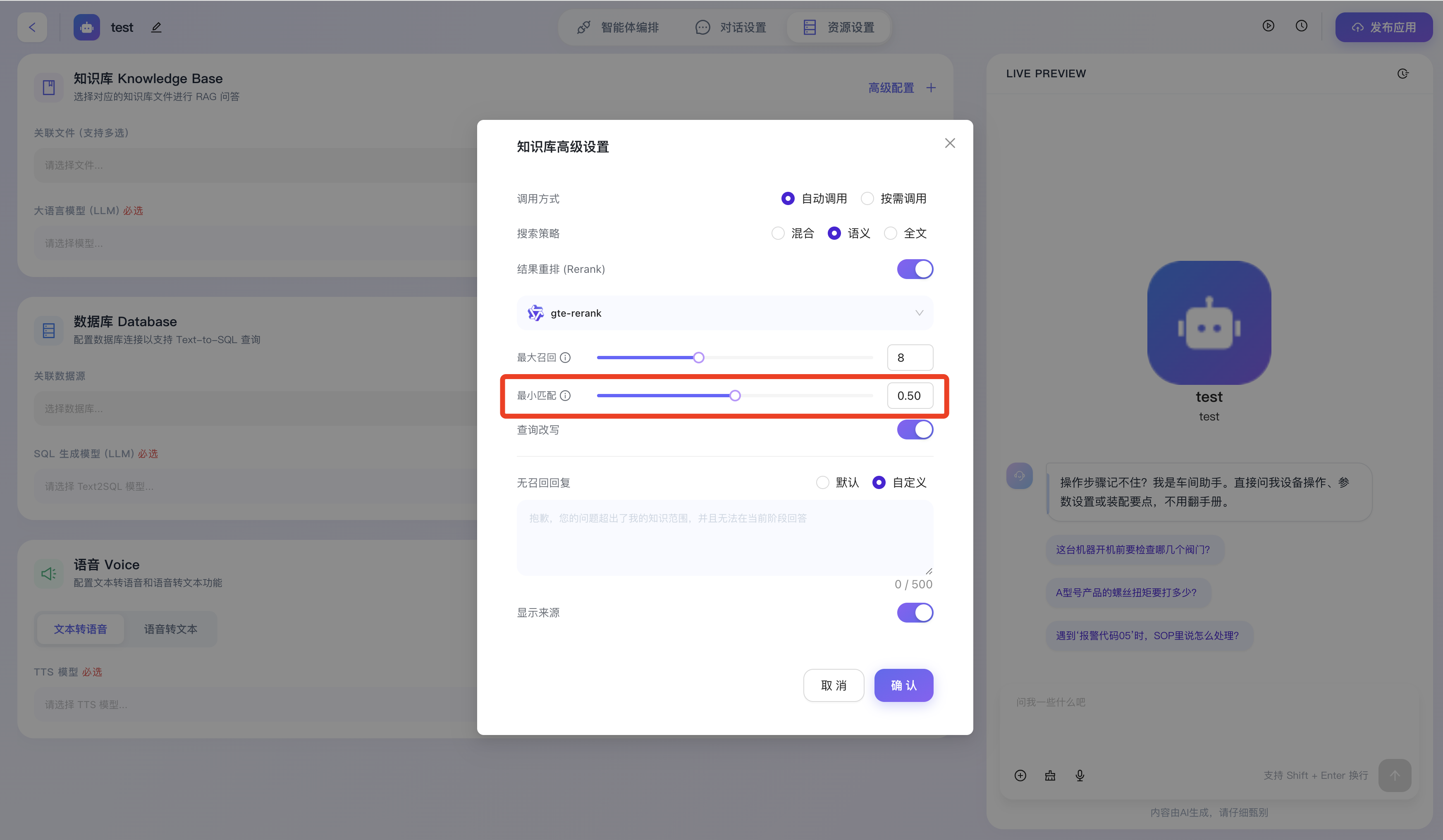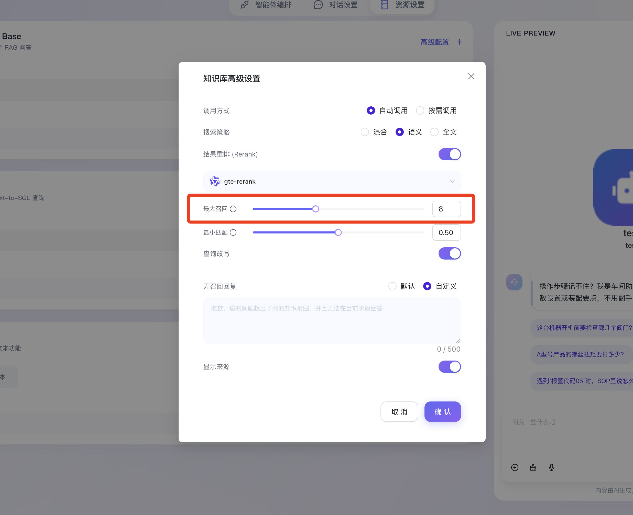 - 最小匹配 (相似度阈值):用于设定召回内容的最低相关性得分门槛。低于该设定的文档切片将被系统判定为“噪音”并直接丢弃,确保输送给大模型的上下文“宁缺毋滥”。