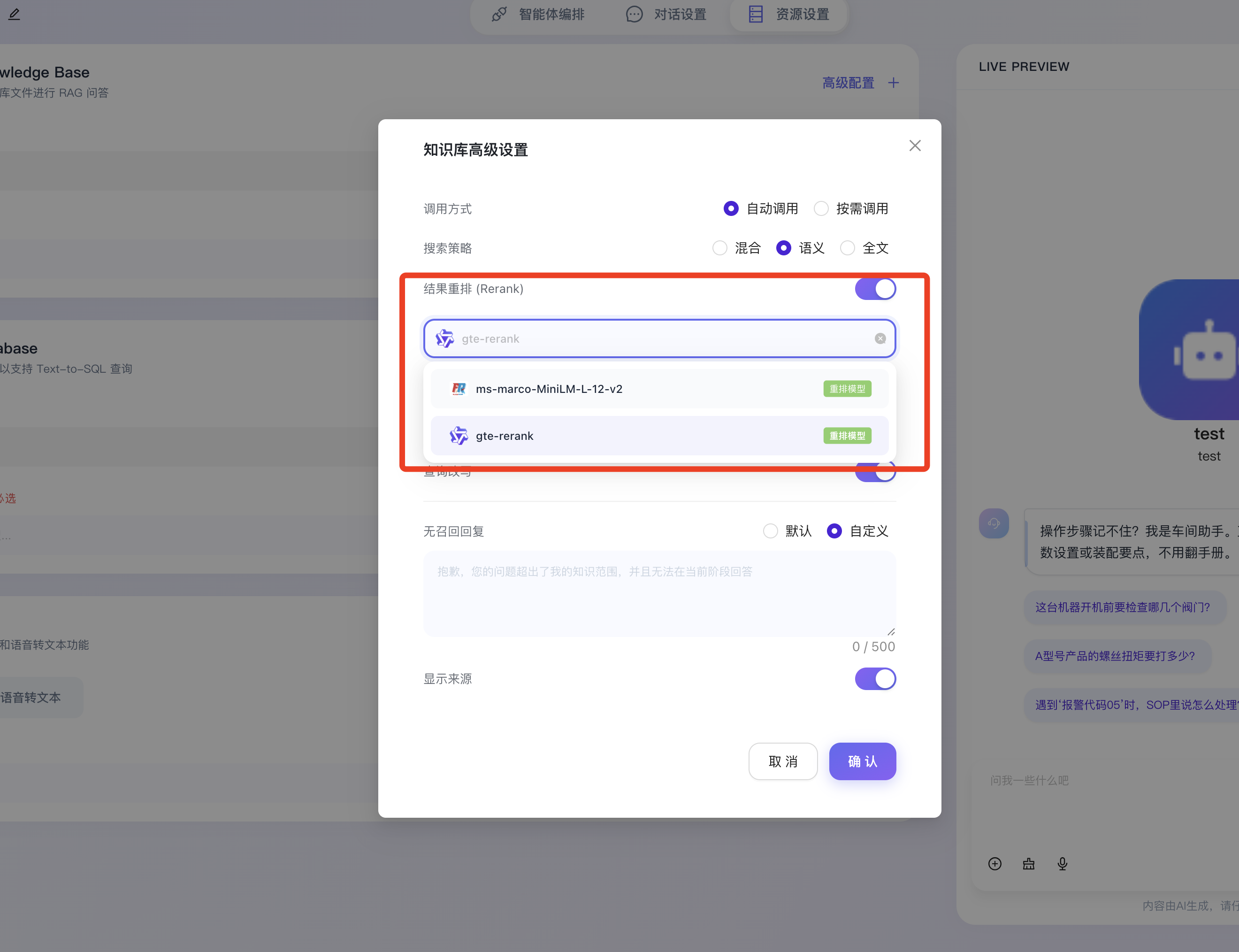 - 结果重排 (Rerank):开启后,支持指定专门的重排序交叉编码器模型(如图中选中的 gte-rerank)。重排序模型会对初步召回的多个文档切片进行更加细致的二次交叉计算与重新打分,有效解决初次粗排检索可能存在的排序不准问题,大幅提升 Top-K 结果与用户真实意图的契合度。