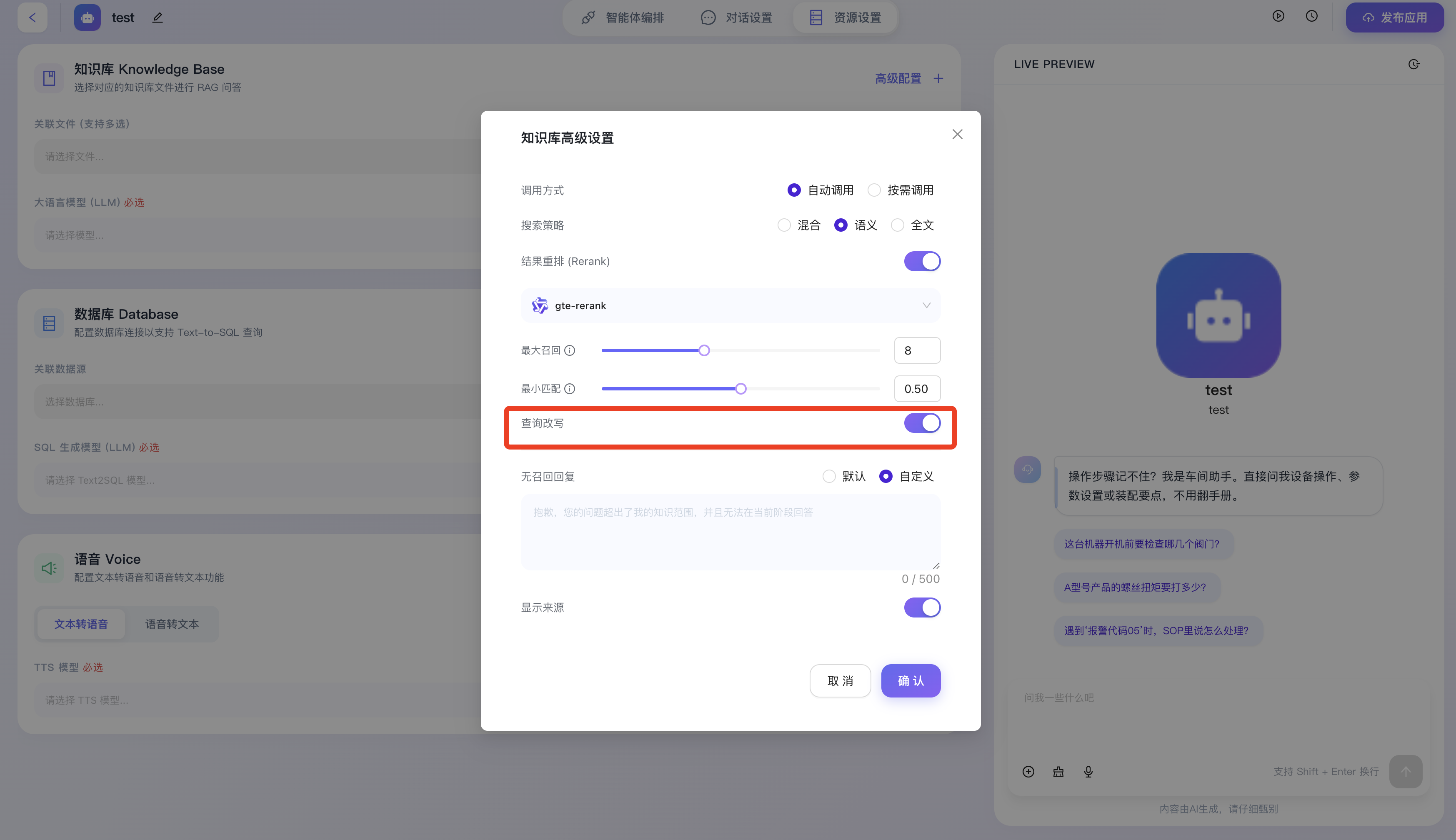 - 查询改写:开启后,系统将在实际发起数据库检索前,自动利用大语言模型对用户的原始提问进行意图补全、关键词扩写或纠错重组,能极大程度缓解因用户输入过于口语化、存在错别字或缺乏上下文导致的检索失败问题。