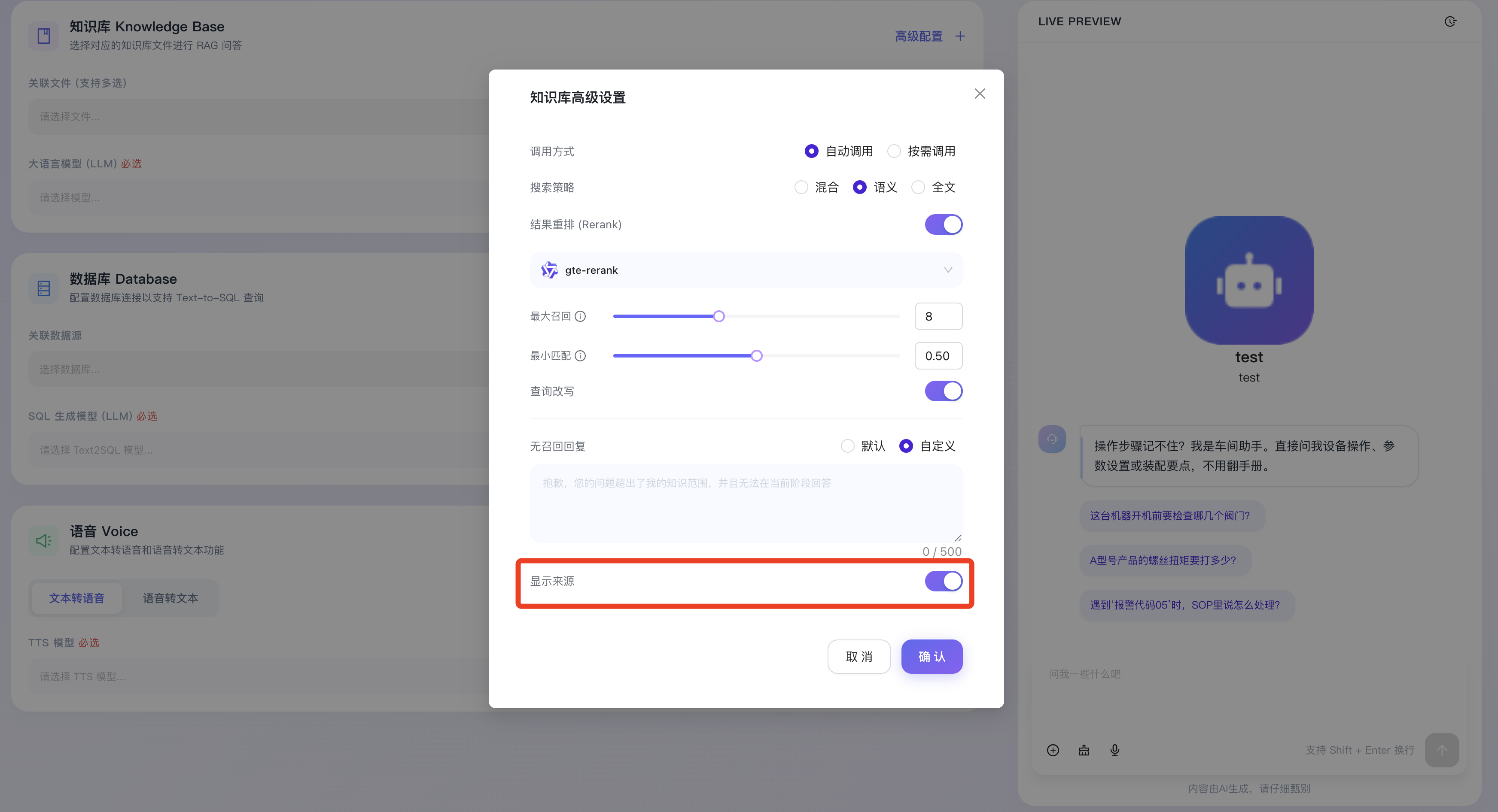 - 显示来源:开启后,智能体在生成基于知识库的自然语言回答时,将在前端交互界面自动附带引用的原文片段或参考文档来源标注。这使得终端用户能够随时点击追溯,大幅增强了 AI 回答的权威性与用户的信任感。