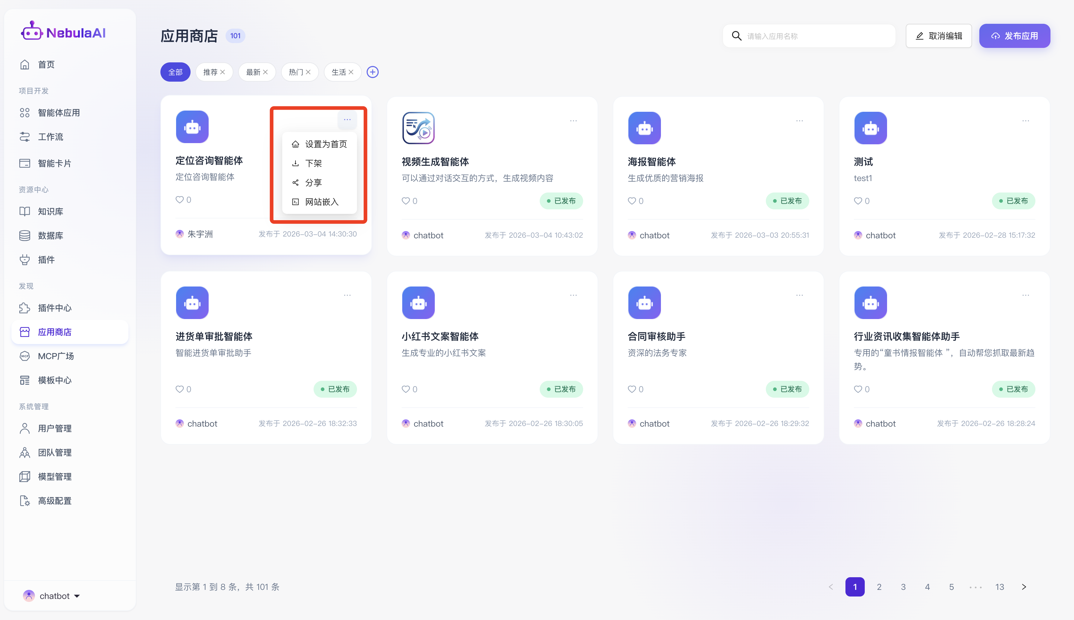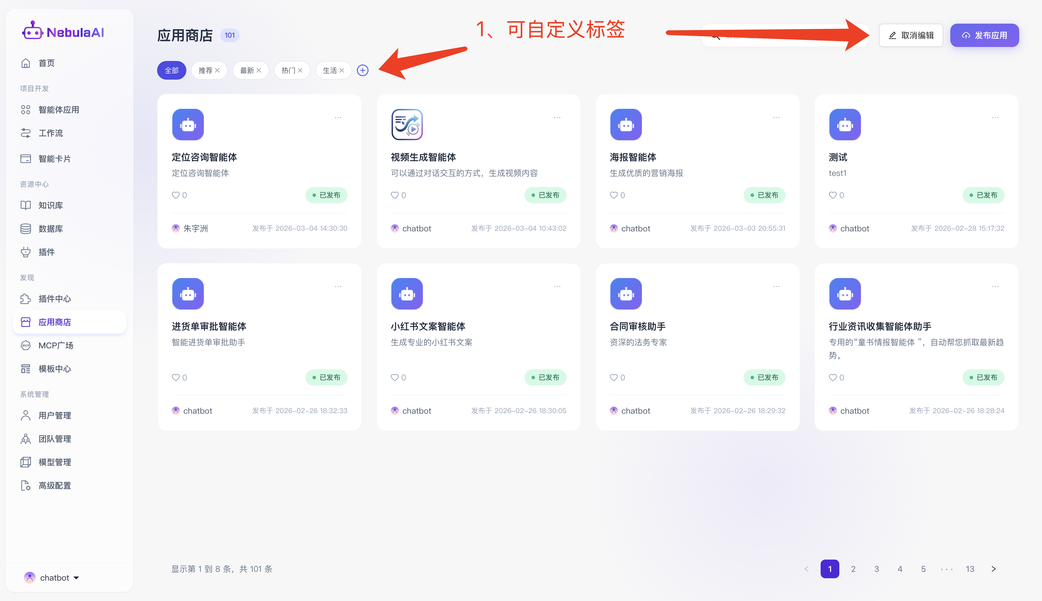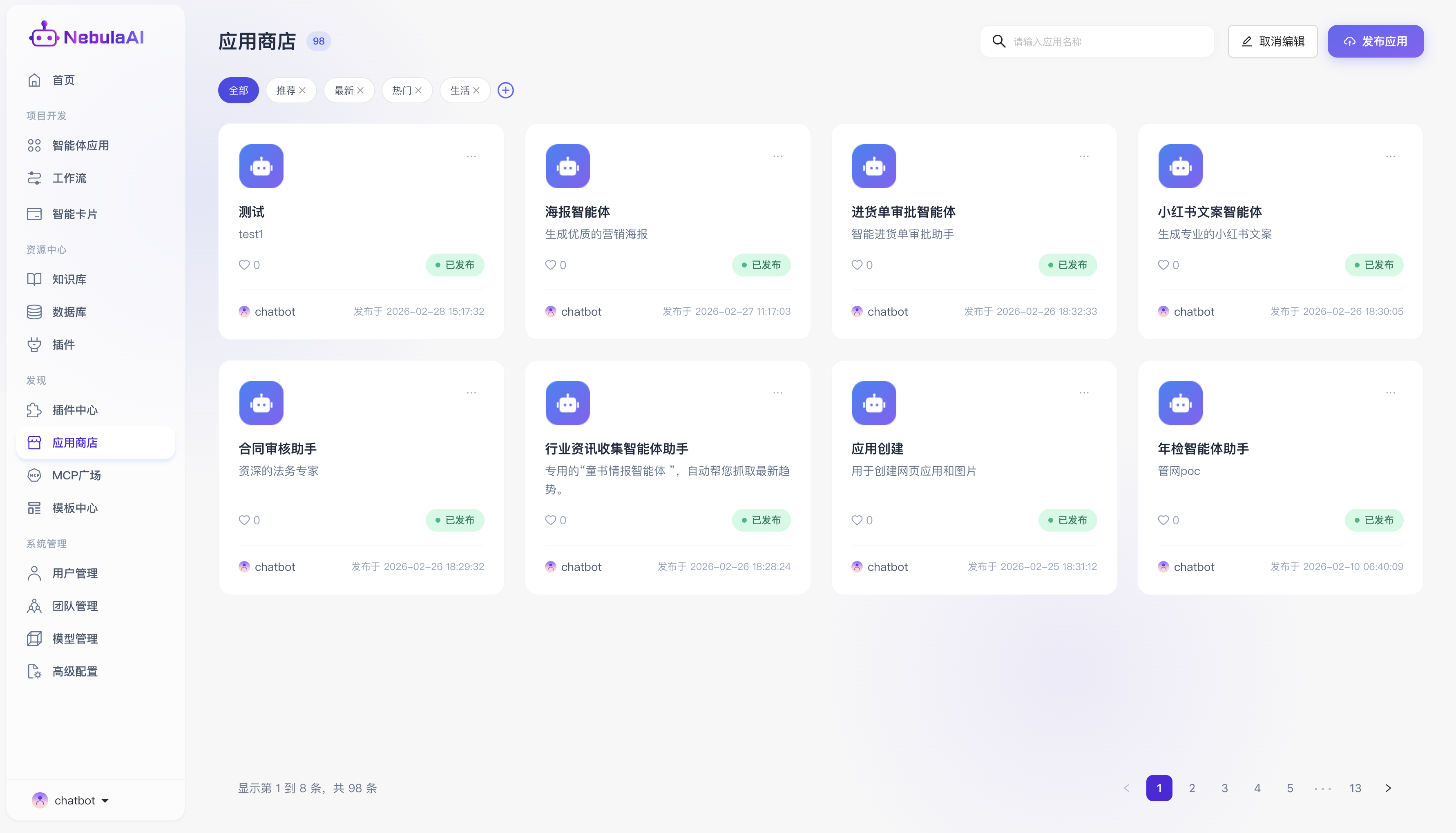 “应用商店”是 NebulaAI 平台为开发者与终端用户打造的集智能体发现、共享、分发与体验于一体的核心生态枢纽,在企业级复杂的业务推演与多场景提效诉求下,开发者可通过标准化的能力,将深度定制、调优完毕的智能体上架至此。
