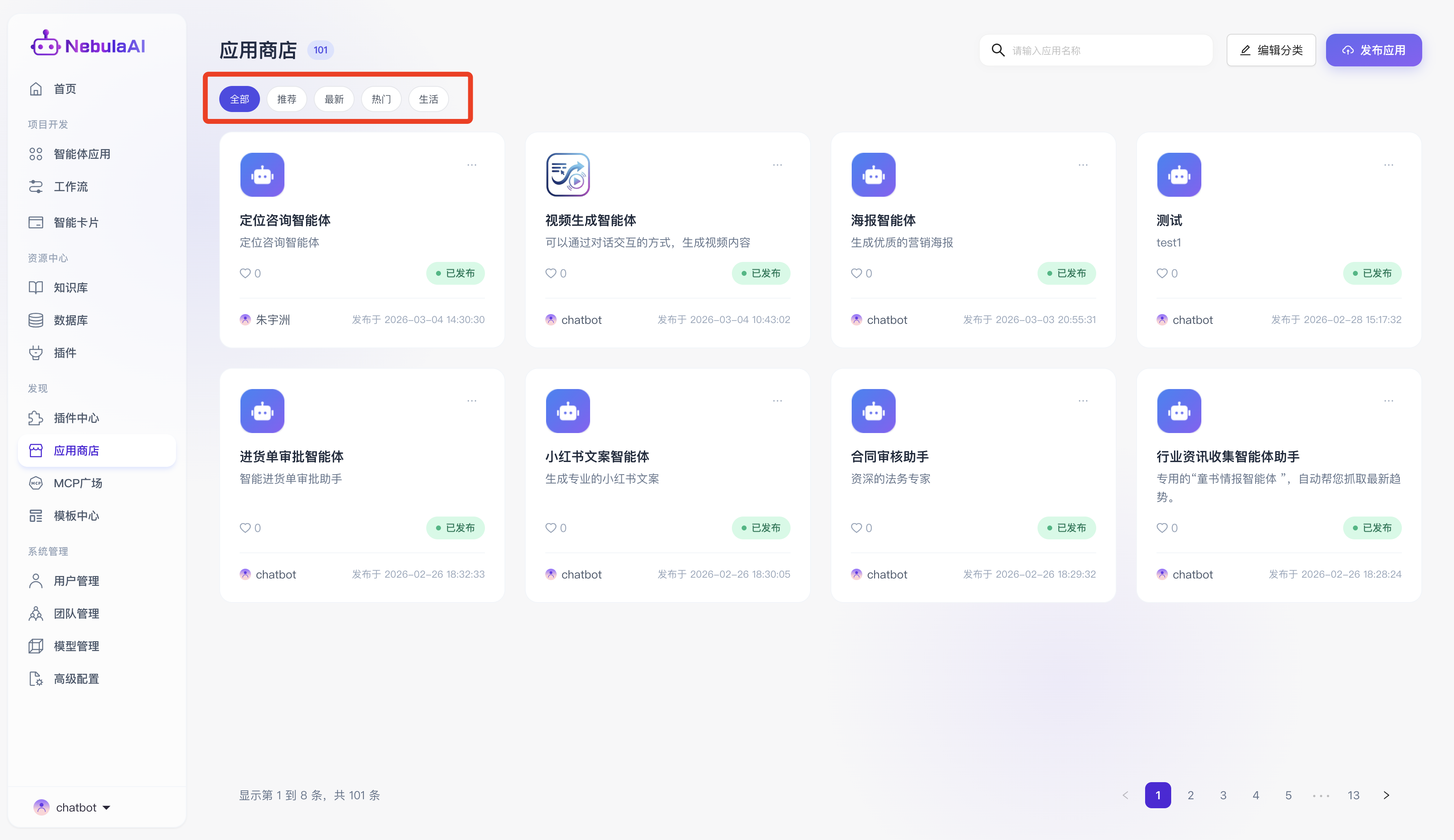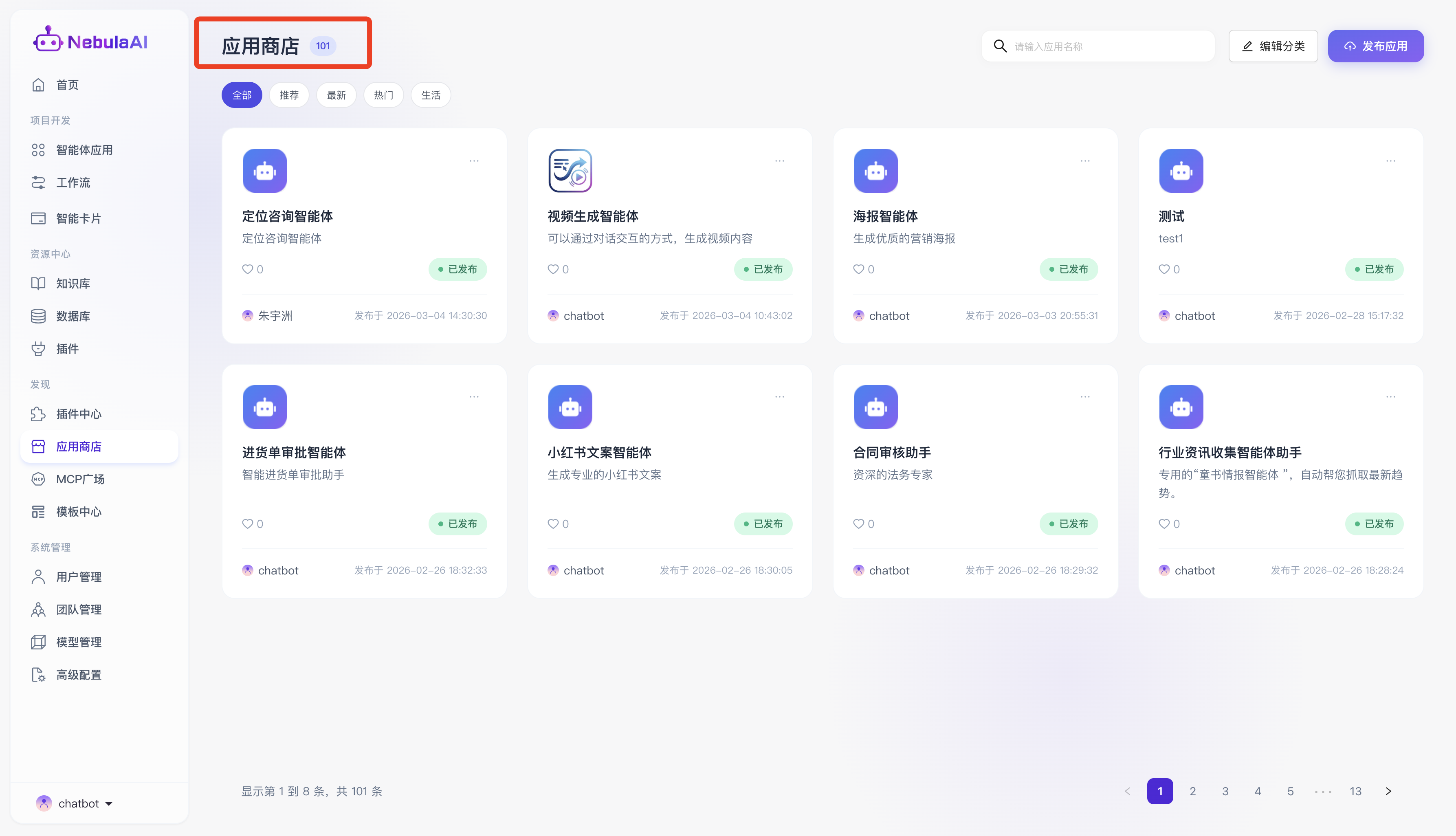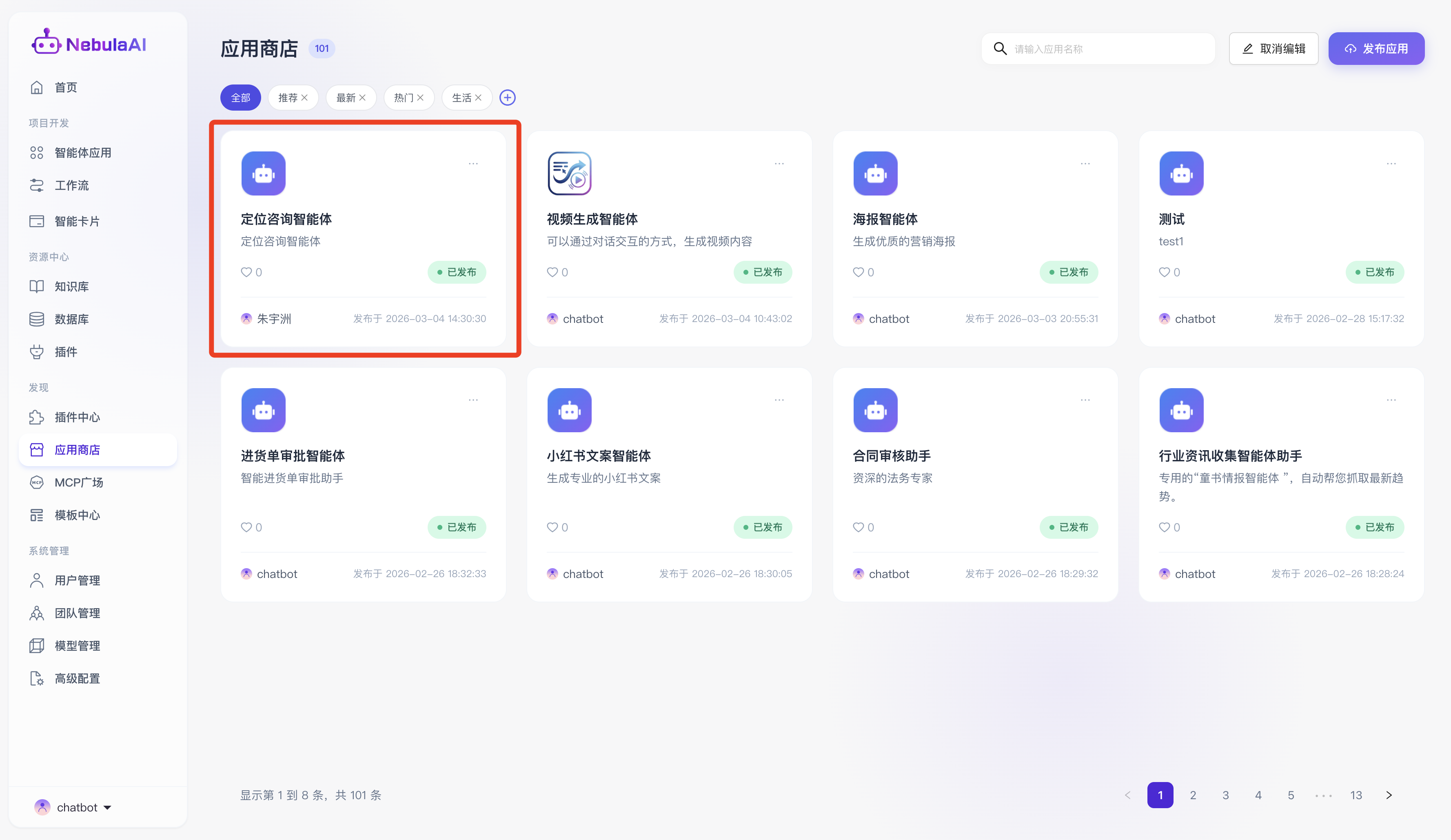 “应用商店”是 NebulaAI 平台为开发者与终端用户打造的集智能体发现、共享、分发与体验于一体的核心生态枢纽,在企业级复杂的业务推演与多场景提效诉求下,开发者可通过标准化的能力,将深度定制、调优完毕的智能体上架至此。
