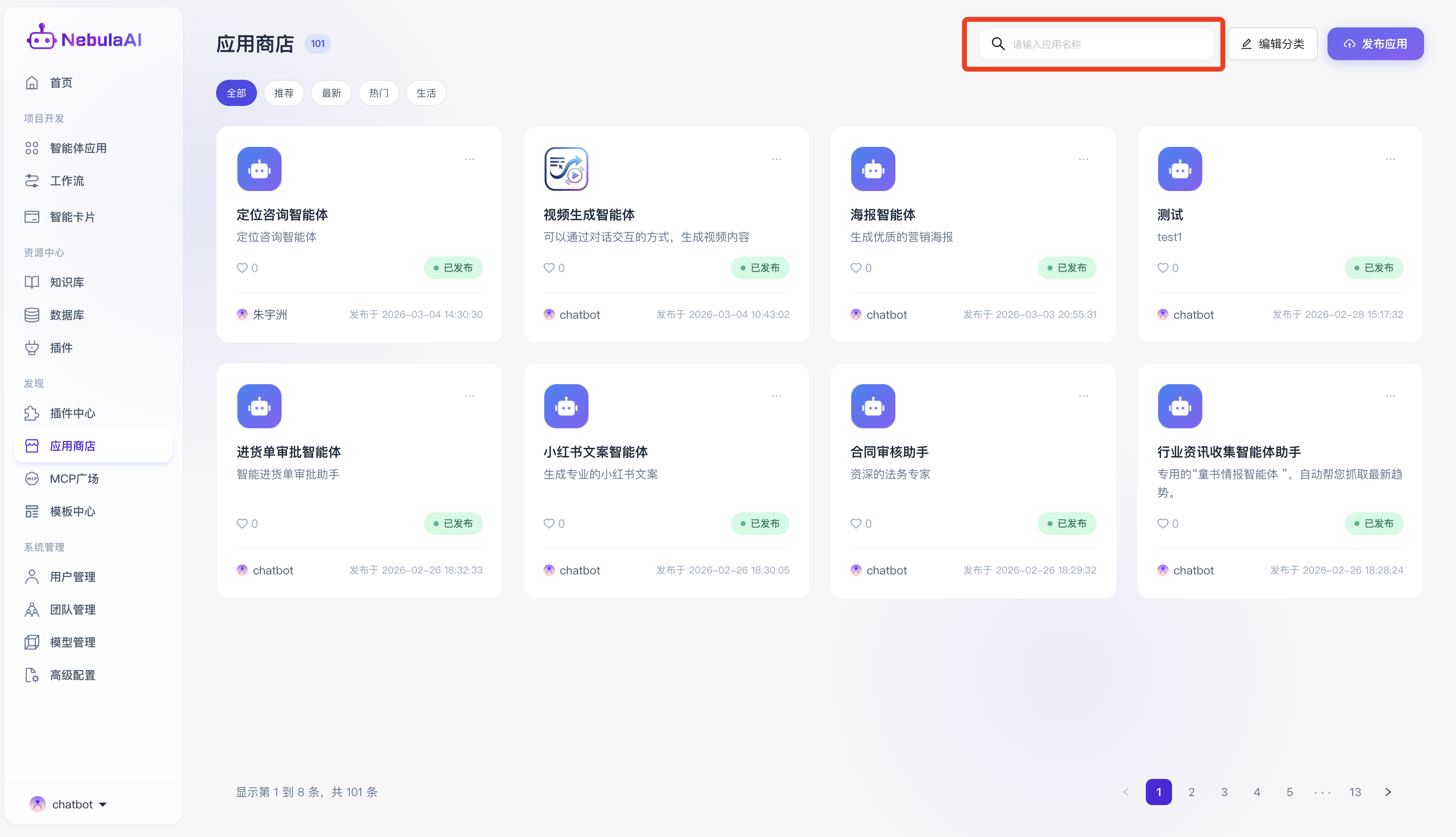 - 模糊搜索:支持通过输入应用名称进行模糊或精确检索,帮助用户在海量应用中快速定位目标智能体。