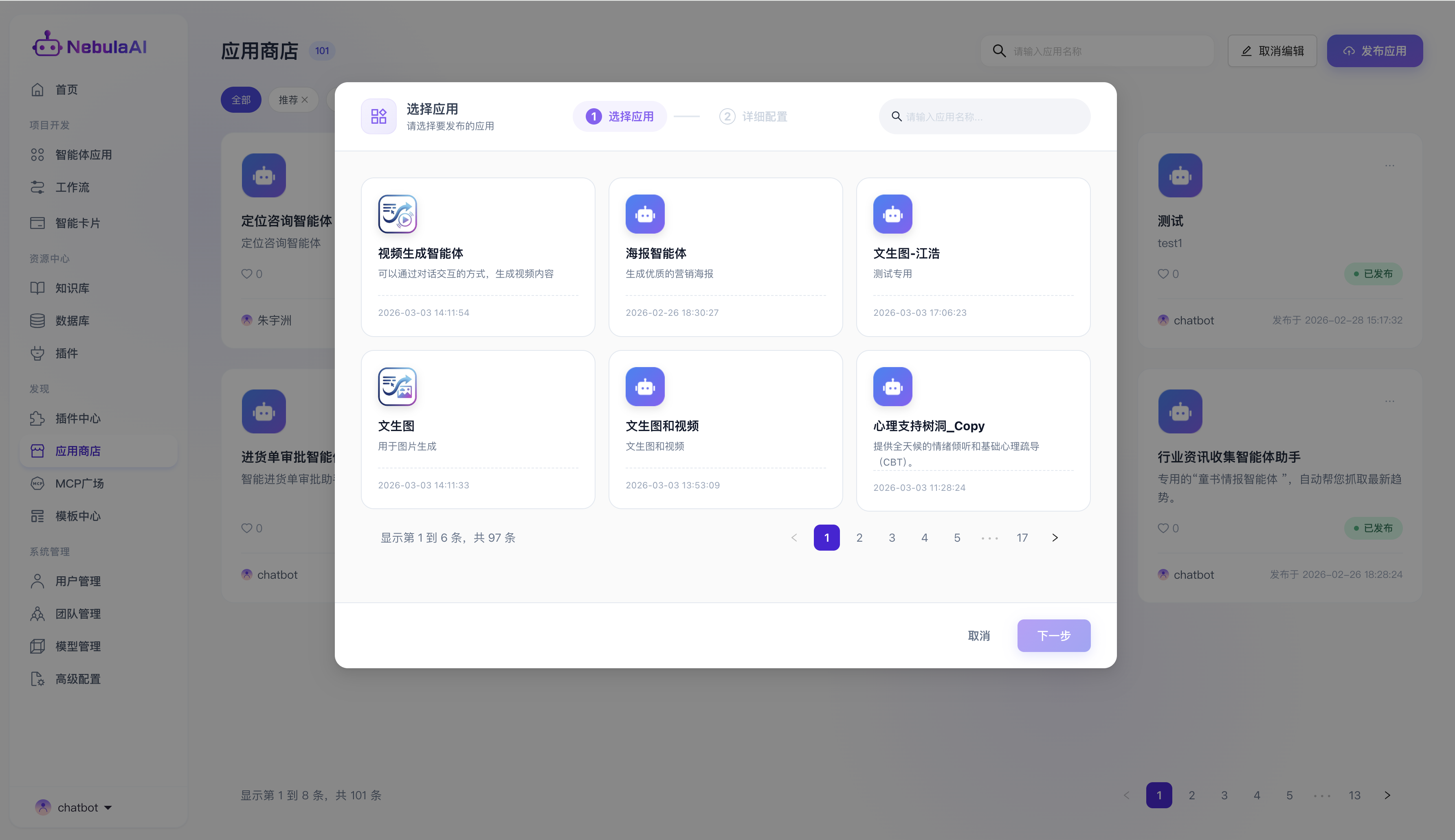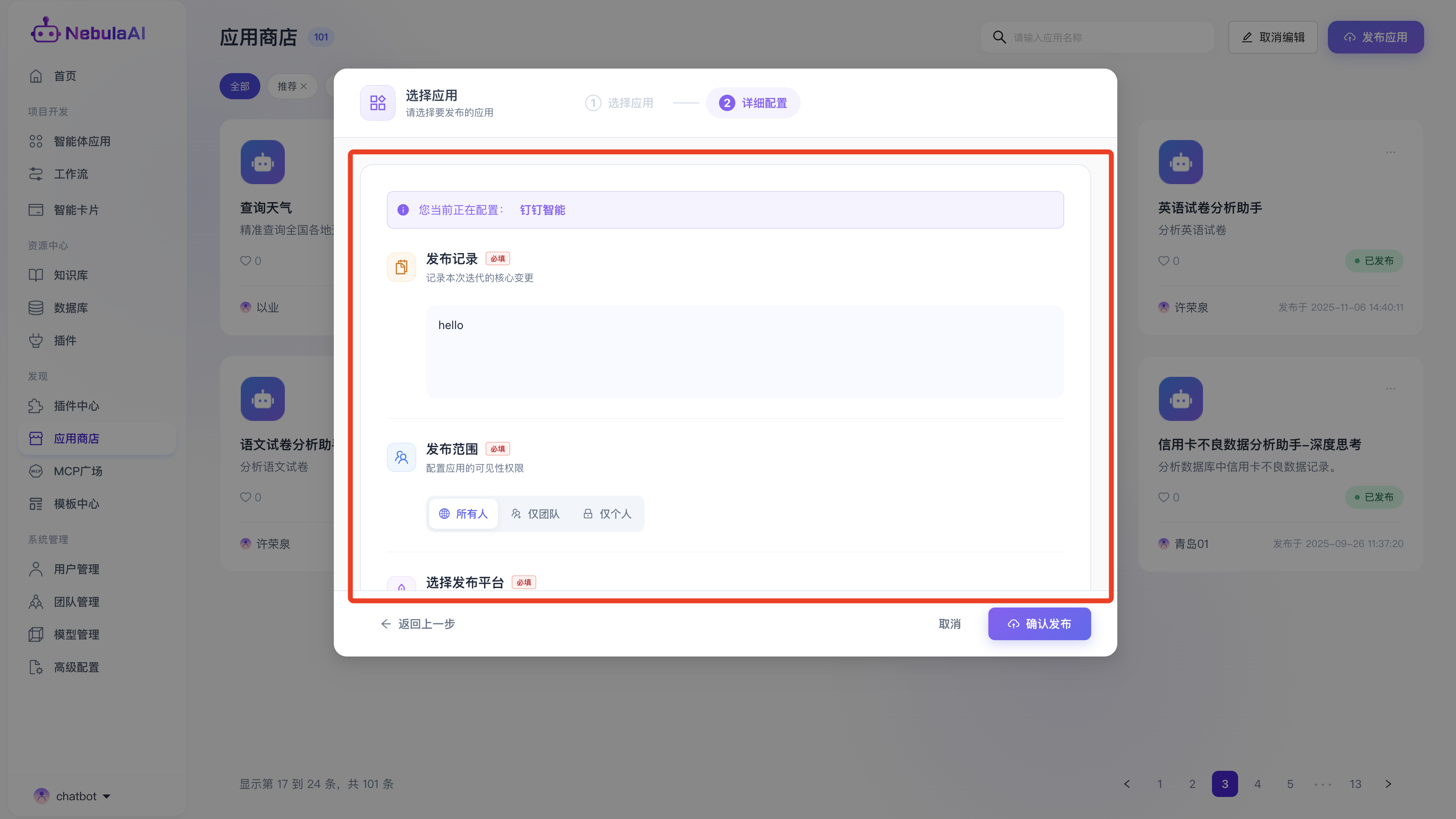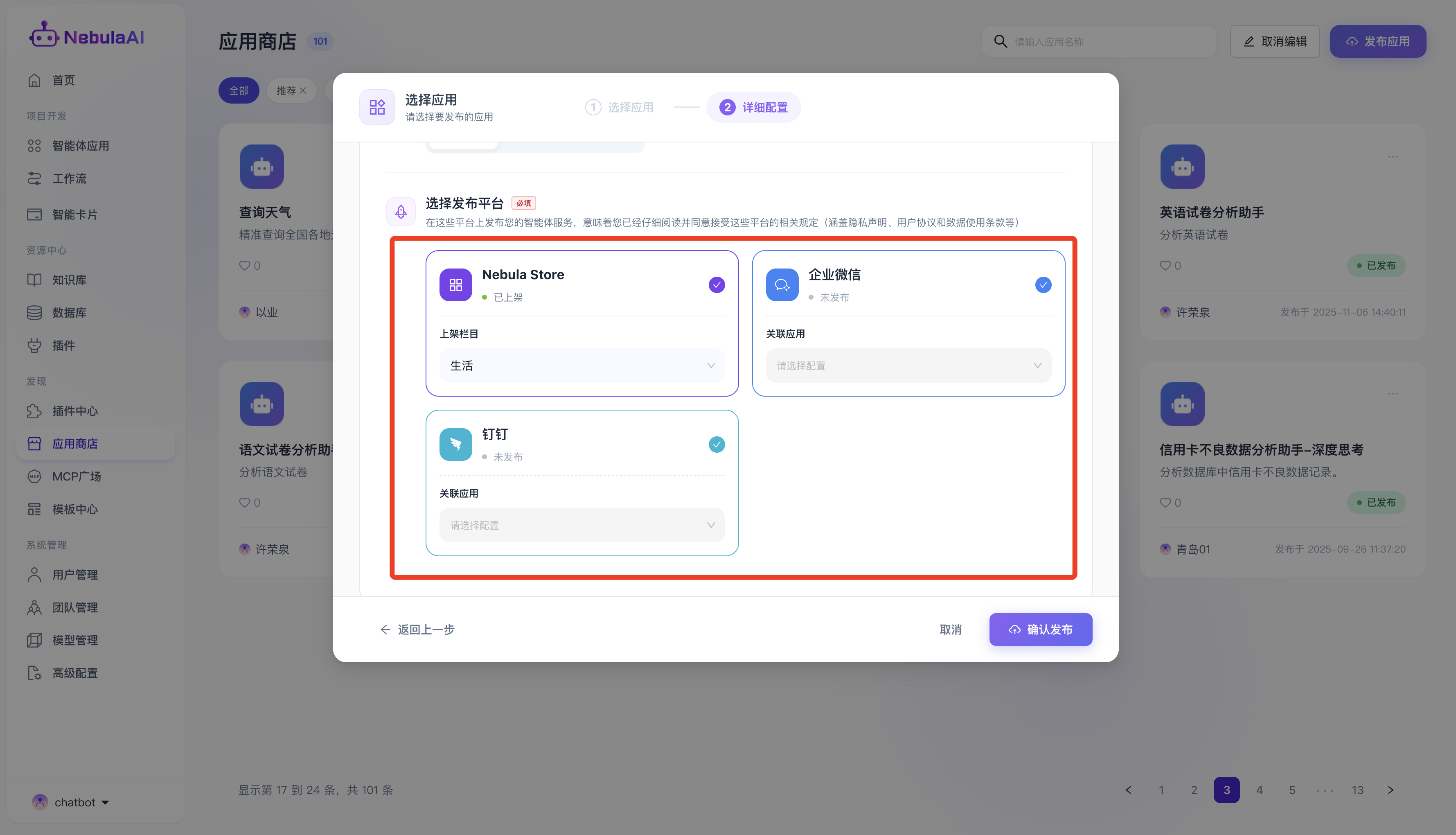 该部分是开发者将私域智能体转化为企业公共应用资产的能力,NebulaAI 提供了一套极简且严谨的向导式发布流程。