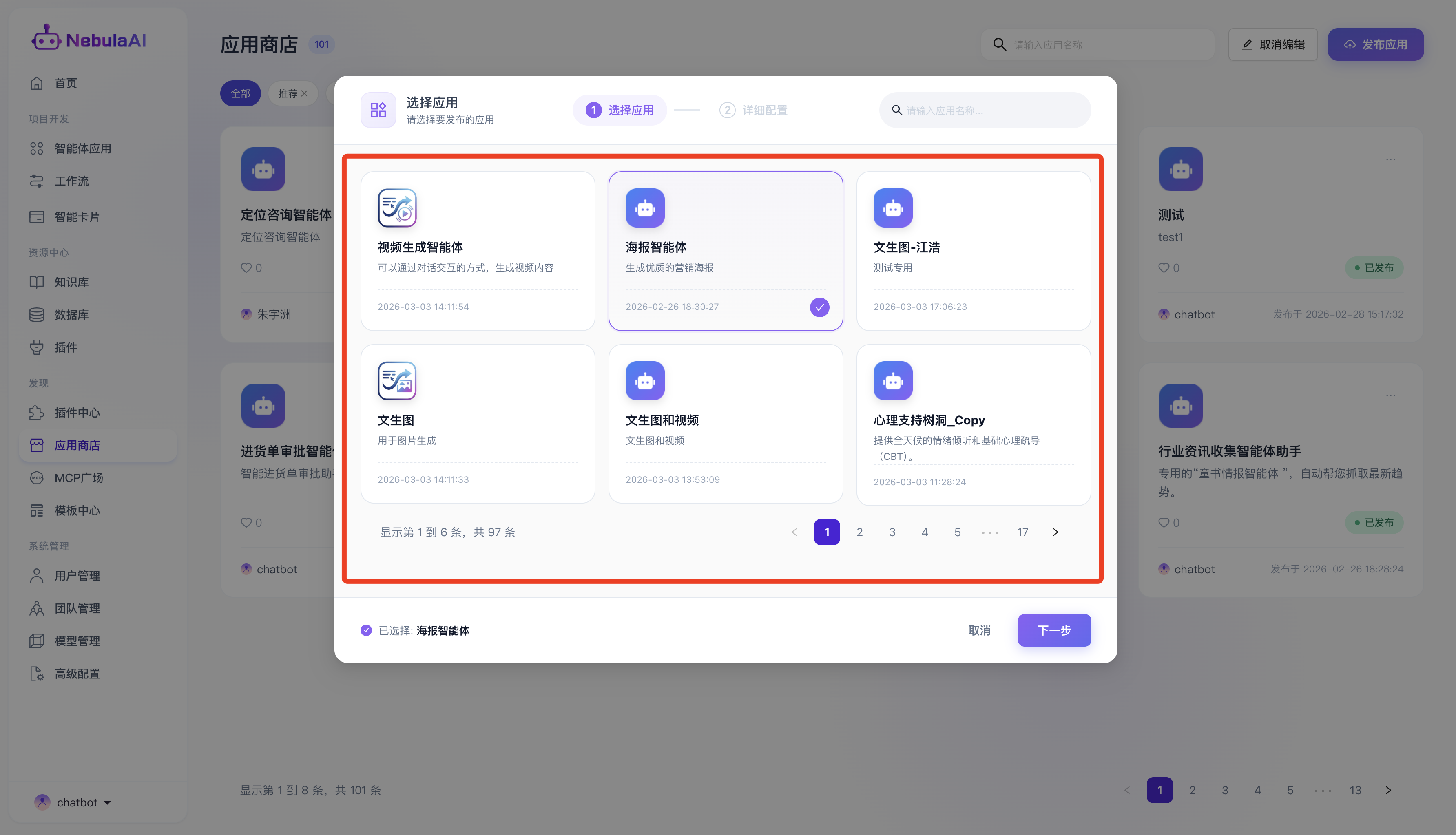 - 单选交互反馈: 用户点击目标卡片(如“海报智能体”)后,卡片会呈现醒目的紫色高亮边框及右下角的勾选确认标识,底部同时提示“已选择:海报智能体”,确保操作精准无误后方可点击“下一步”。
