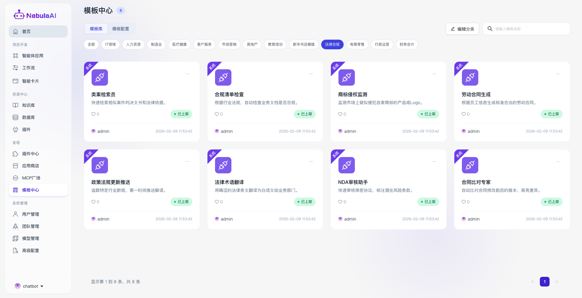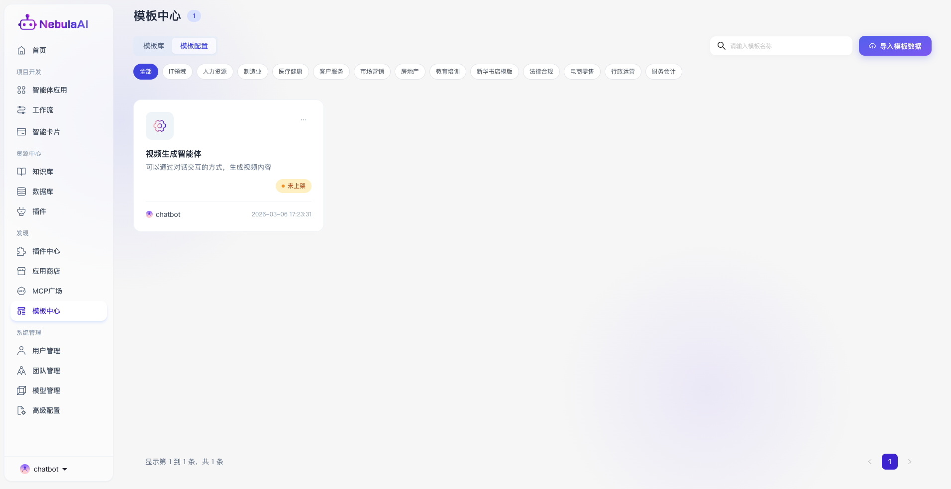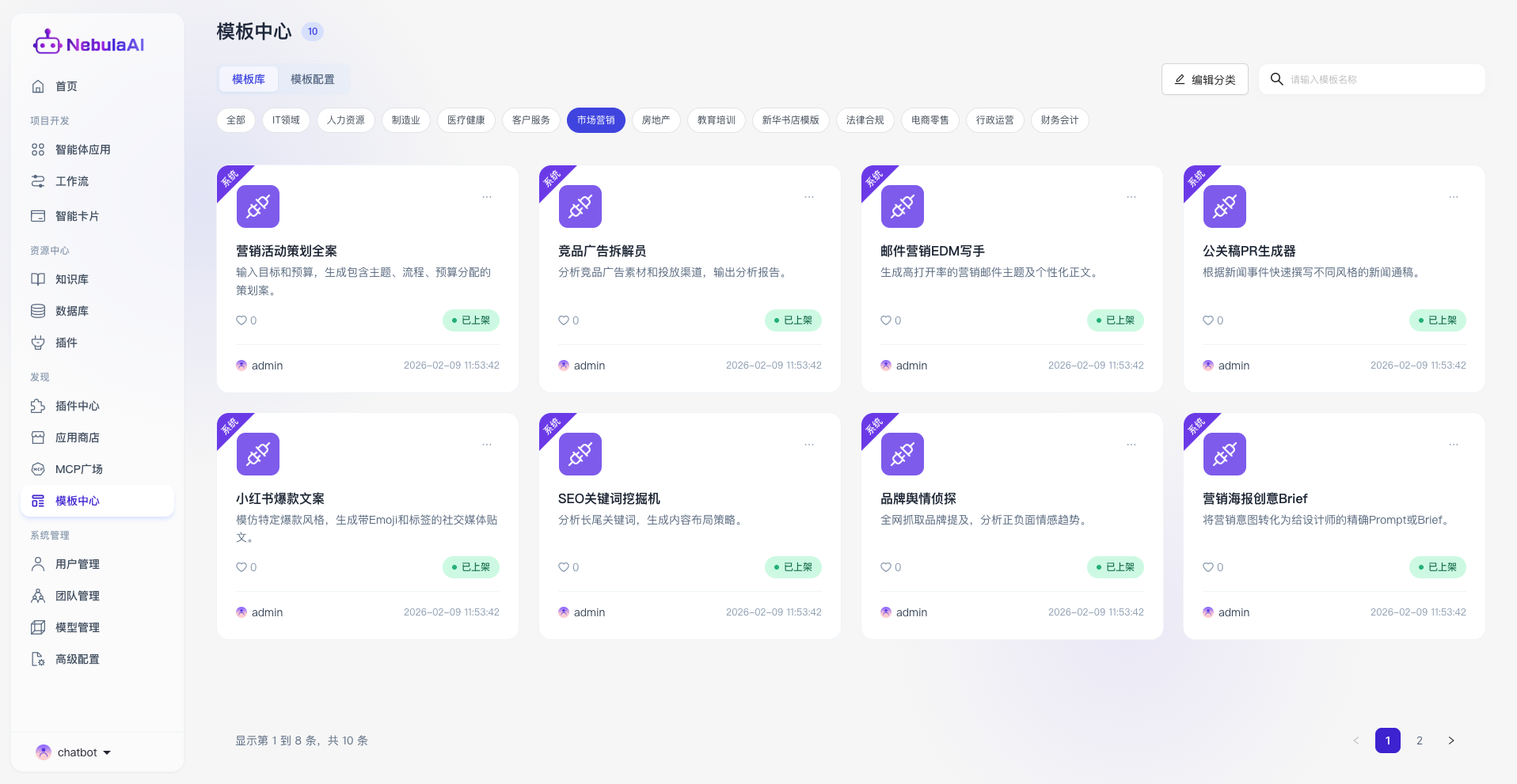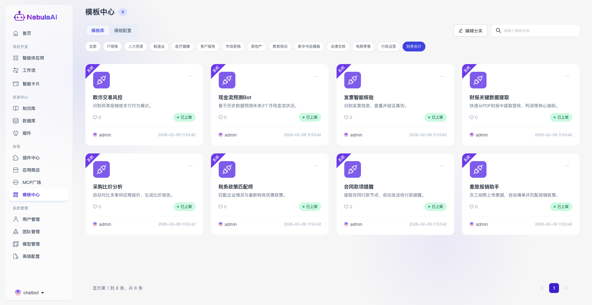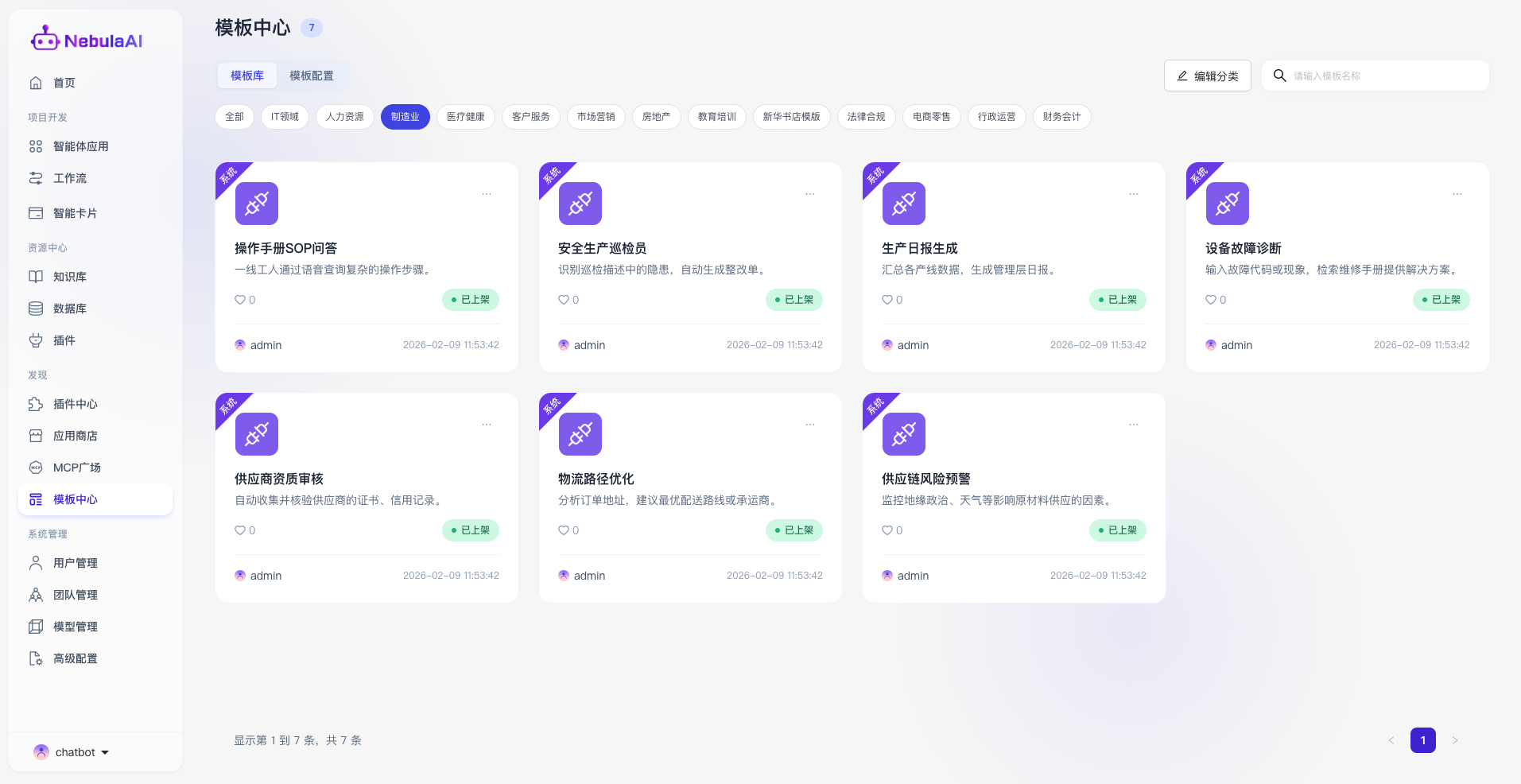 模板中心是 NebulaAI Agent 平台的核心资产沉淀与共享枢纽,其核心业务场景旨在赋能企业管理员将优质的智能体应用(如通过外部导入或内部遴选)统一汇聚至“模板配置”中进行预处理,随后将其“上架”至“模板库”,从而为企业内部海量员工提供开箱即用、标准化的高质量智能体资源,极大降低业务团队获取 AI 能力的门槛。