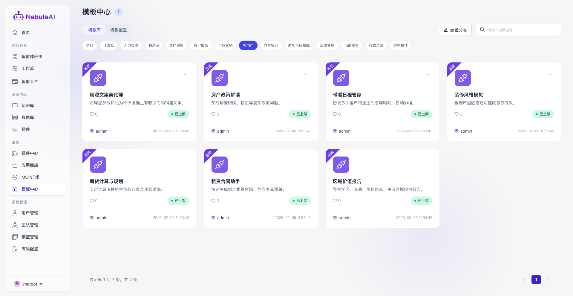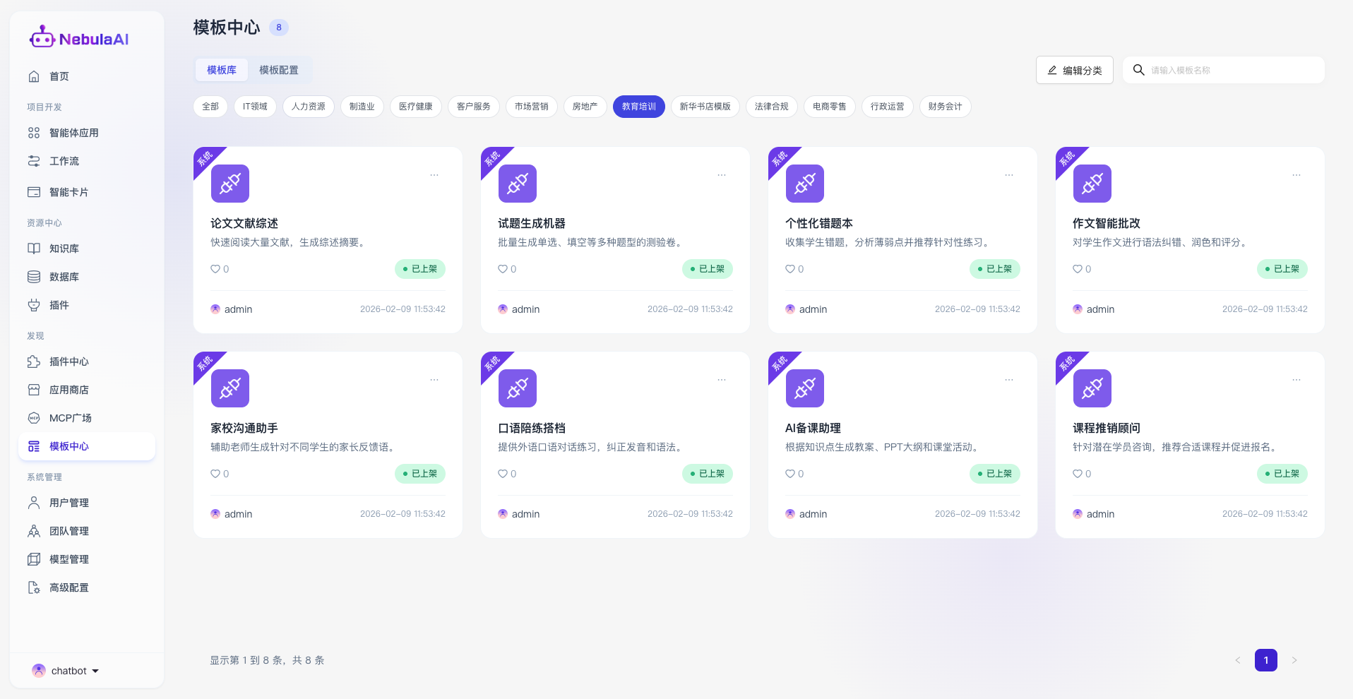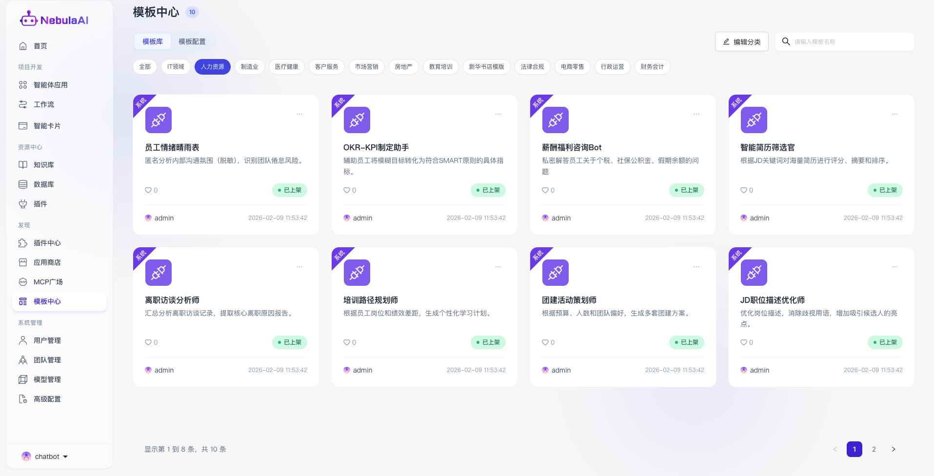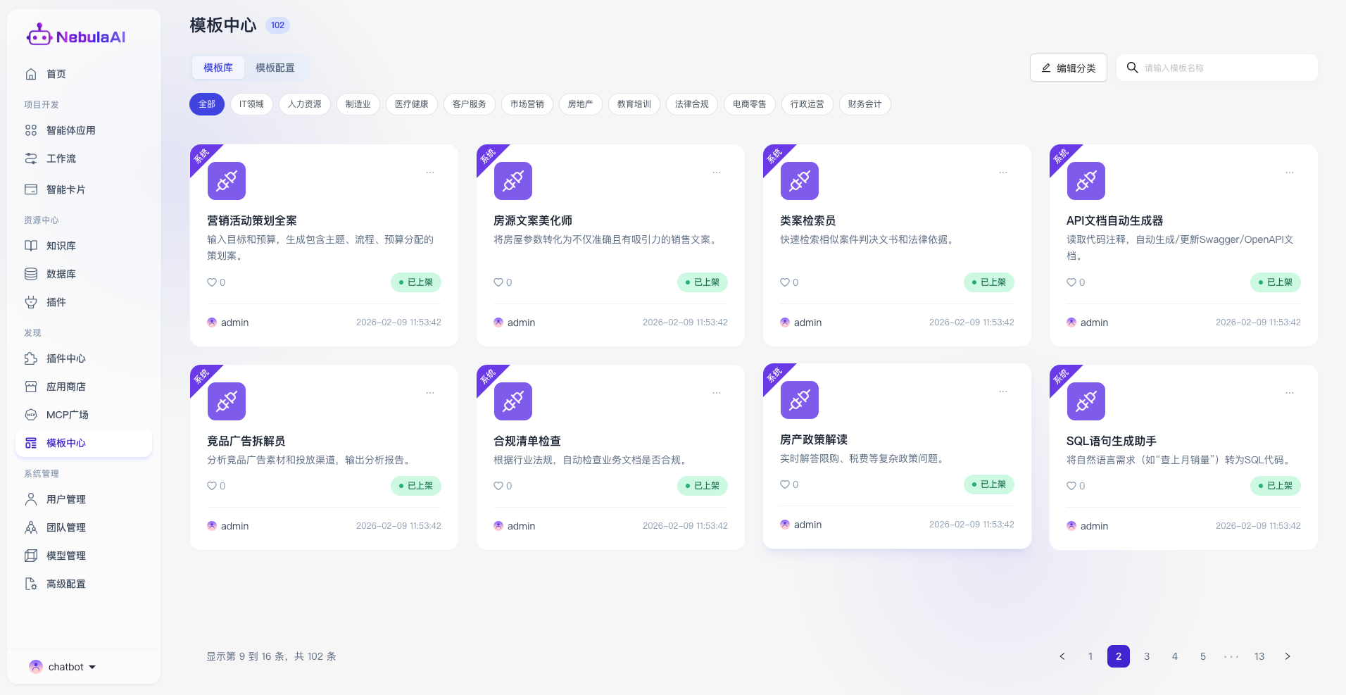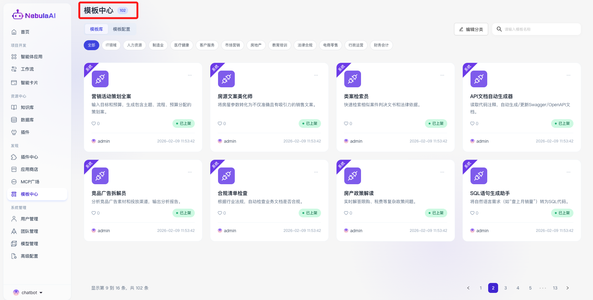 模板中心是 NebulaAI Agent 平台的核心资产沉淀与共享枢纽,其核心业务场景旨在赋能企业管理员将优质的智能体应用(如通过外部导入或内部遴选)统一汇聚至“模板配置”中进行预处理,随后将其“上架”至“模板库”,从而为企业内部海量员工提供开箱即用、标准化的高质量智能体资源,极大降低业务团队获取 AI 能力的门槛。