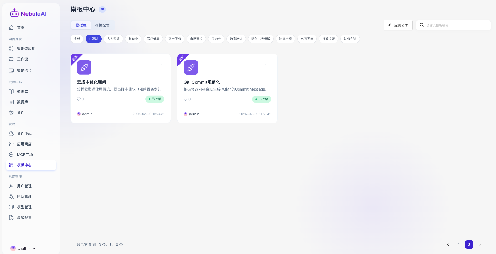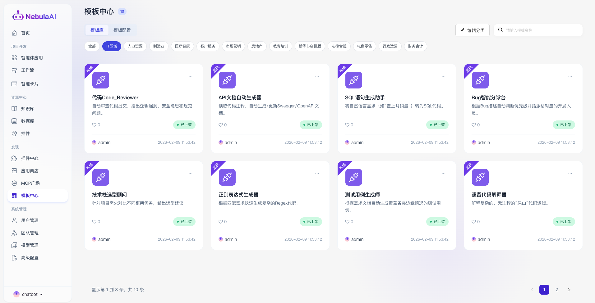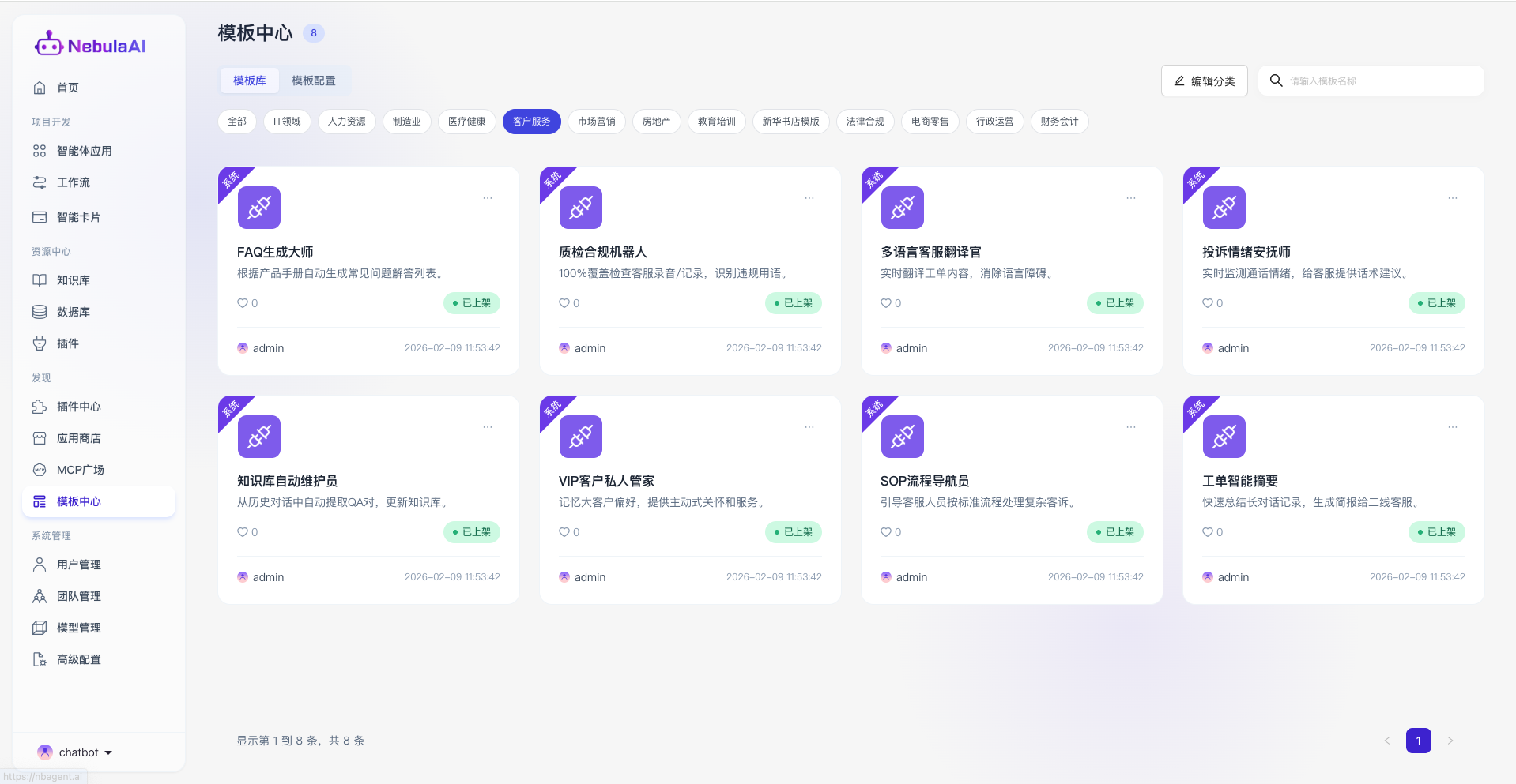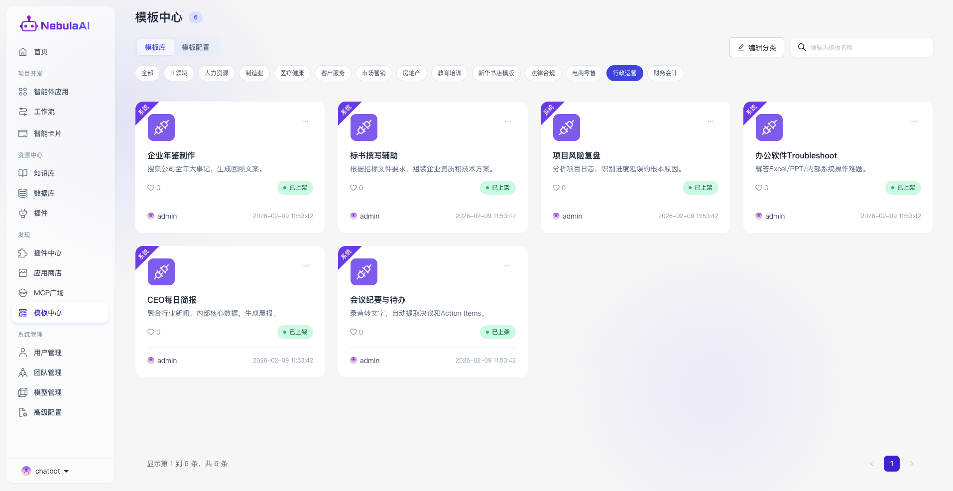 模板中心是 NebulaAI Agent 平台的核心资产沉淀与共享枢纽,其核心业务场景旨在赋能企业管理员将优质的智能体应用(如通过外部导入或内部遴选)统一汇聚至“模板配置”中进行预处理,随后将其“上架”至“模板库”,从而为企业内部海量员工提供开箱即用、标准化的高质量智能体资源,极大降低业务团队获取 AI 能力的门槛。