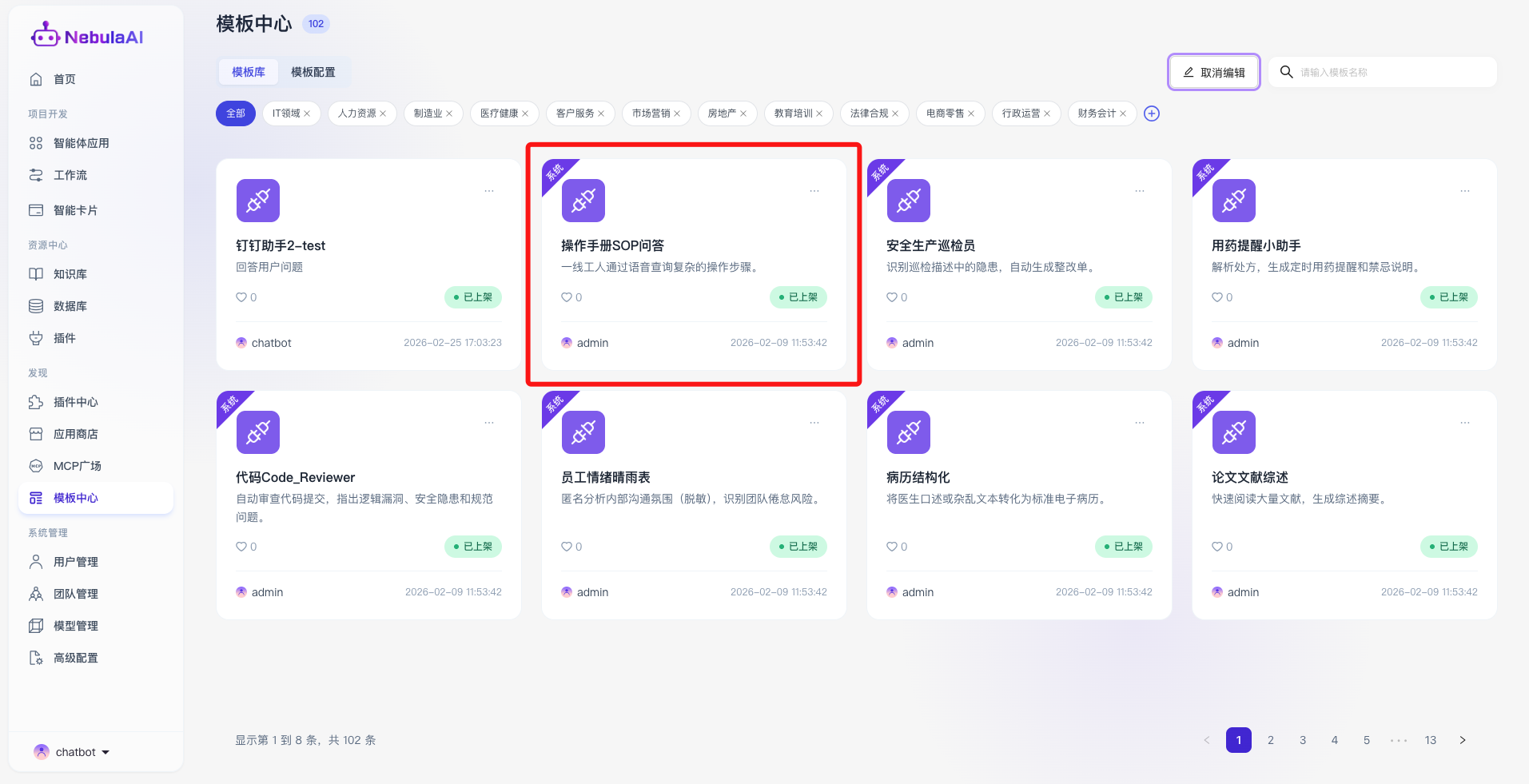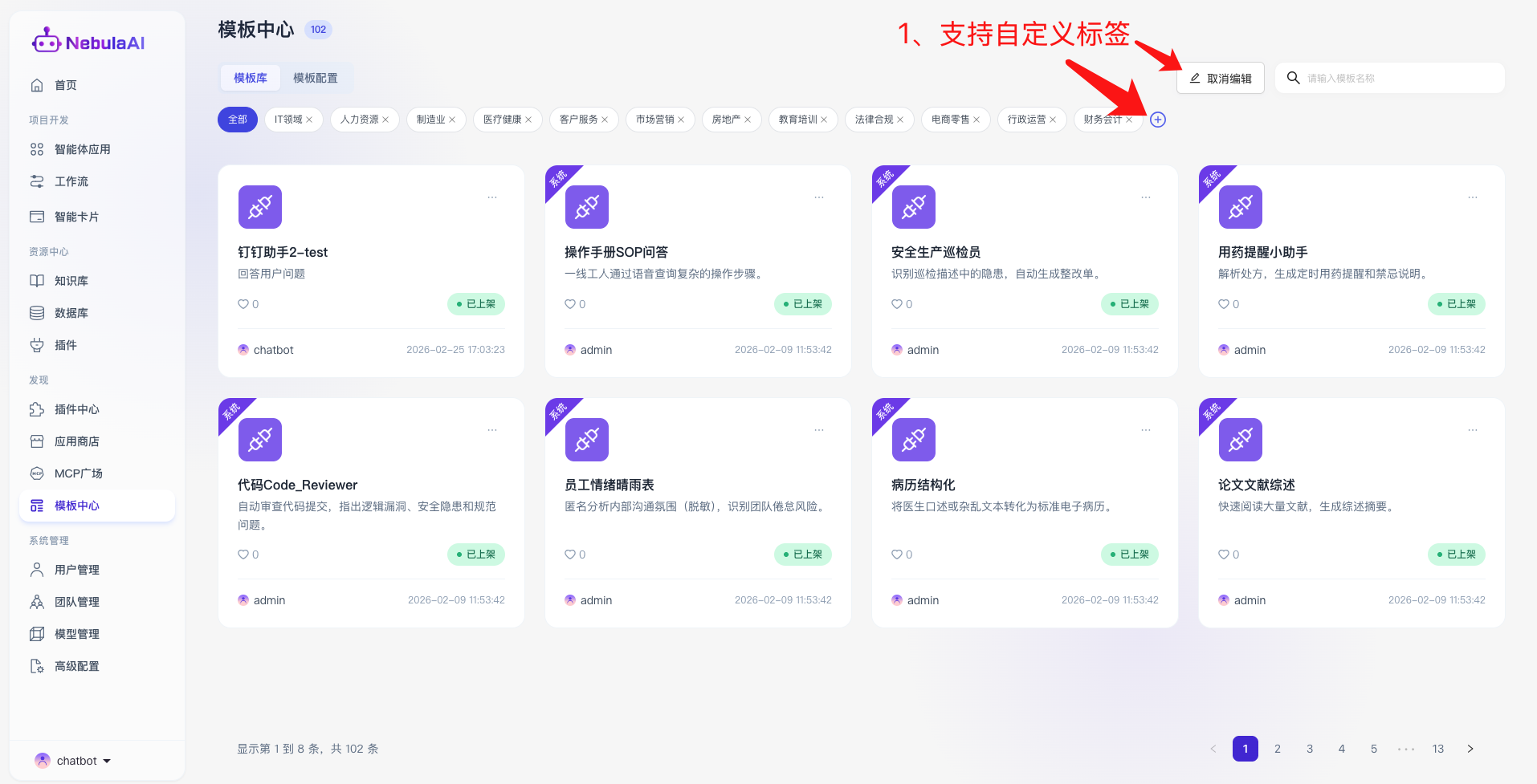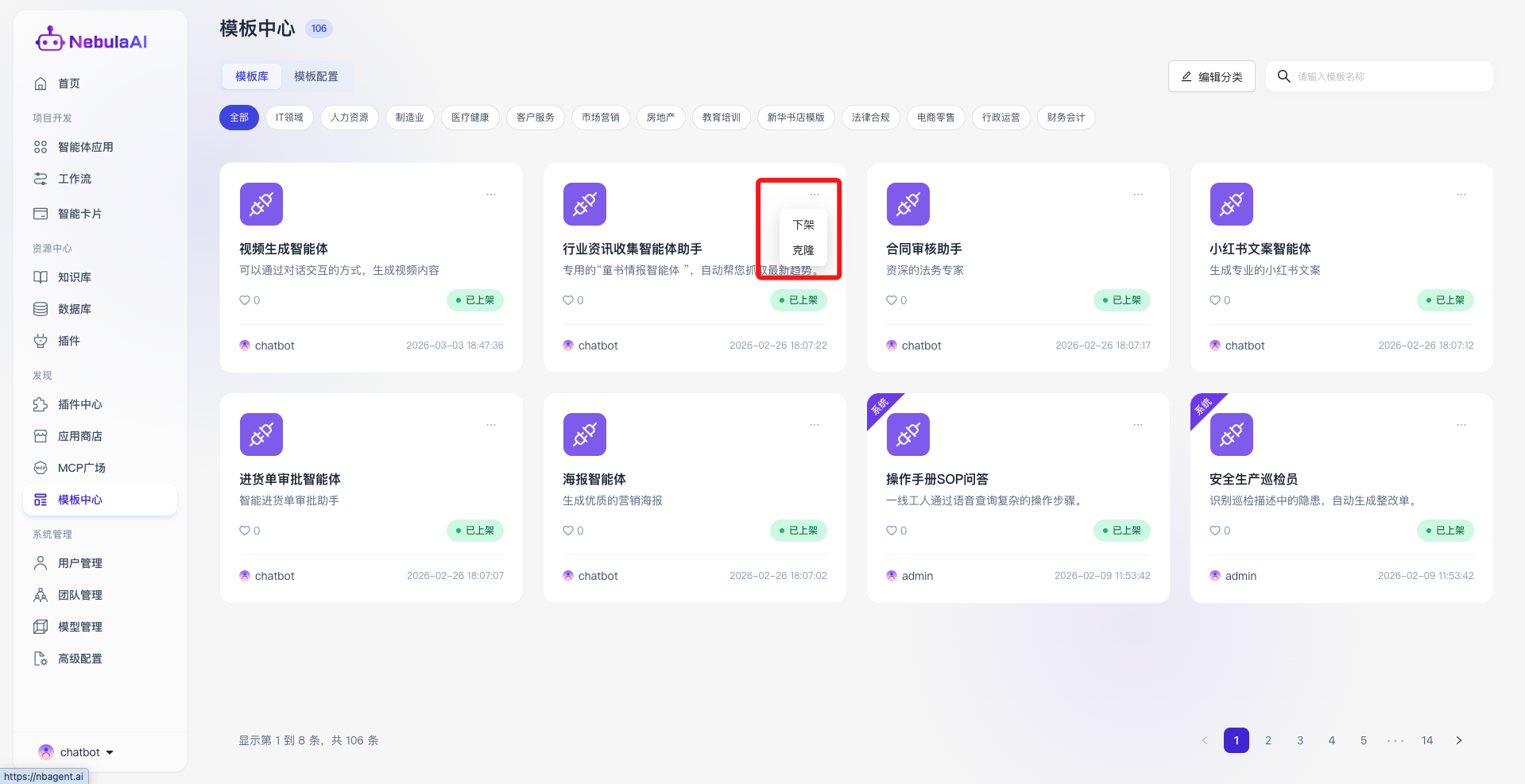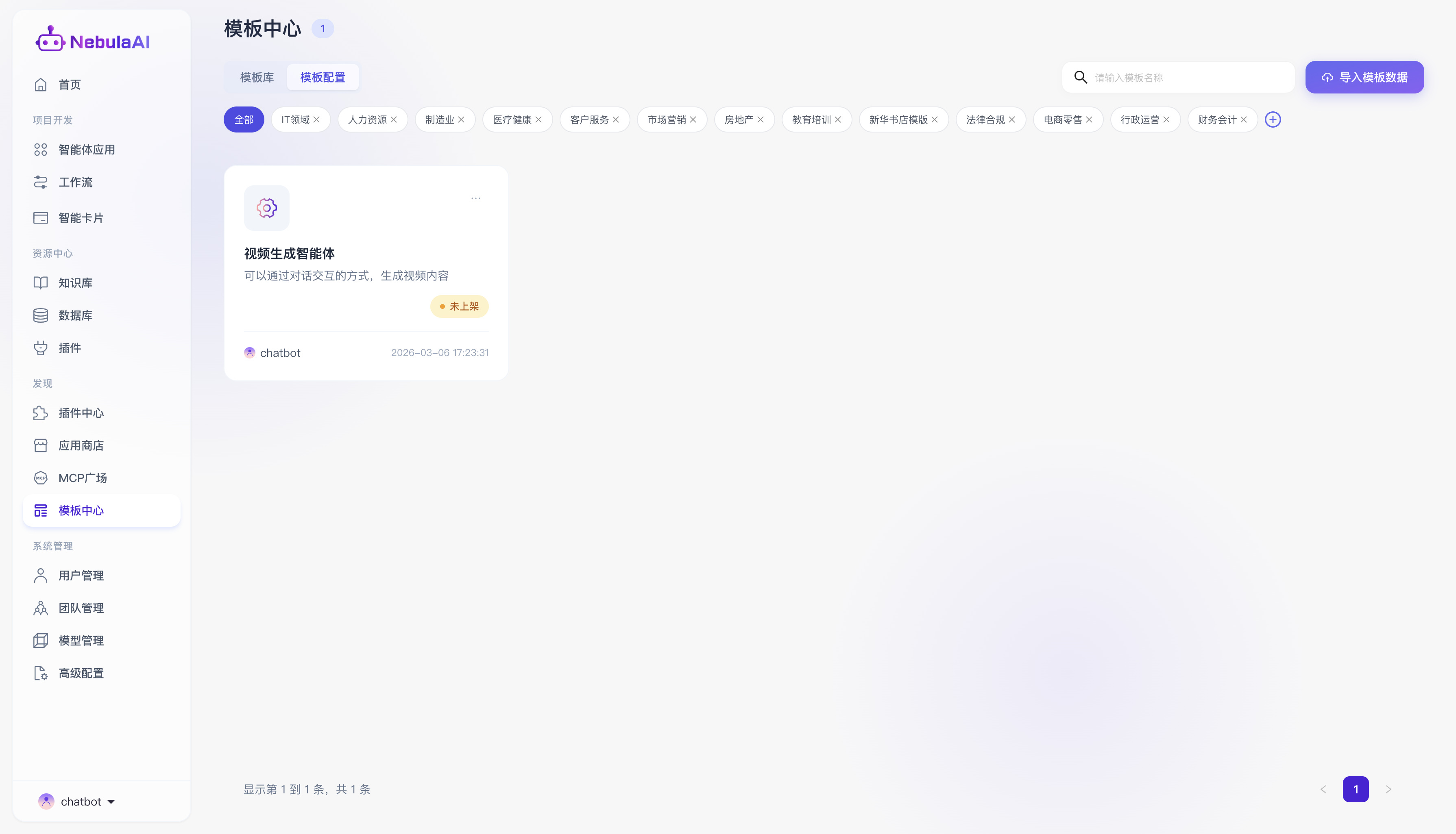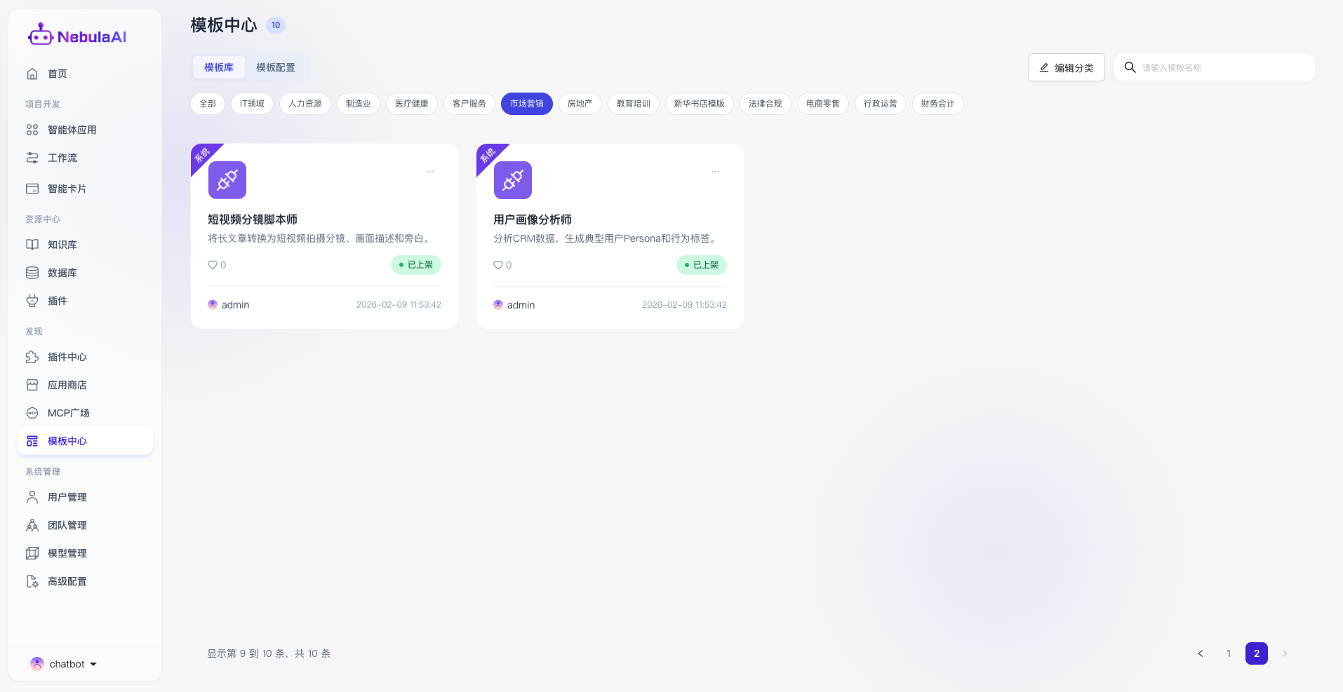 模板中心是 NebulaAI Agent 平台的核心资产沉淀与共享枢纽,其核心业务场景旨在赋能企业管理员将优质的智能体应用(如通过外部导入或内部遴选)统一汇聚至“模板配置”中进行预处理,随后将其“上架”至“模板库”,从而为企业内部海量员工提供开箱即用、标准化的高质量智能体资源,极大降低业务团队获取 AI 能力的门槛。