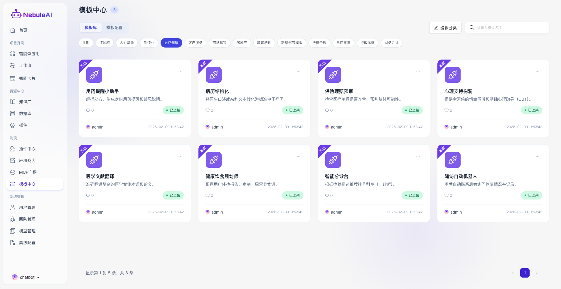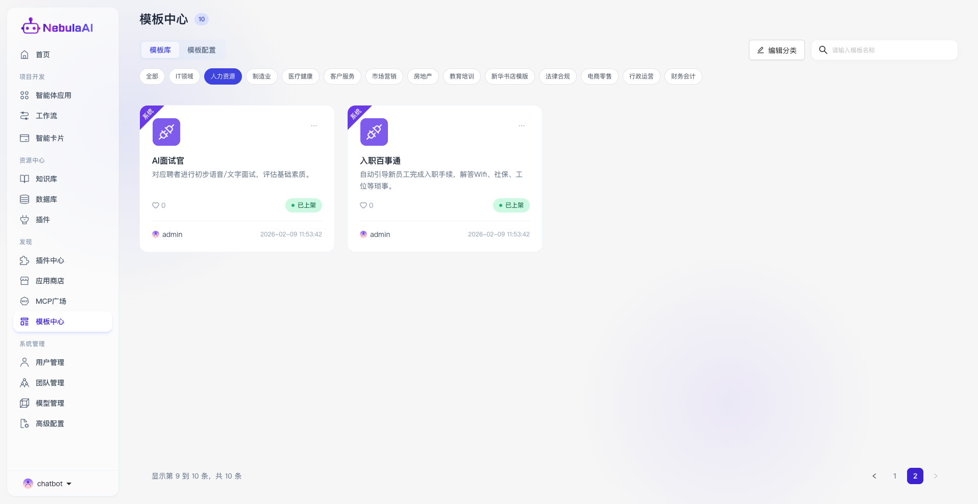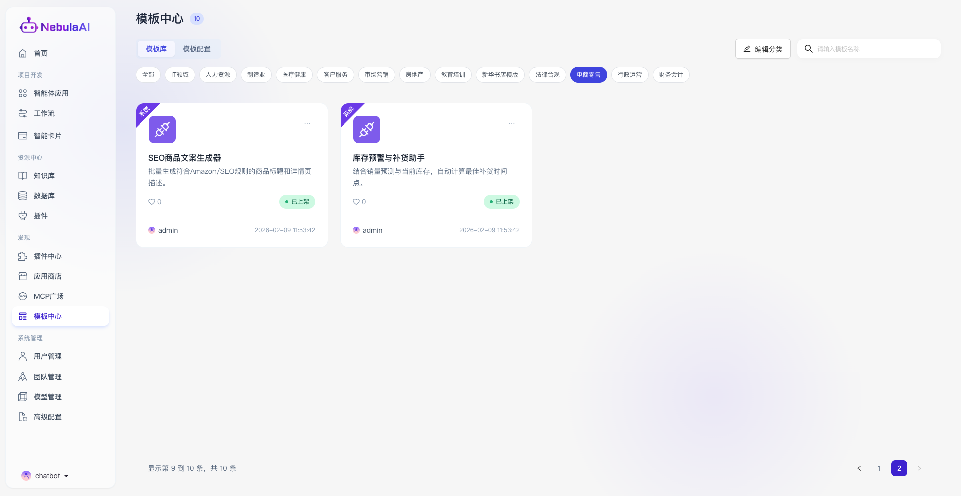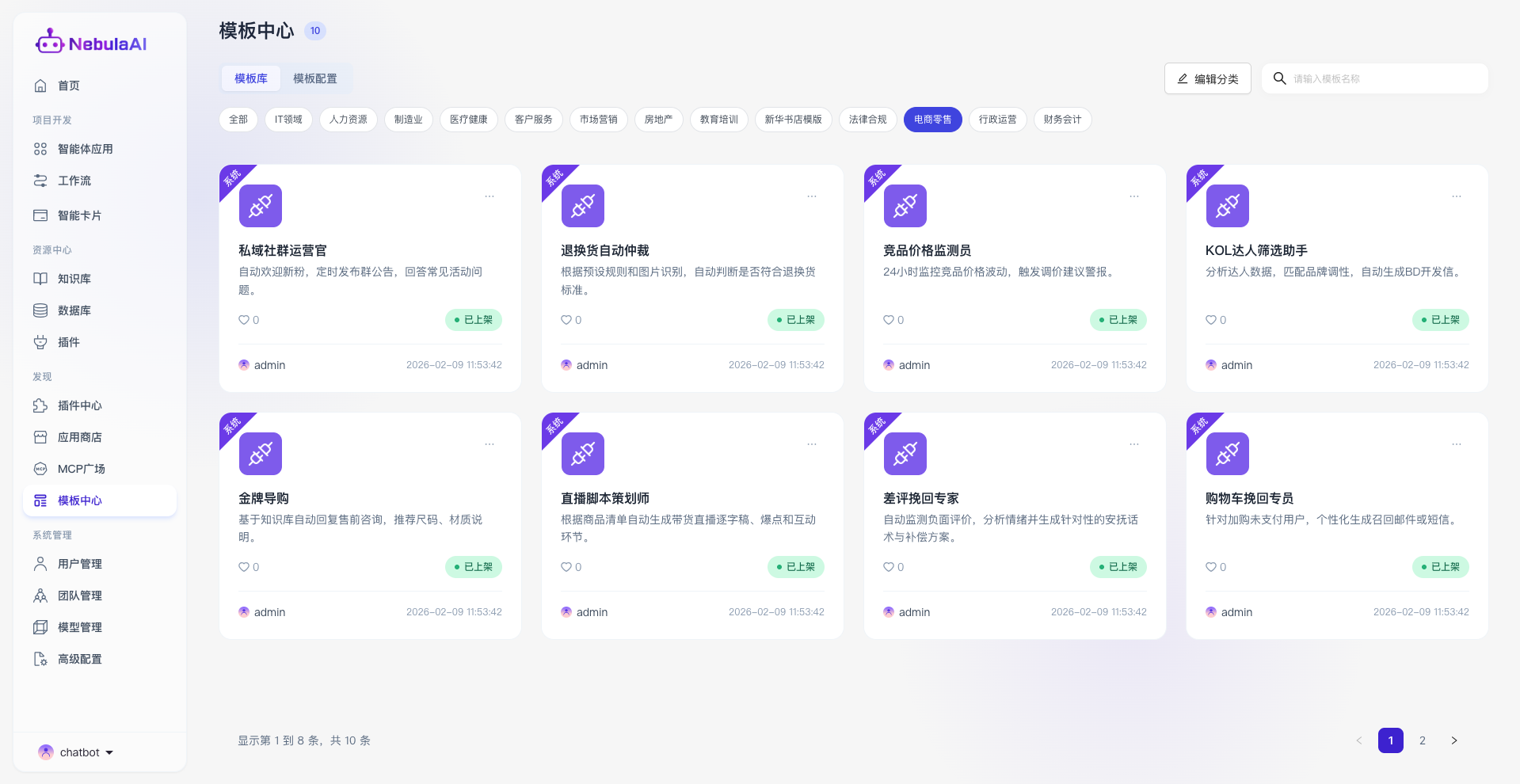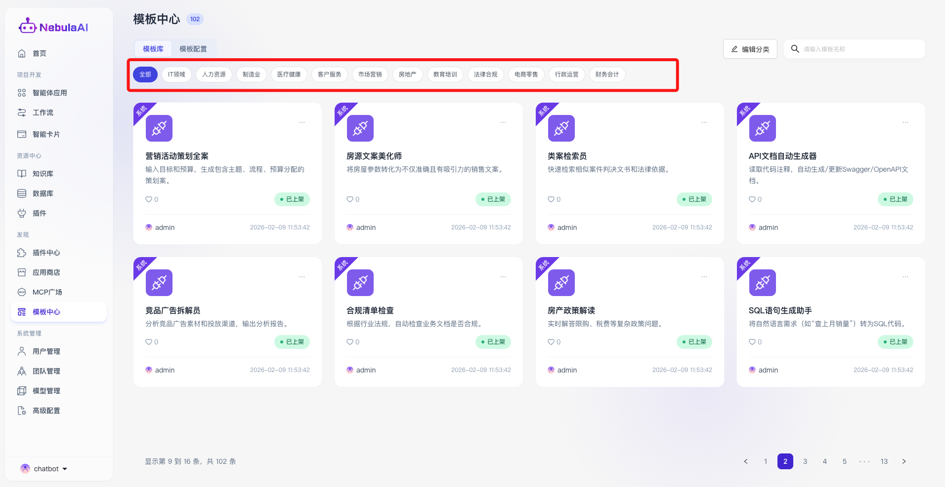模板中心是 NebulaAI Agent 平台的核心资产沉淀与共享枢纽,其核心业务场景旨在赋能企业管理员将优质的智能体应用(如通过外部导入或内部遴选)统一汇聚至“模板配置”中进行预处理,随后将其“上架”至“模板库”,从而为企业内部海量员工提供开箱即用、标准化的高质量智能体资源,极大降低业务团队获取 AI 能力的门槛。