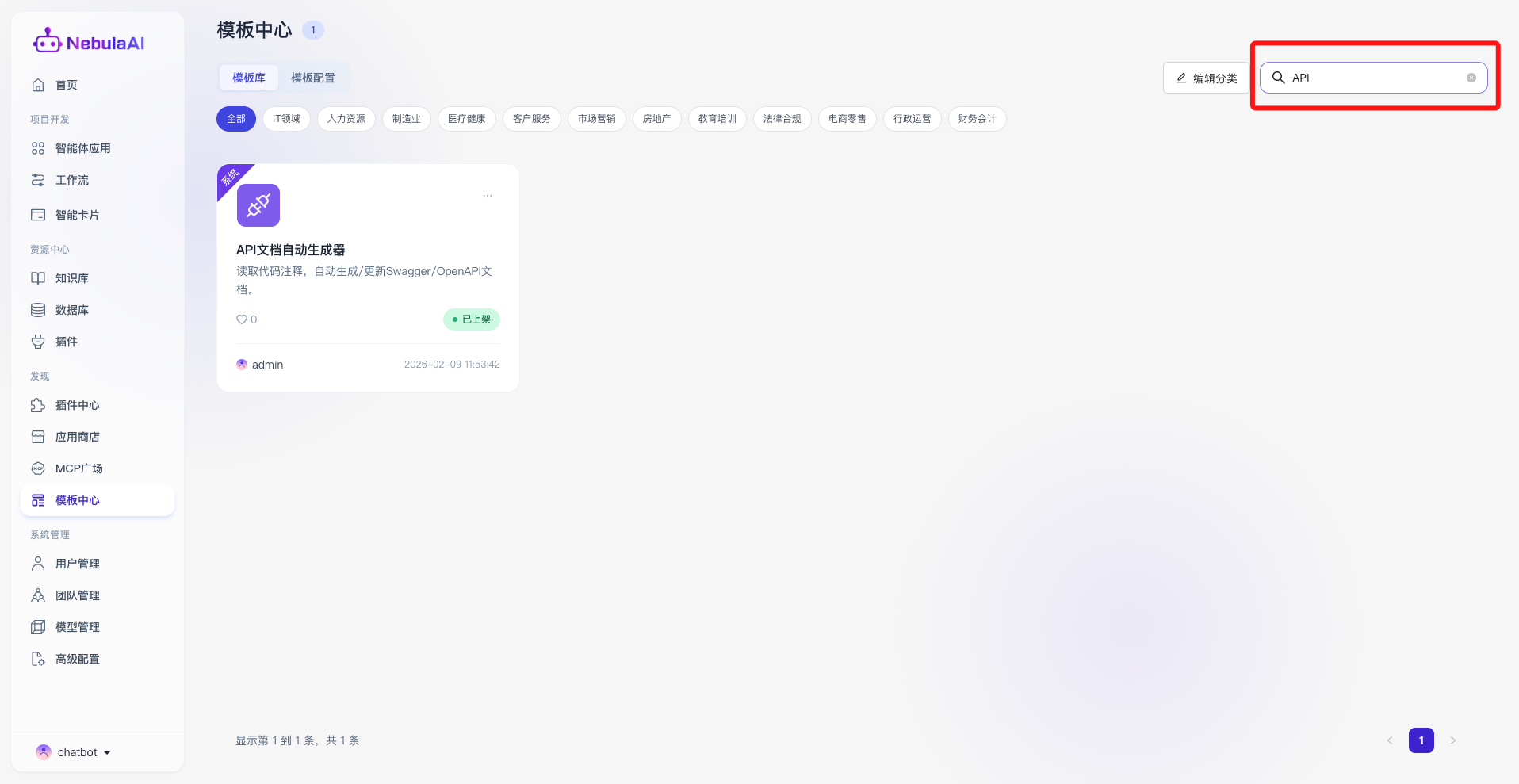 - 模糊搜索:支持通过输入应用名称进行模糊或精确检索,帮助用户在海量模板中快速定位目标智能体应用。