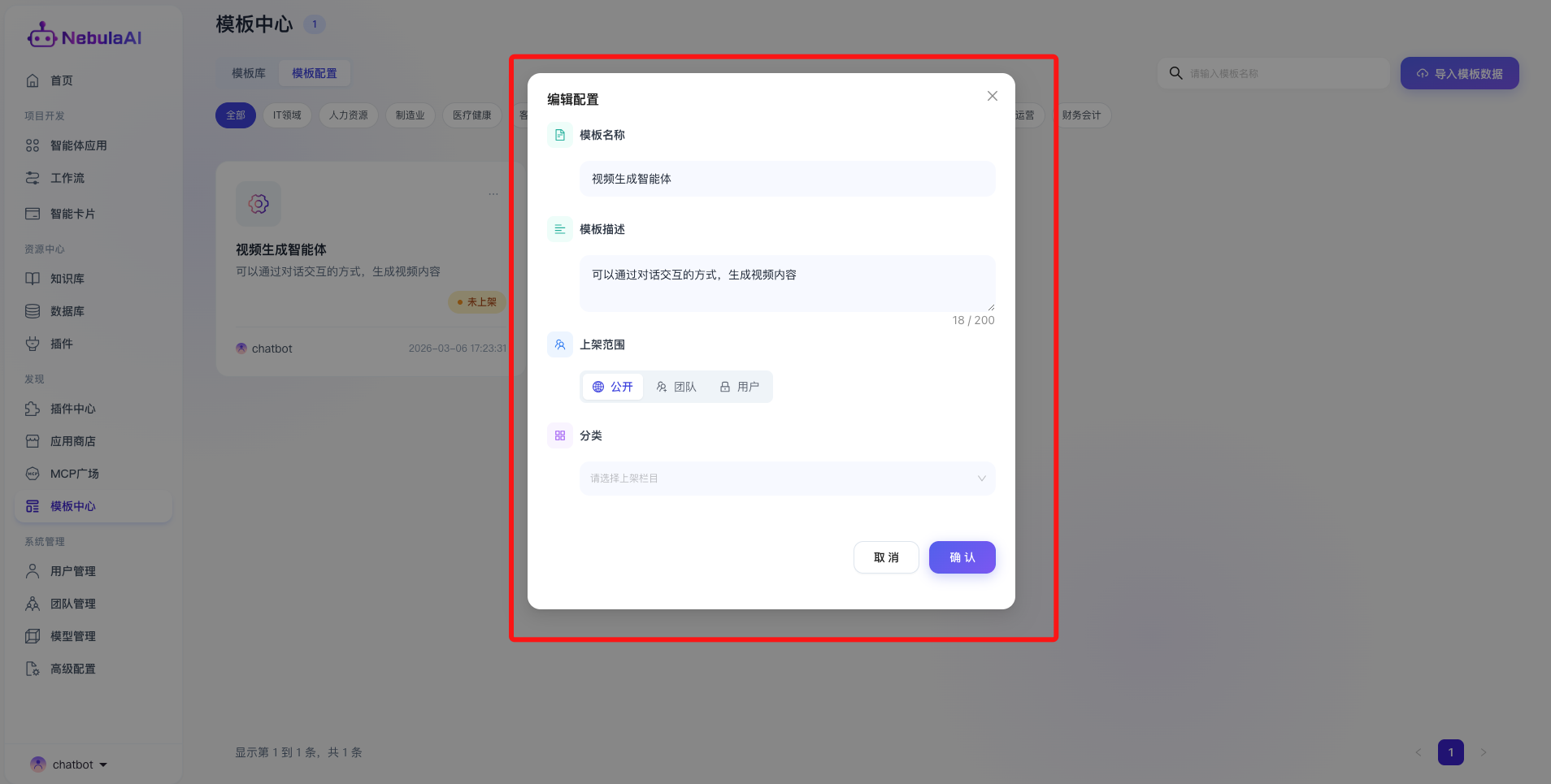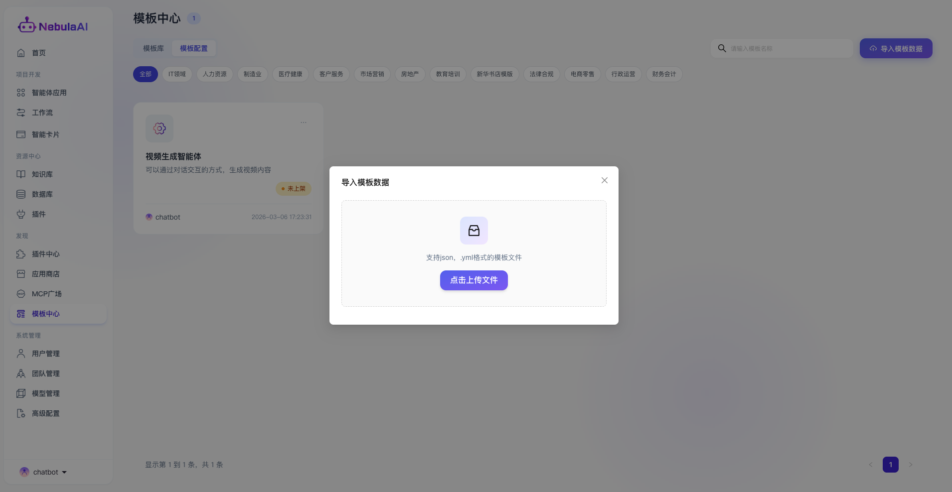 - 模板导入: 点击“模板配置”页面的“导入模板数据”按钮,支持将智能体应用导入到模板中心中,严格支持