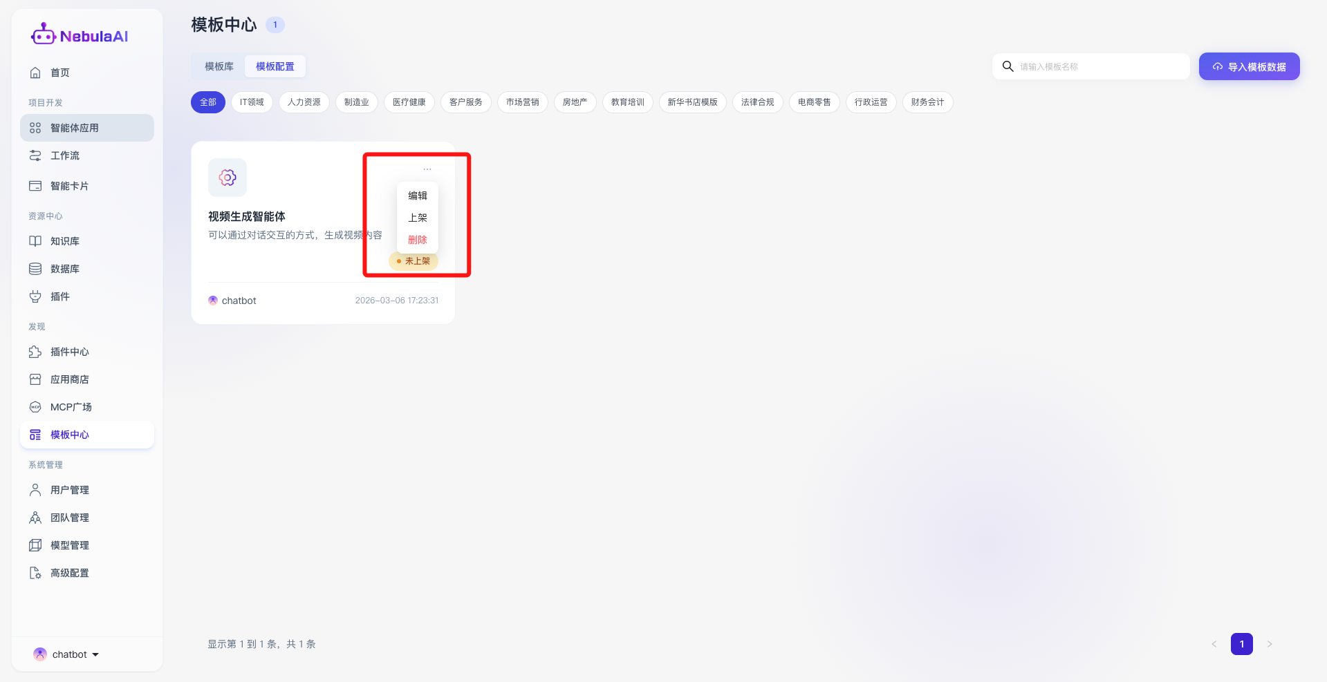 切换至“模板配置”Tab,即进入了管理员对智能体应用模板进行上架前管理与状态调度的工作区,此区域主要是存放已导入但尚未面向用户公开的“待办”或“测试中”智能体应用。