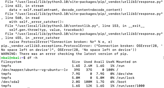 # 如果遇到下面的报错信息,主要是因为 OSError: [Errno 28] No space left on device pip._vendor.urllib3.exceptions.ProtocolError: ("Connection broken: OSError(28, 'No space left on device')", ...)