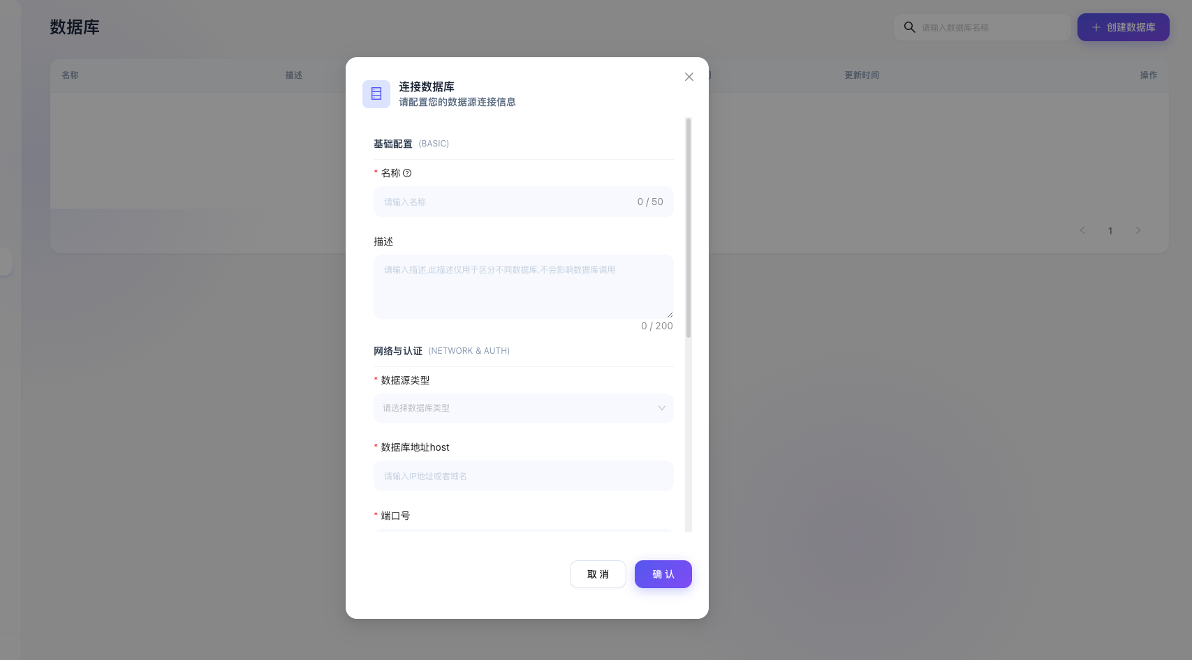 - 数据源类型:目前支持 MySQL 数据库、PostgreSQL数据库、SQL Server数据库。