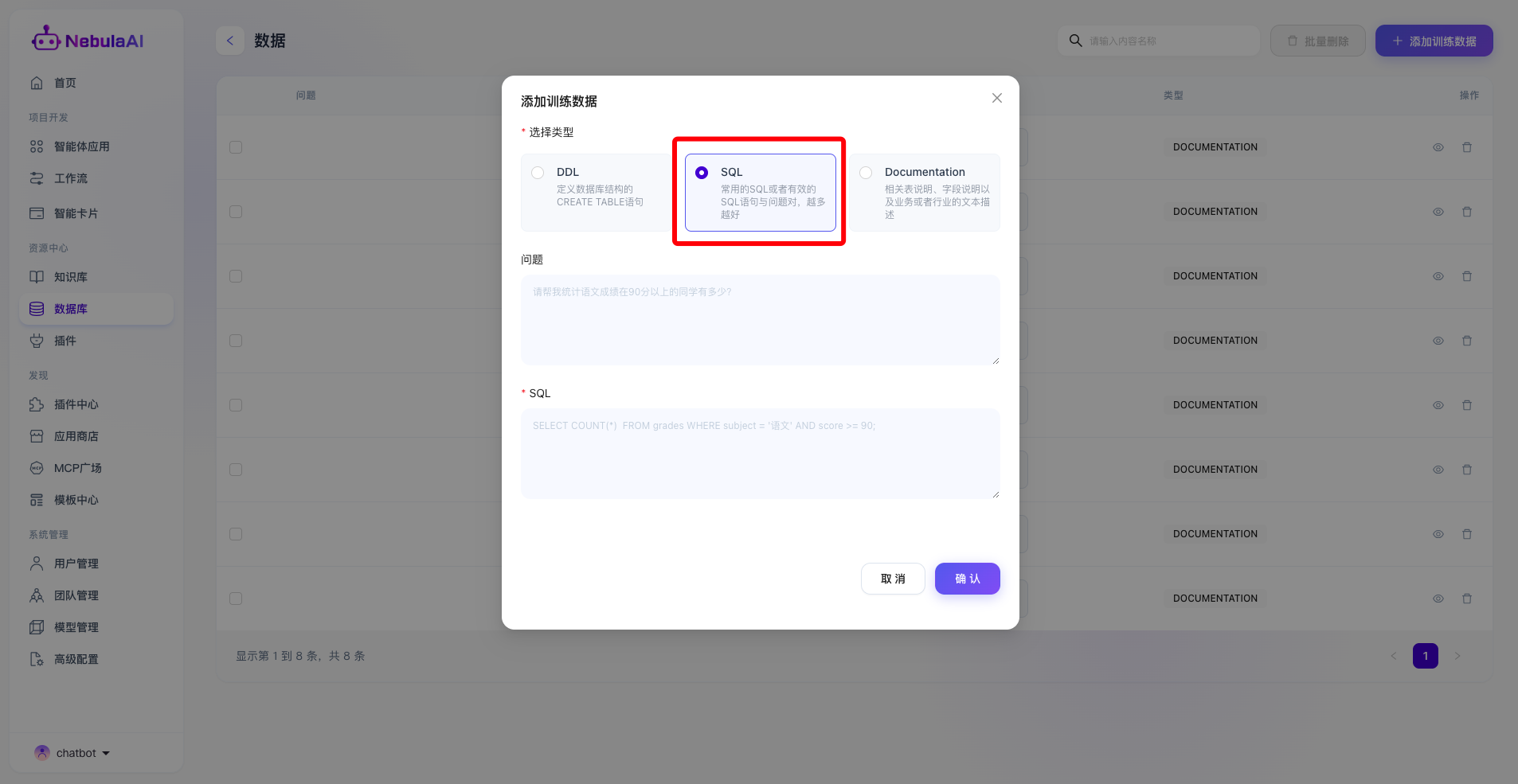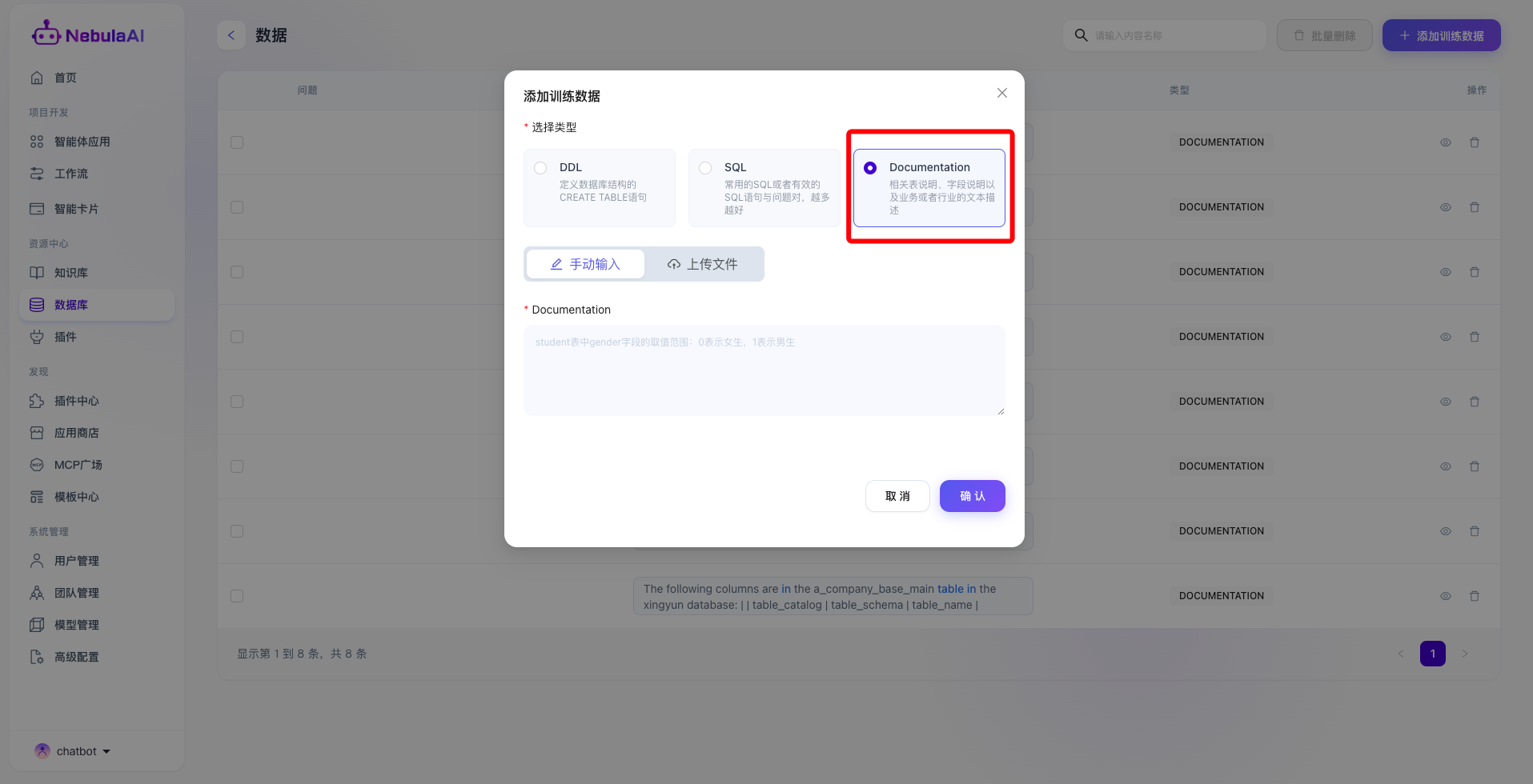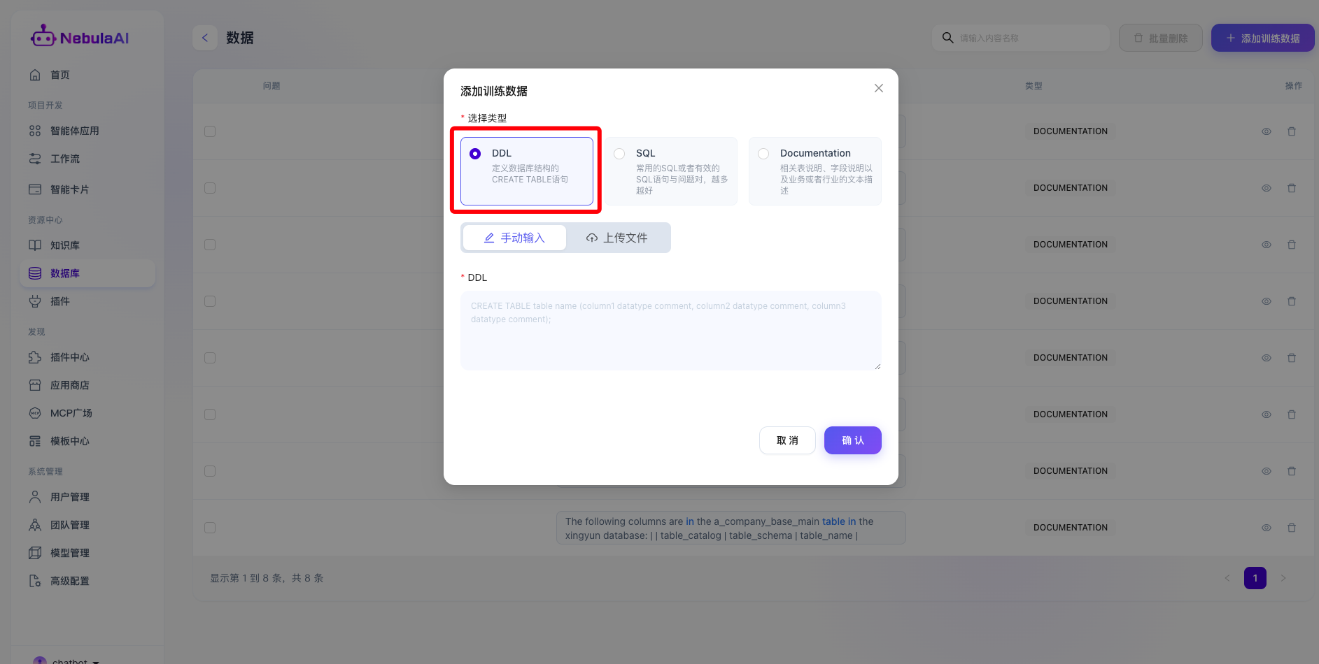 在 NebulaBI 中,训练数据类型分为三类,分别为 DDL、SQL 和 Documentation。每一类数据类型都有其特定的用途,帮助智能体正确理解和处理数据库结构及相关业务内容。