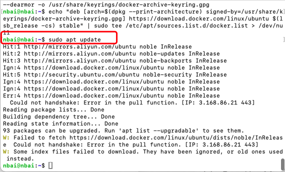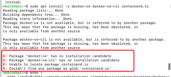 如果出现这个报错,主要原因是 APT 无法找到 docker-ce、docker-ce-cli 和 containerd.io 这三个包,也就是说当前系统软件源列表里没有 Docker 官方仓库,所以无法直接安装。