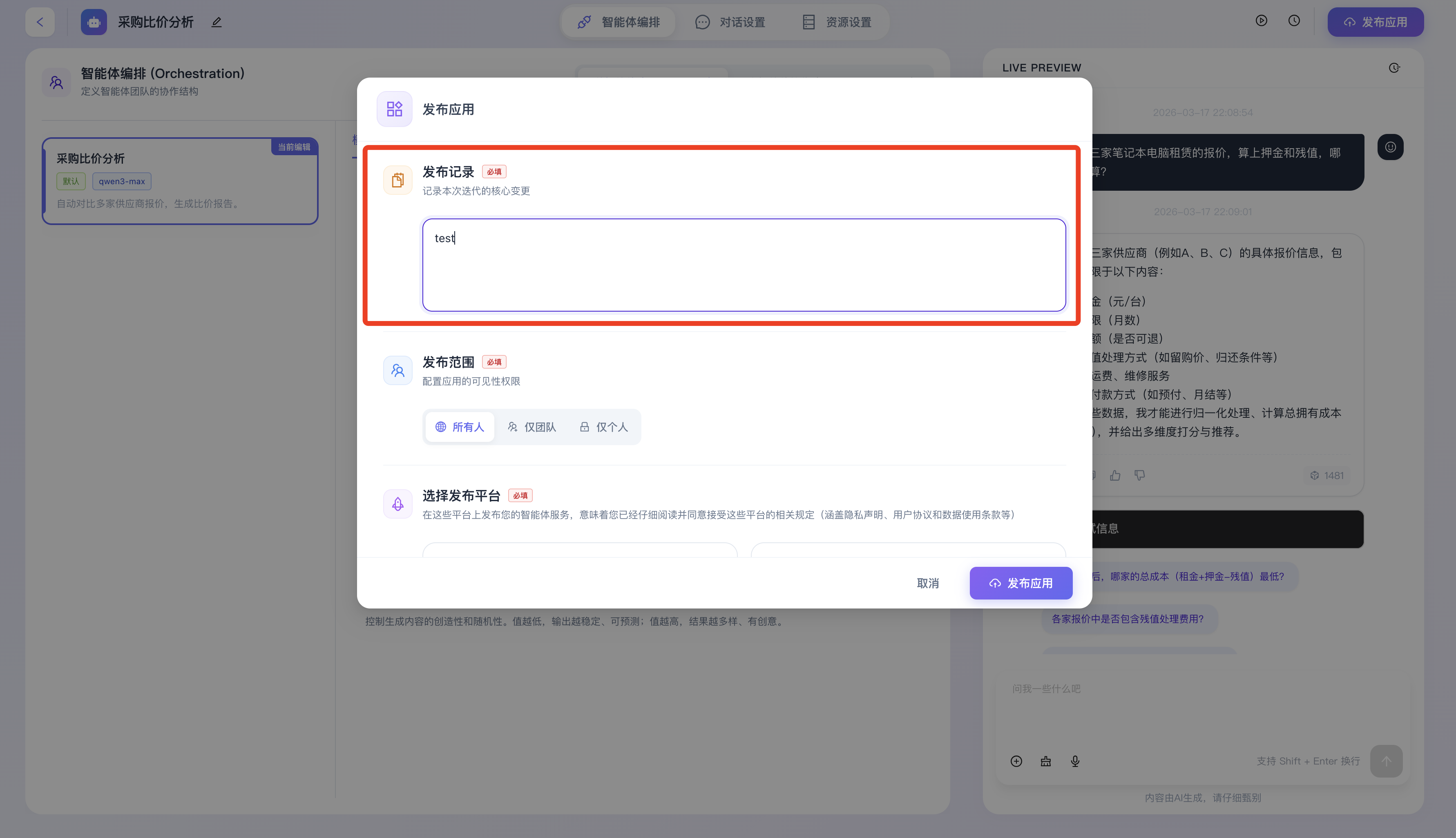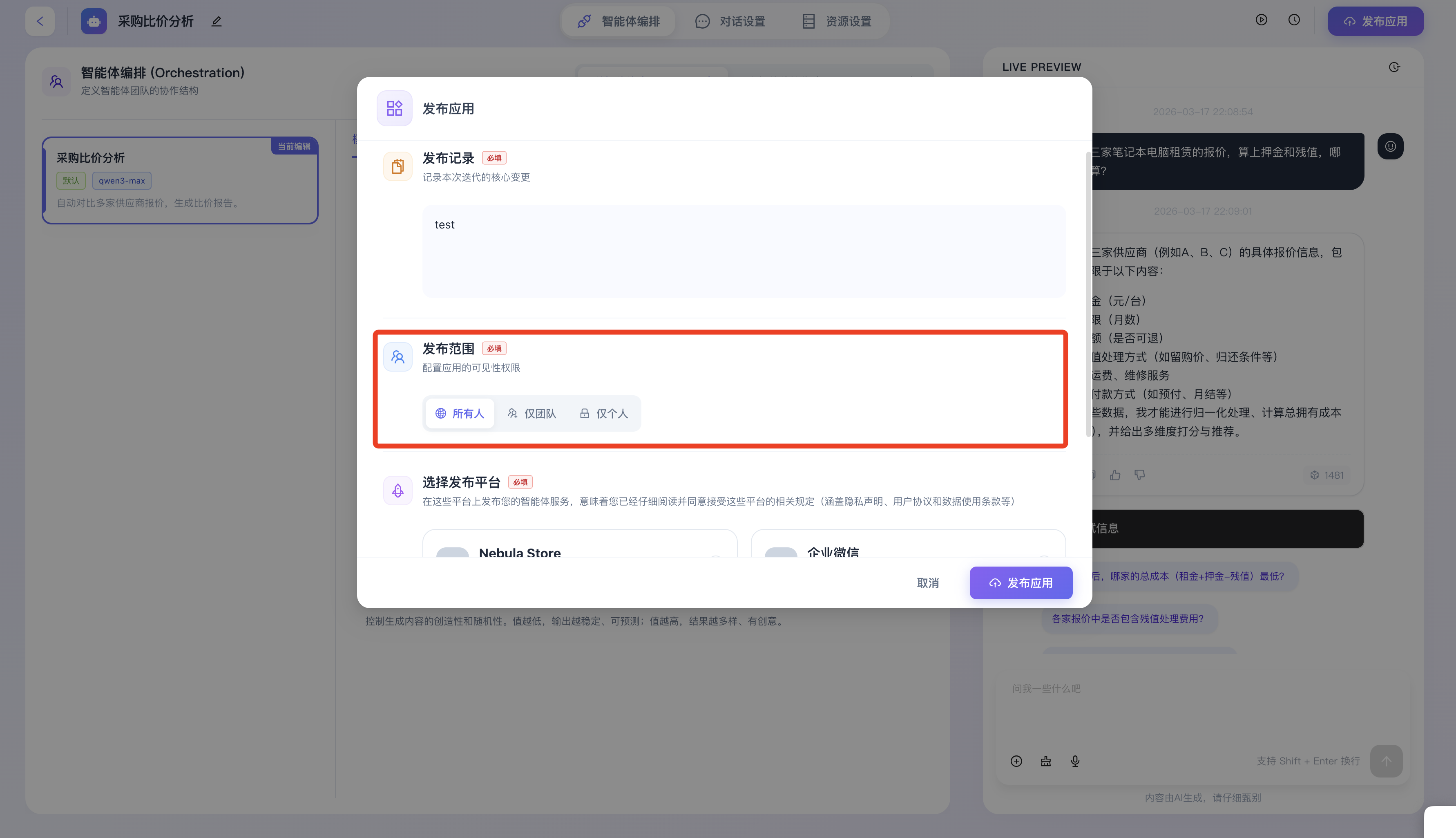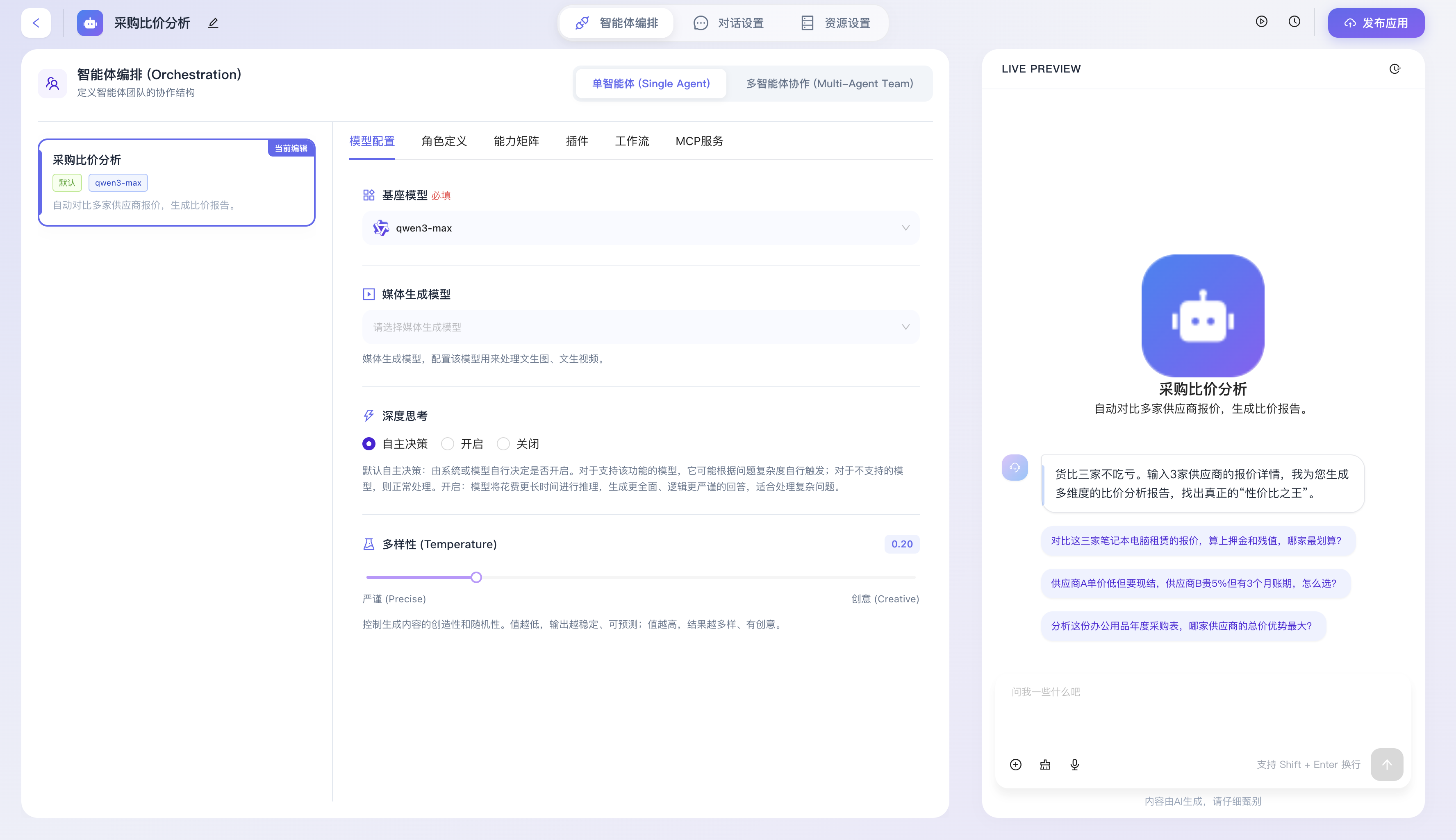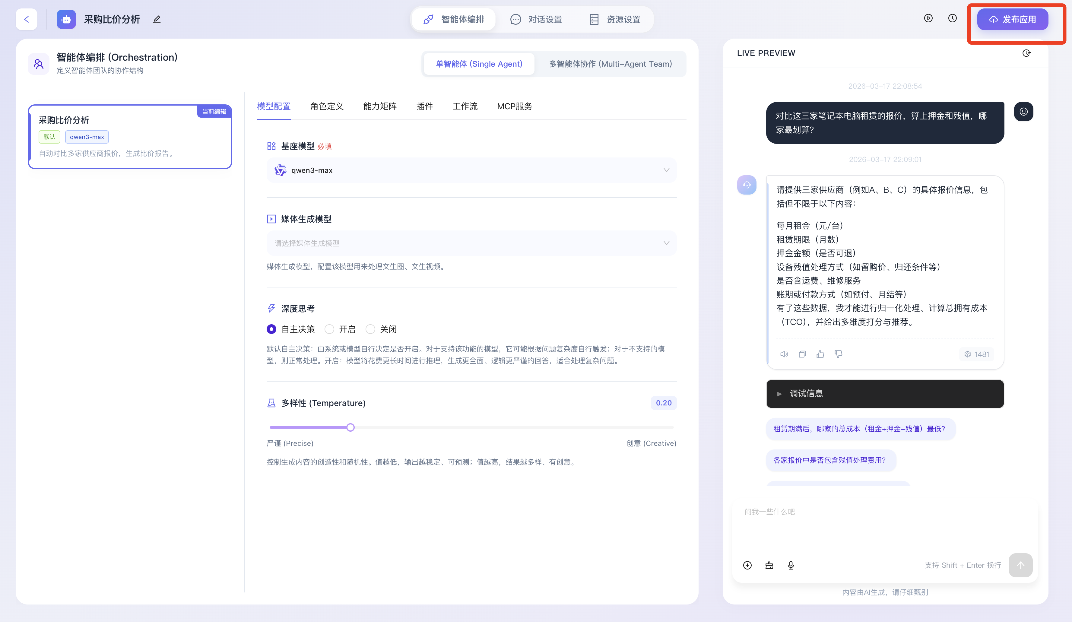 今天,我们将以一个极具代表性的高价值场景——“采购比价分析智能体(自动对比多家供应商报价,生成比价报告)”为例,深度剖析钉钉OA在接入NebulaAI智能体应用后,是如何直击企业痛点,引发办公场景的化学反应,并为企业带来颠覆性效能跃升的。