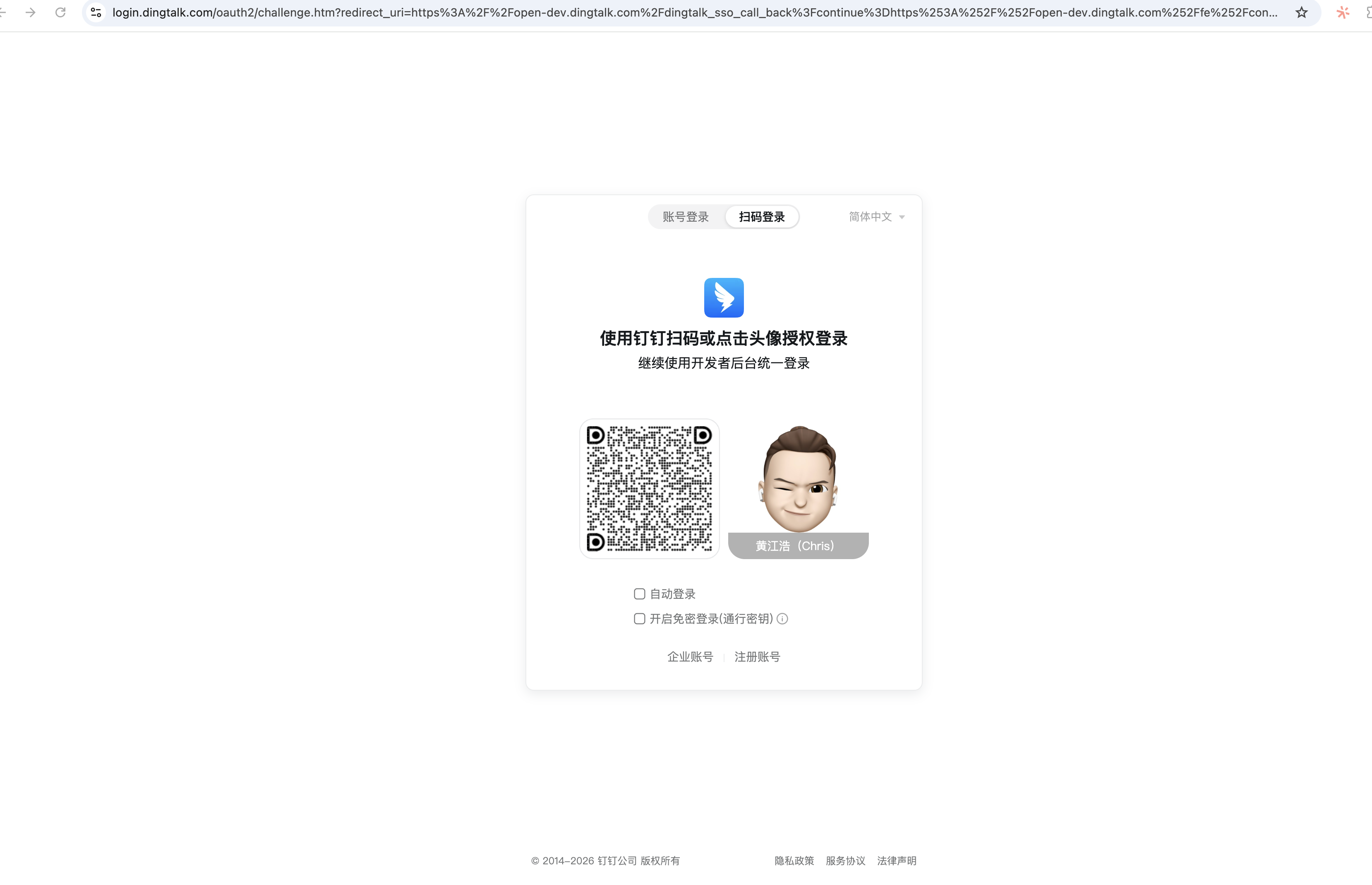 进入钉钉后台管理(https://open-dev.dingtalk.com/fe/connector?hash=%23%2FmyFlow#/myFlow),选择扫码或者使用已登录的账号进行登录