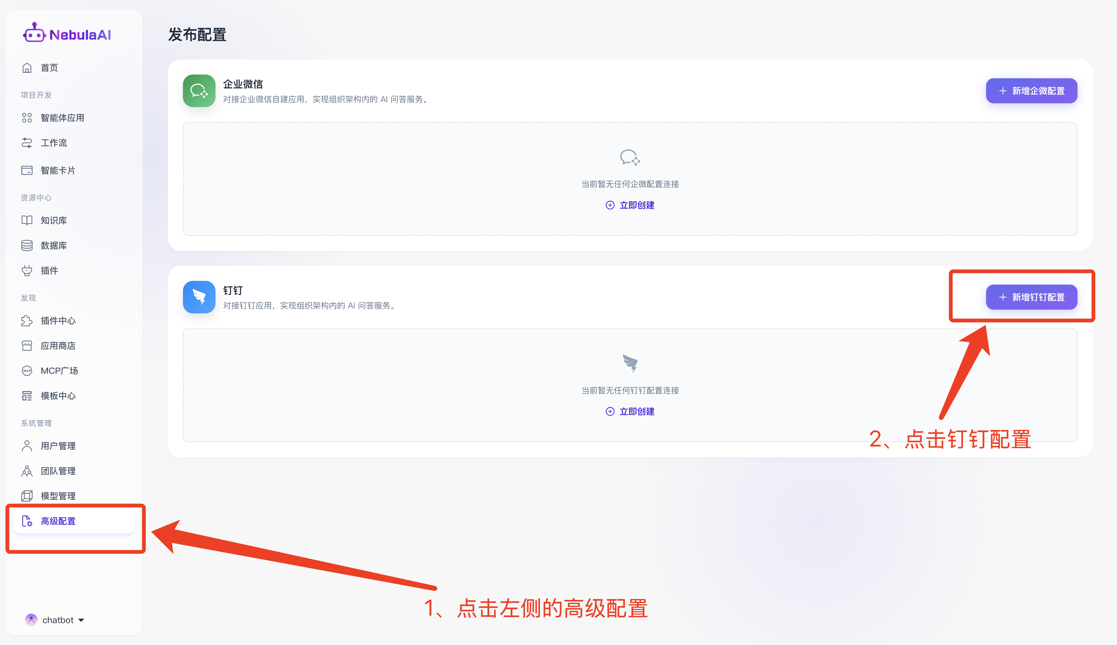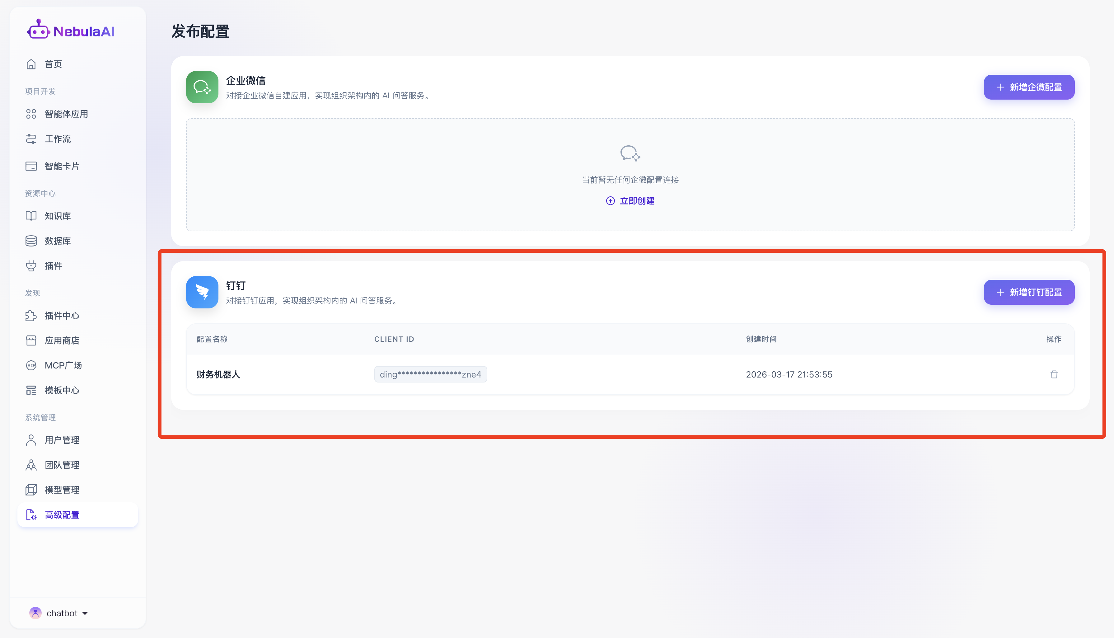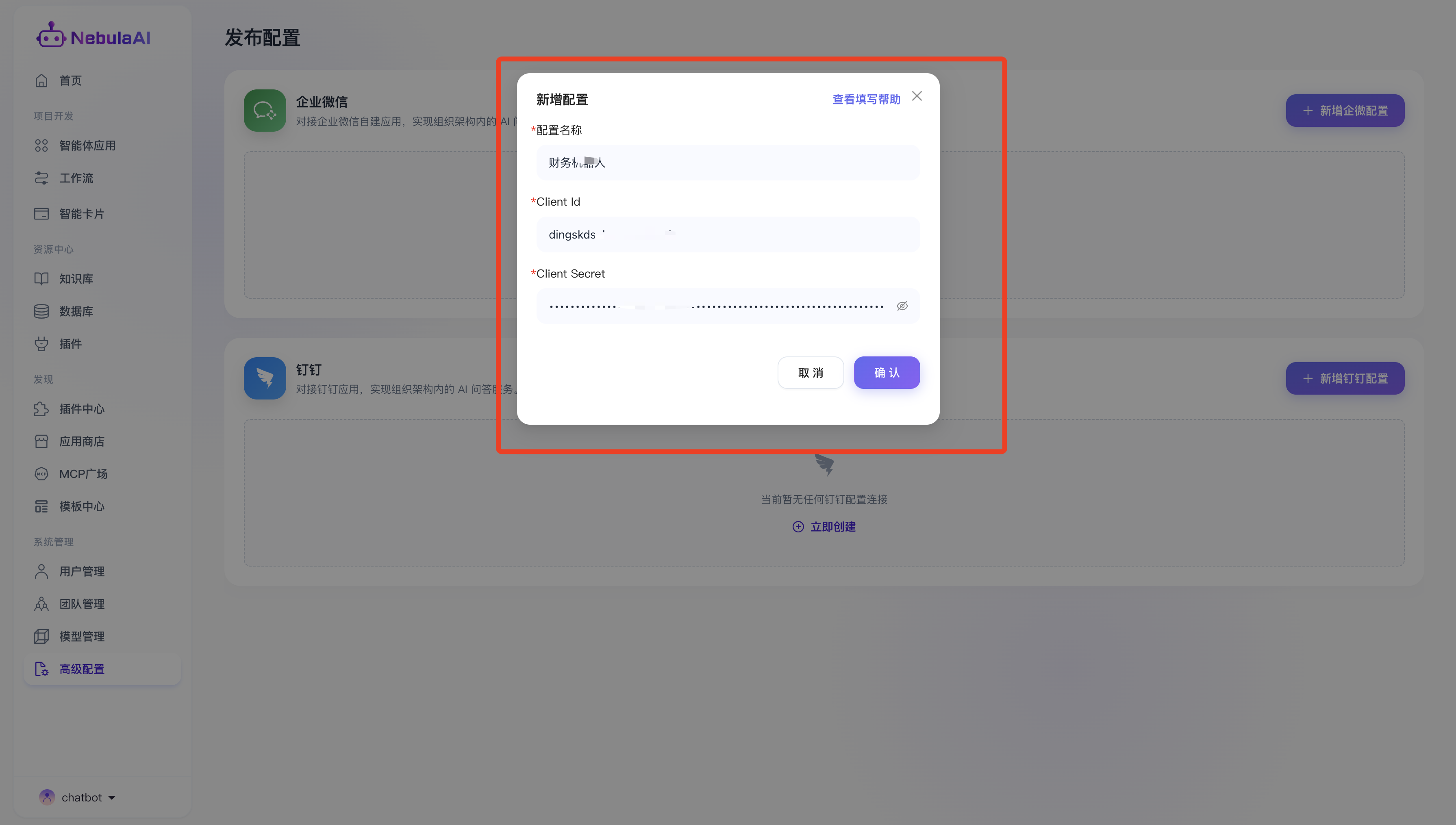 5.7 回到NebulaAI平台中,点击菜单栏左侧的高级配置,点击钉钉的配置按钮