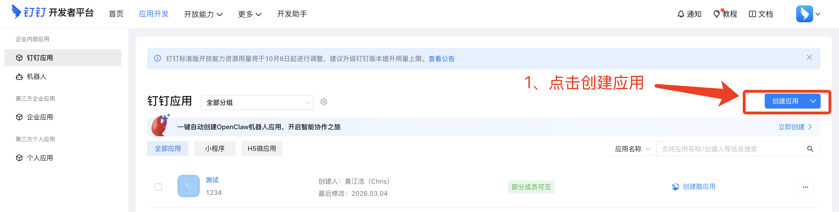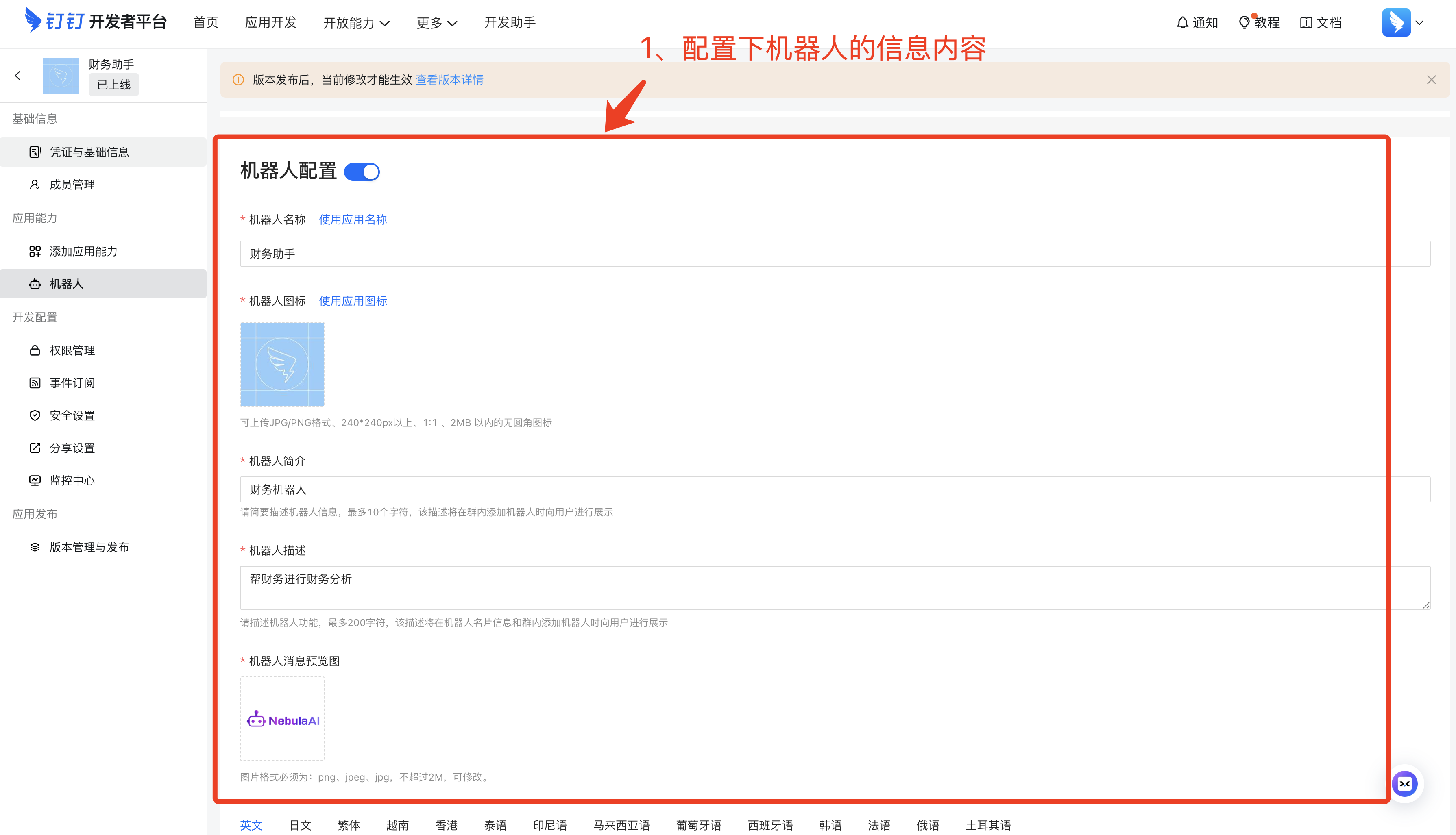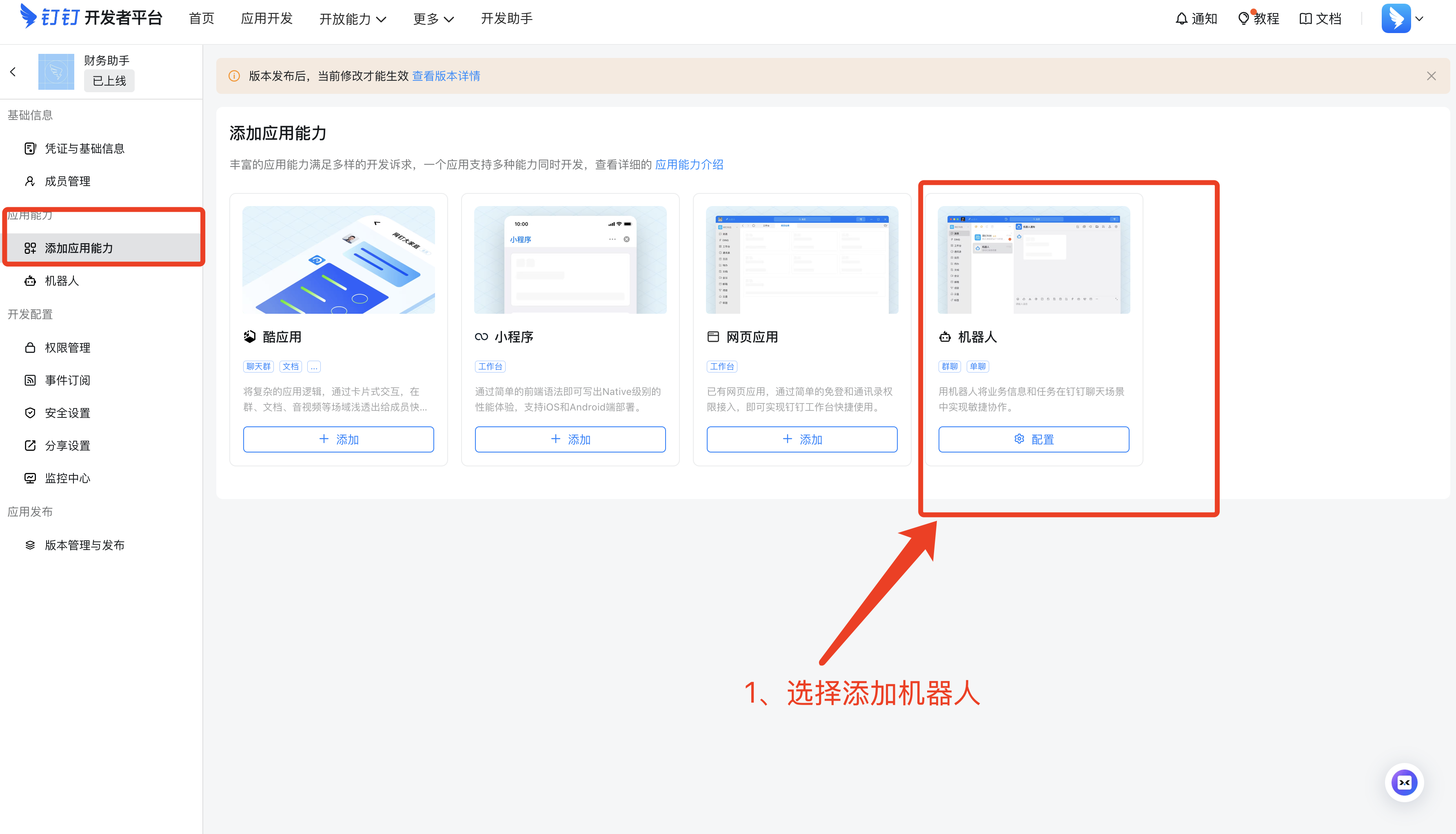 5.9 在左侧菜单的应用能力中,点击添加应用能力,右侧选择添加机器人