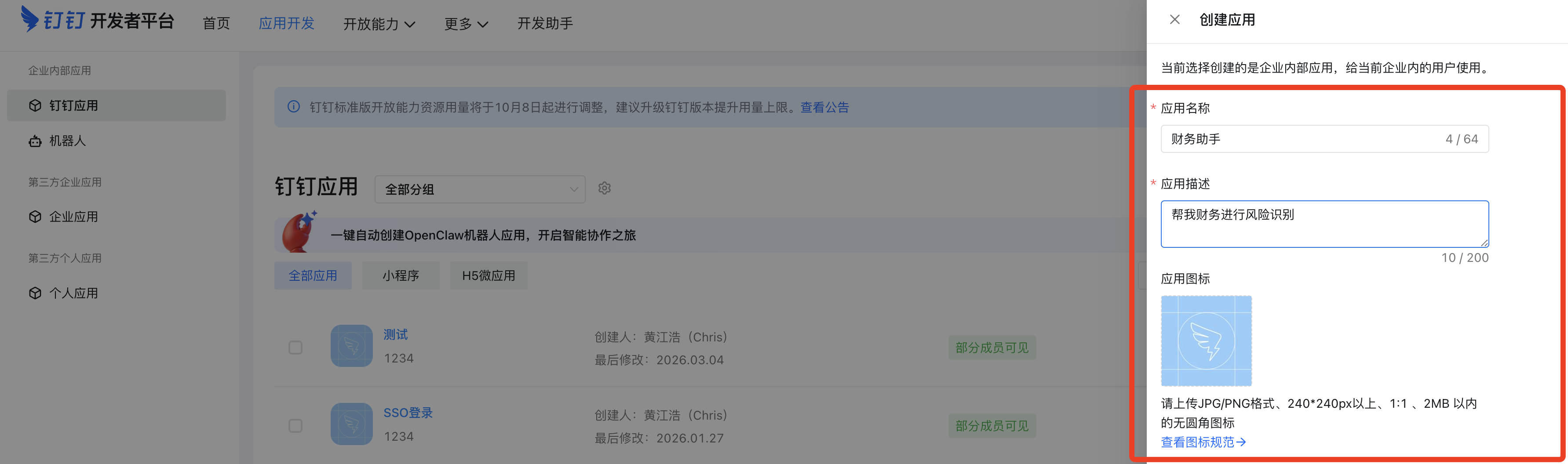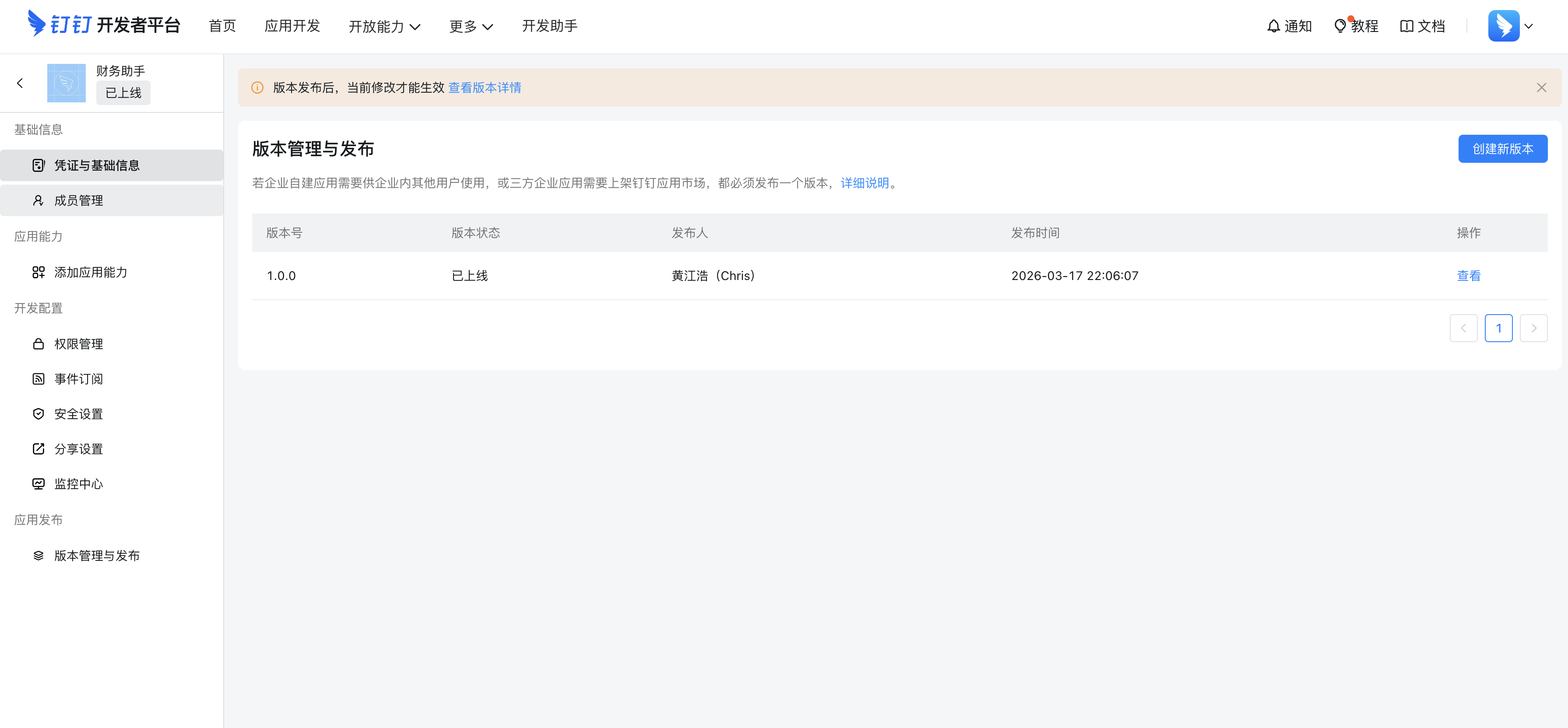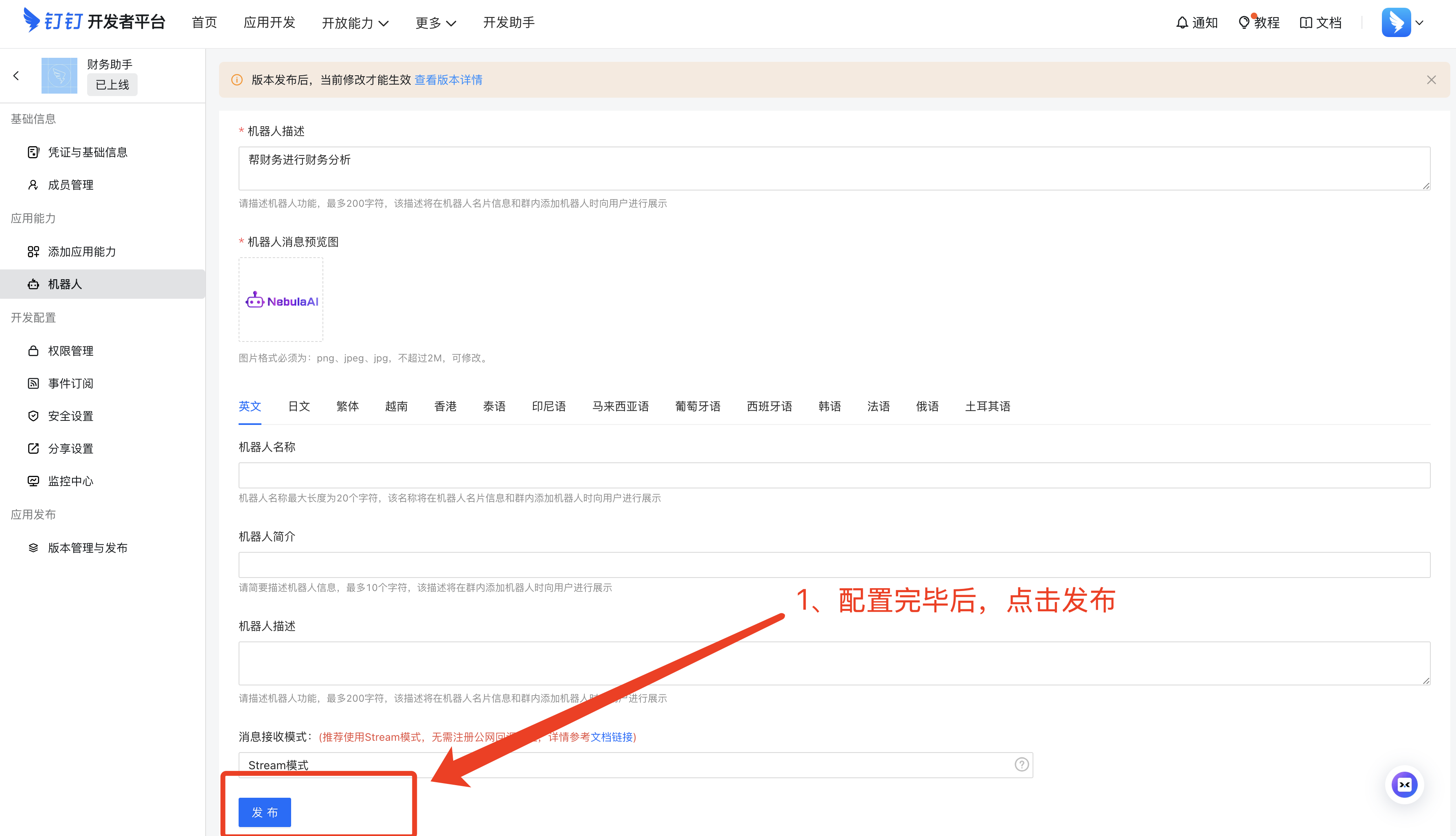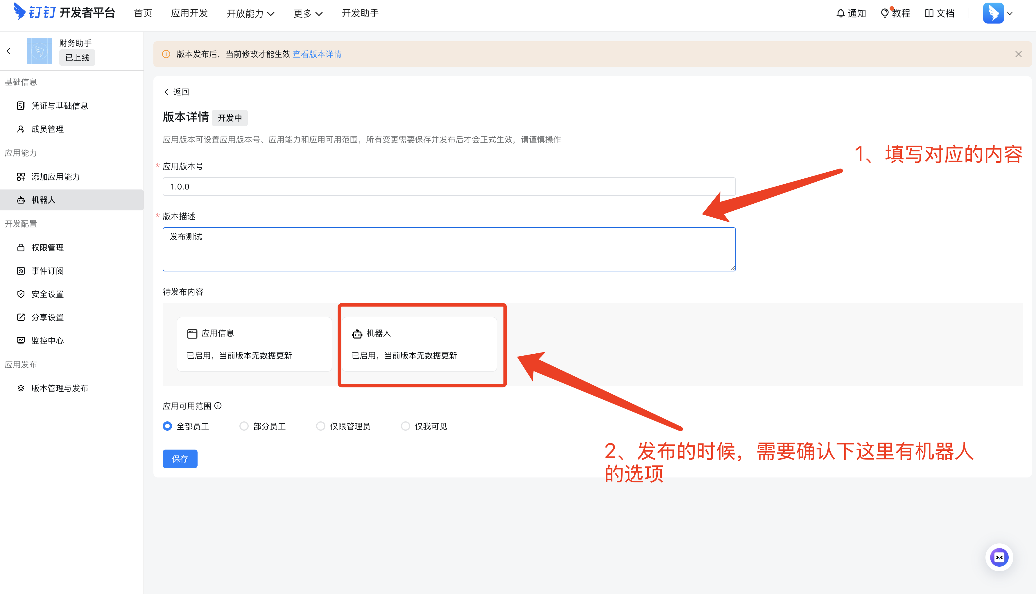发布渠道可以勾选钉钉,并选择我们要关联的应用(如财务机器人),点击发布