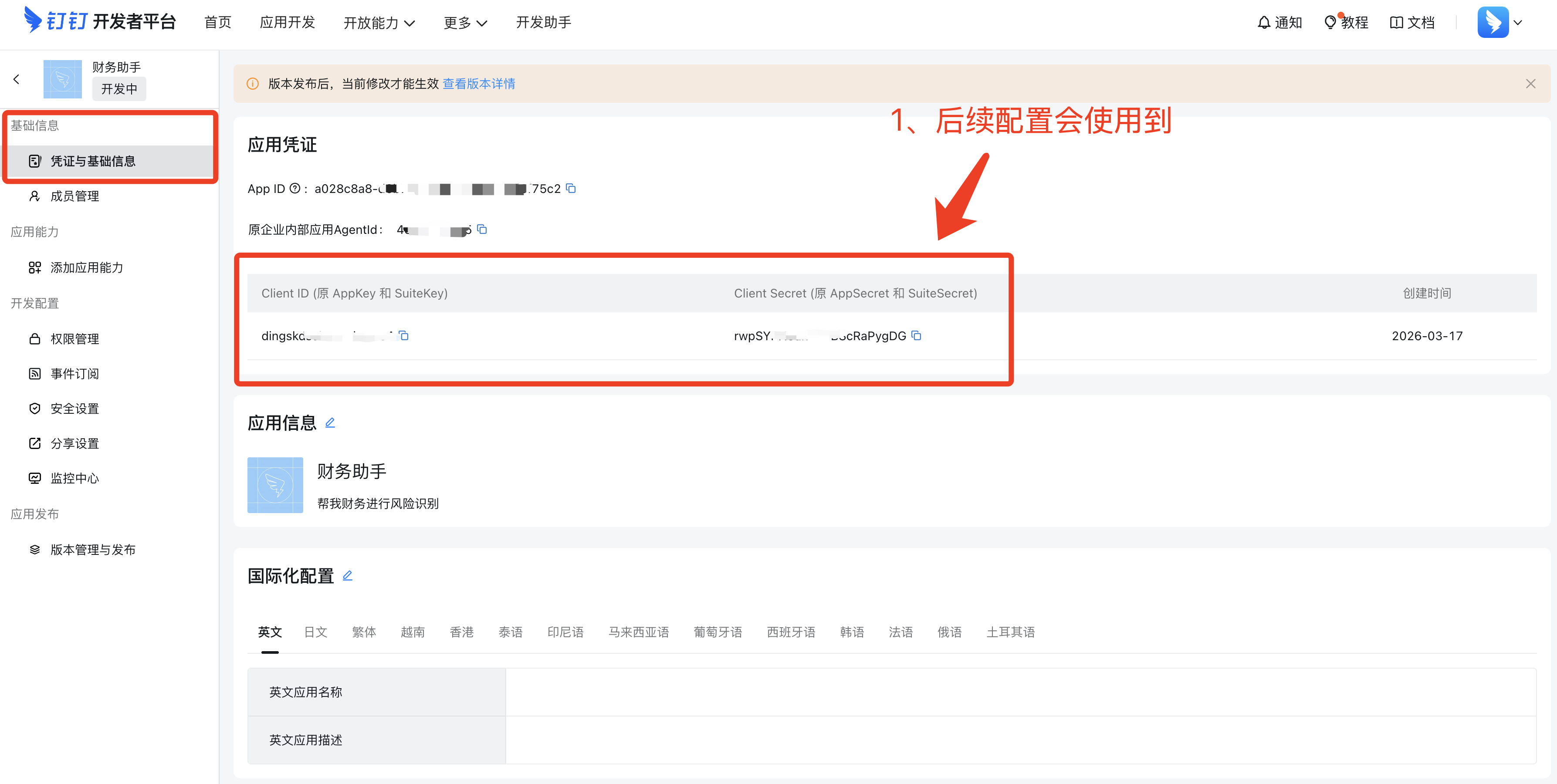 5.6 创建成功后,在左侧的凭证与基础信息,会看到这个机器人的应用凭证信息,后续可以配置到NebulaAI的平台中