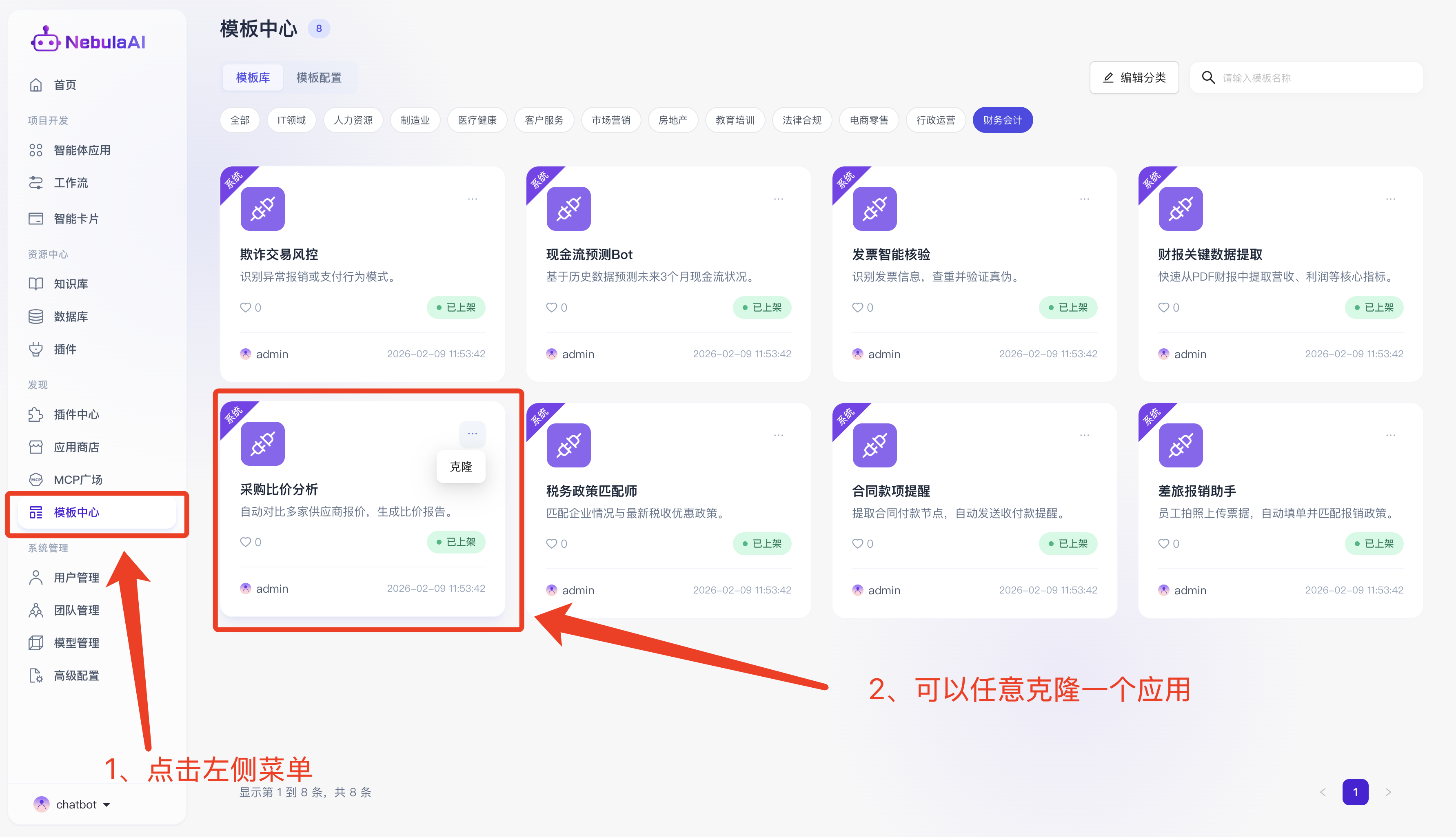 5.13 回到NebulaAI平台中,我们可以从模板中心克隆一个应用