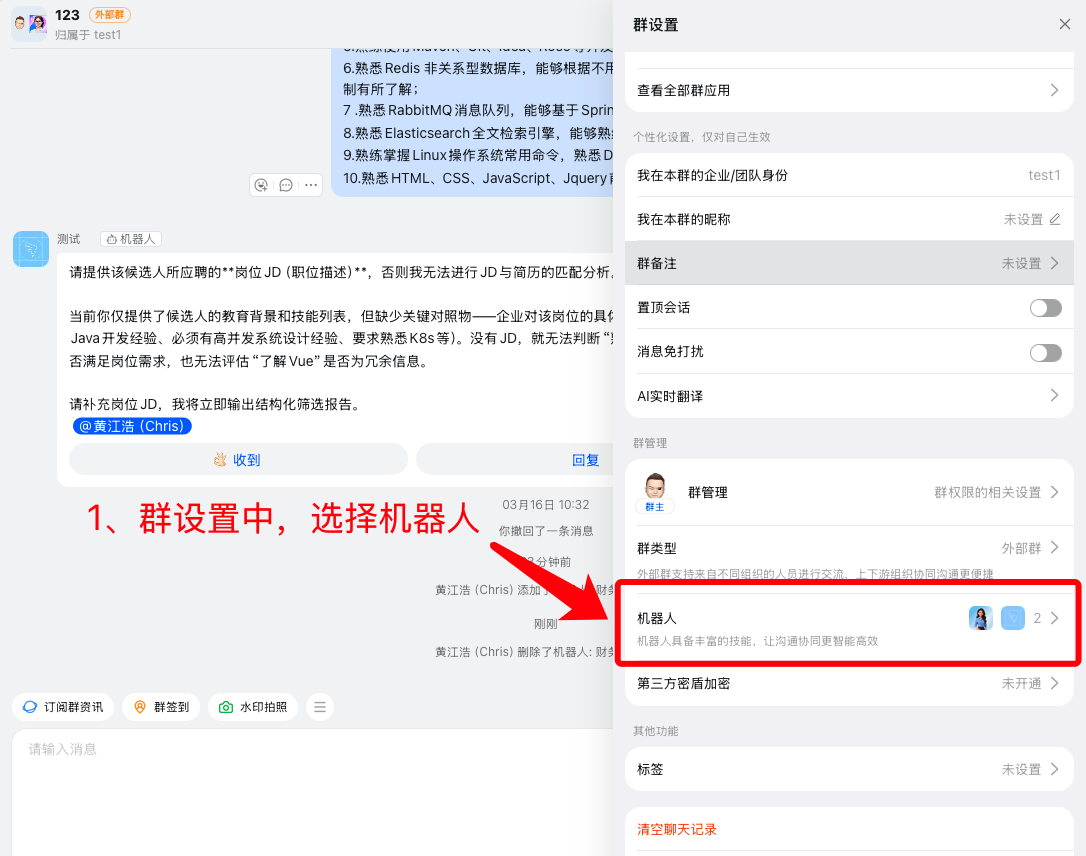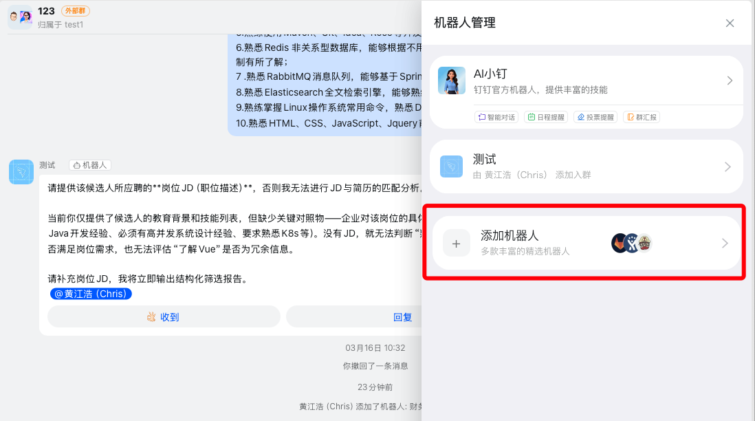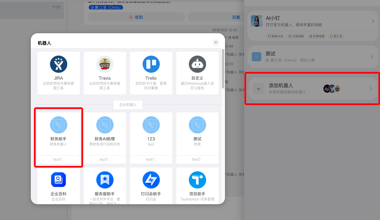 5.16 回到钉钉的界面中,可以任意创建一个群,在群设置中,选择一个机器人