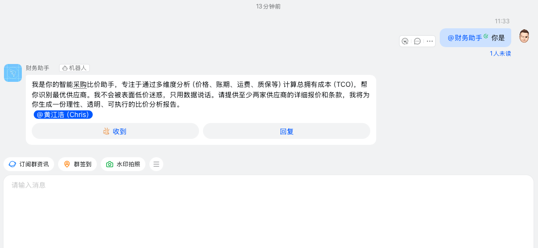 智能体作为中立的第三方“数字员工”进行数据解析与比对,全程留痕,原始数据与比价结果可一一追溯。这从根本上杜绝了人工篡改数据的可能,极大地降低了企业的合规风险,让审批领导敢批、快批,让审计部门省心、放心。