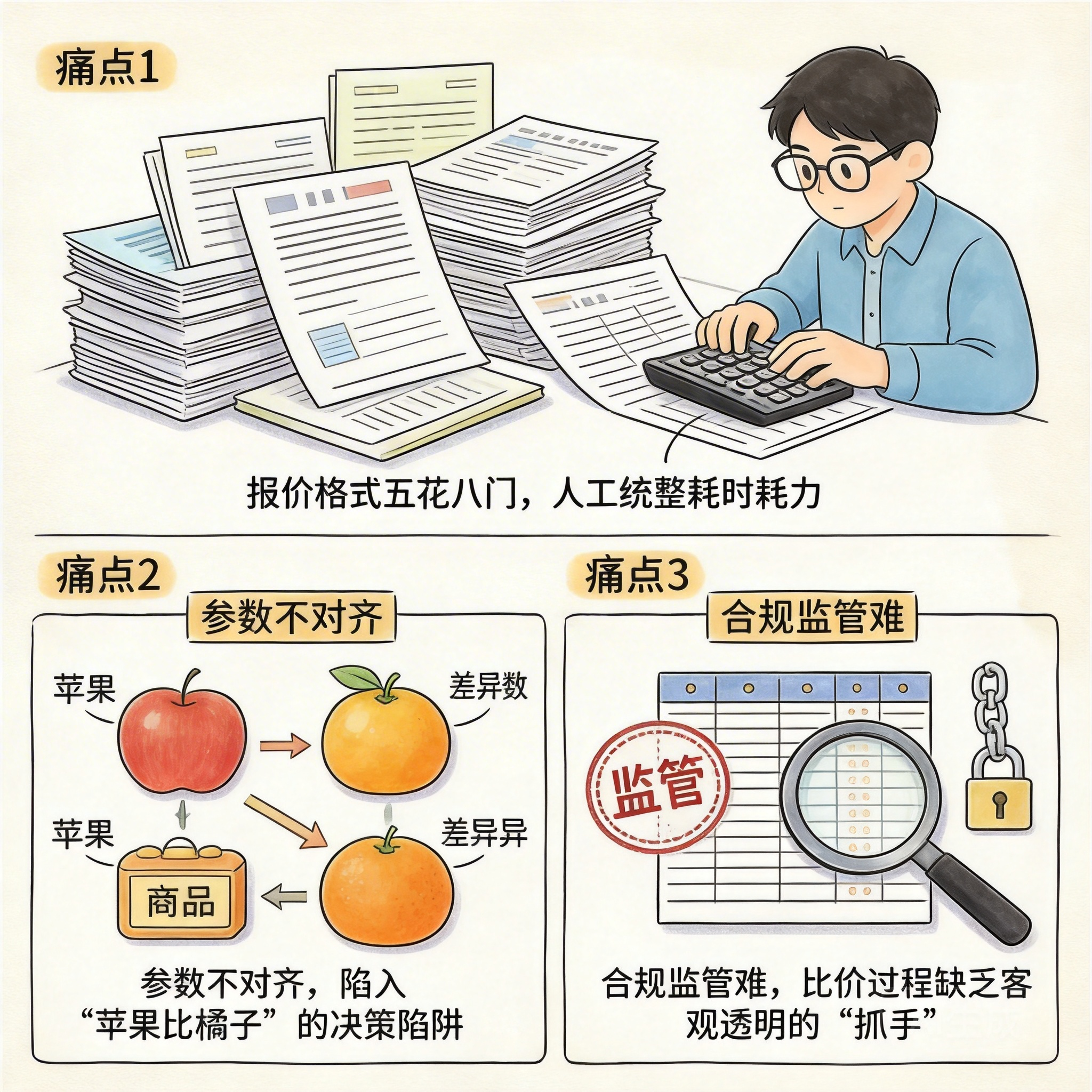 采购部门是企业的“利润守门员”。而在传统的招采比价环节,采购人员和管理层长期饱受以下三大痛点的折磨: