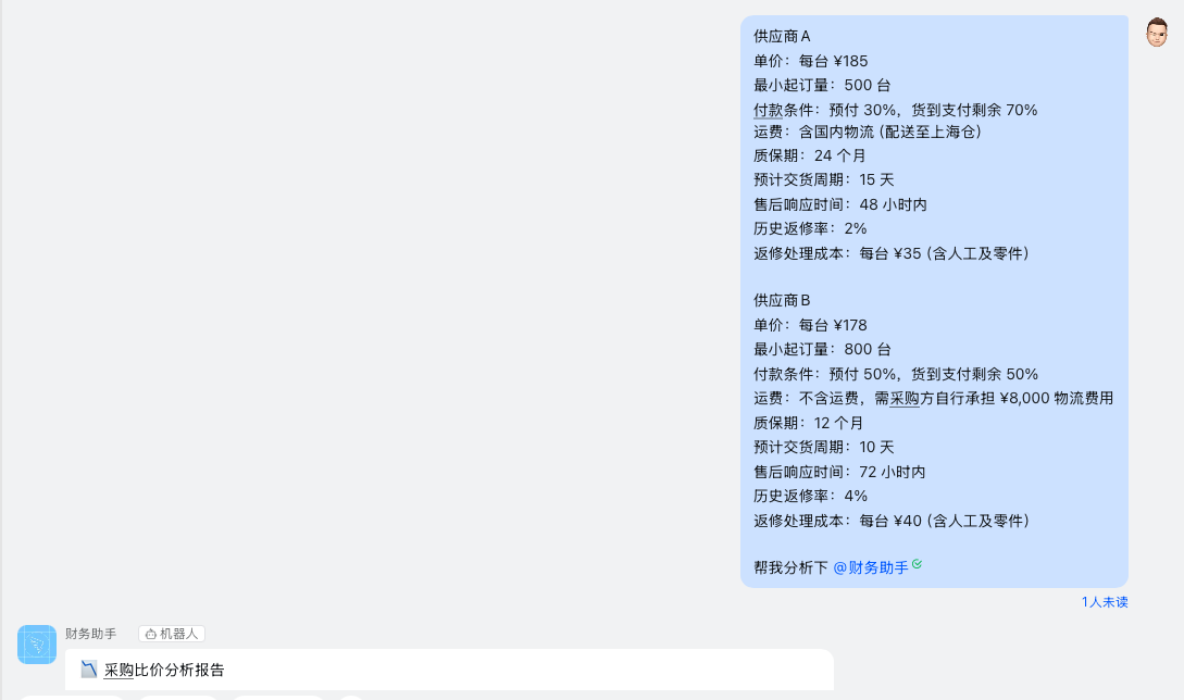 该智能体通过强大的多模态大模型能力,能够自动阅读并解析供应商提交的各类格式附件(PDF、图片、Word、Excel)。它不仅能精准提取所有关键商务与技术条款,还能自动进行参数对齐与单位换算。智能体会将税率、运费、账期等差异项统一折算为可比的综合成本,并在短短几秒钟内,自动生成一份维度清晰、客观严谨的《多维采购比价分析报告》。