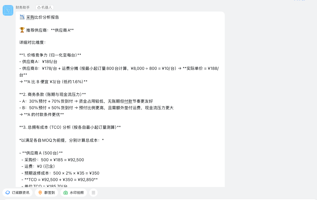 过去采购人员需要耗费半天甚至一天时间去整理一家复杂项目的比价单,现在只需将文件发送给钉钉中的NebulaAI智能体,几秒钟内即可获得一份格式规范、数据详实的深度比价报告。这直接将采购人员从低附加值的“表格/文档”工作中彻底解放出来,将宝贵的时间投入到供应商寻源、价格谈判和供应链战略规划等高阶工作中。 - 从“片面比价”到“全局最优”,提供精准的决策大脑