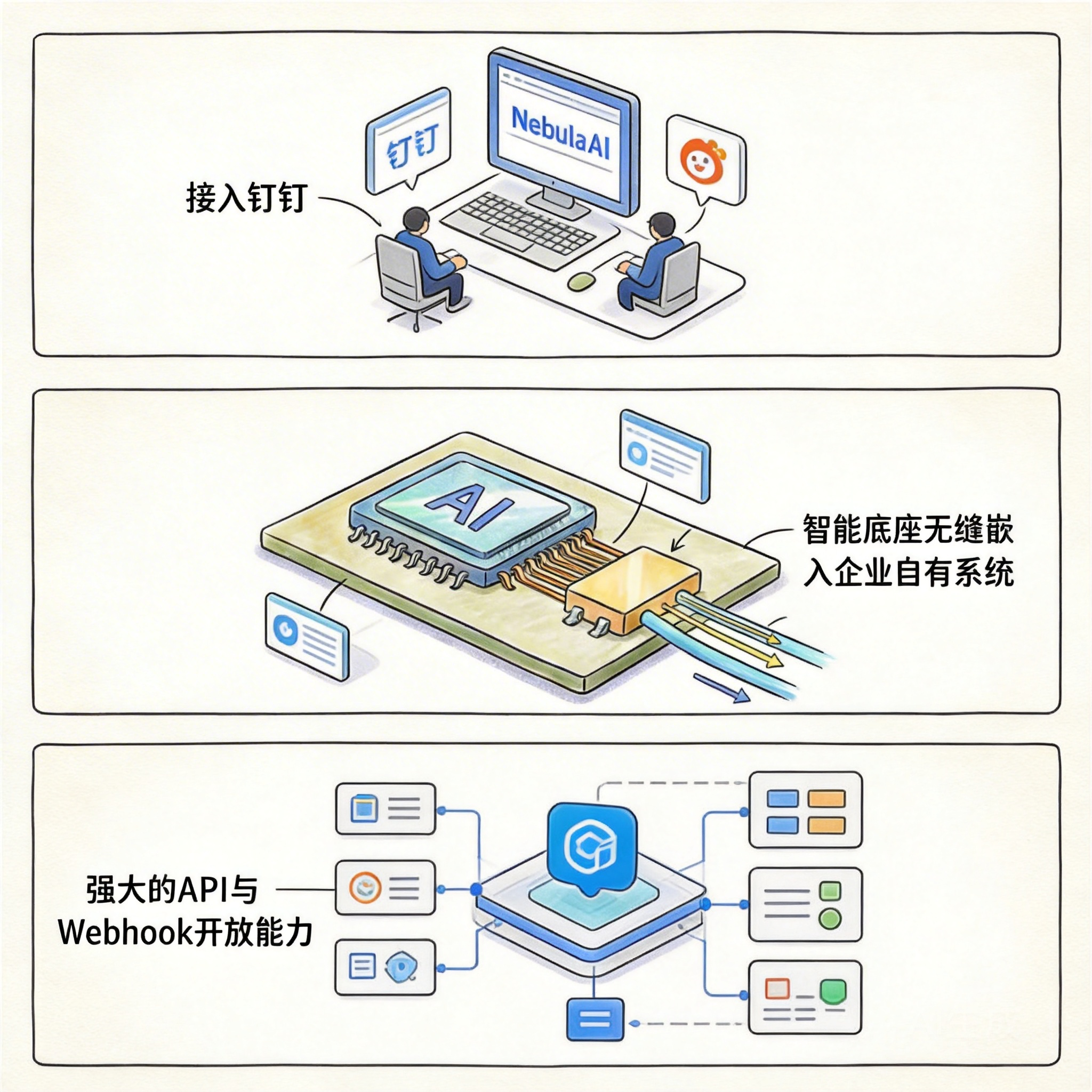 NebulaAI平台具备强大的API与Webhook开放能力。这意味着,它不仅能接入钉钉,更能作为“智能底座(AI Middleware)”无缝嵌入到企业内部的任何自有系统中。
