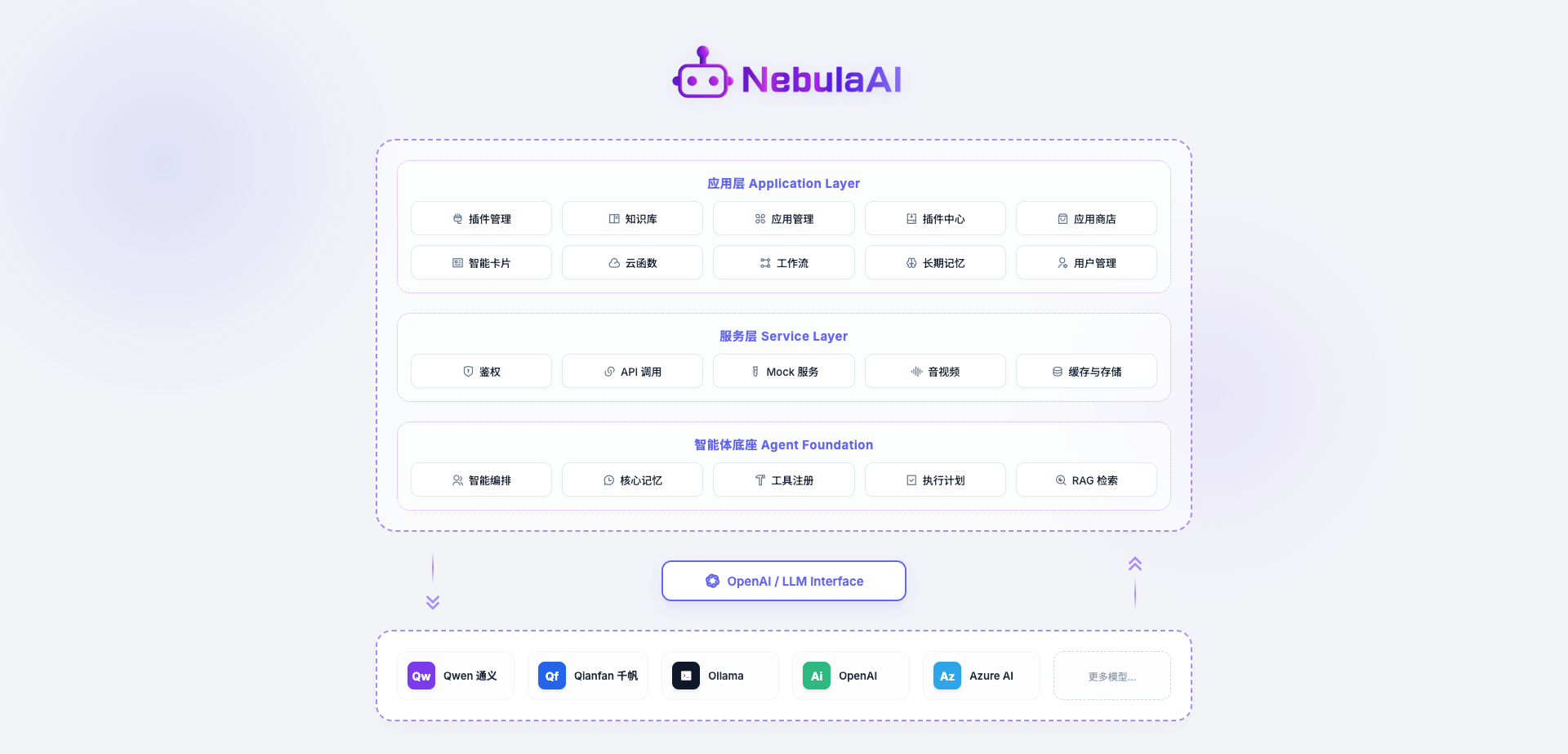 这个架构描述完美契合了 NebulaAI 的图片结构,展现了从底层数据处理、模型推理到上层应用分发的完整技术图谱,既体现了系统的复杂度和专业性,又突出了您选用的技术栈的先进性。